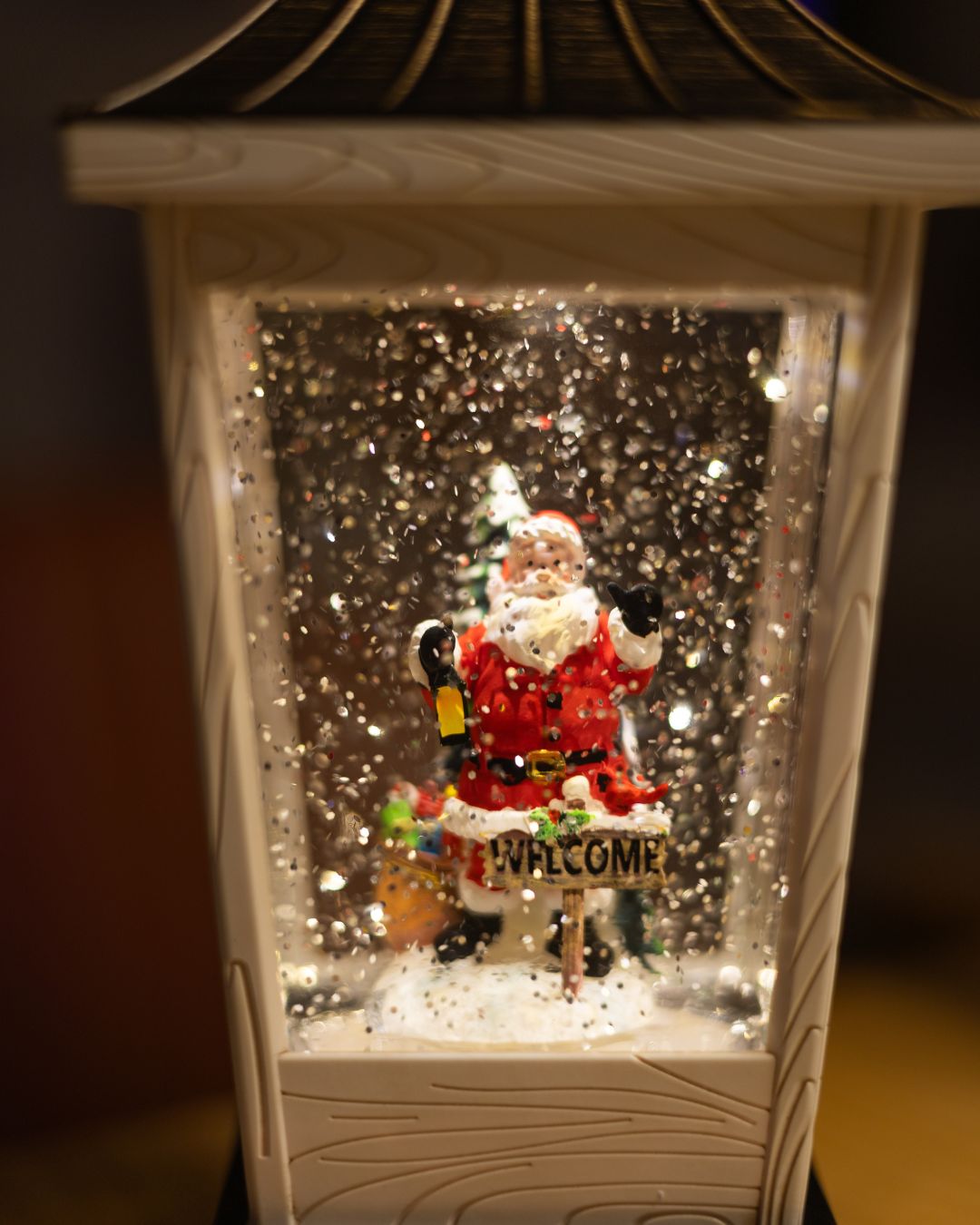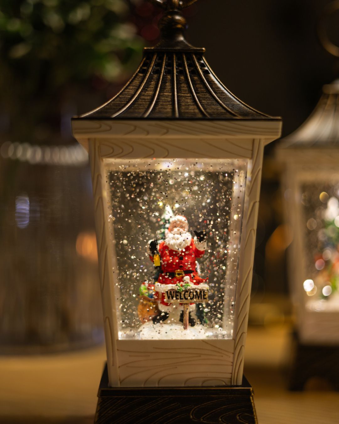 Усміхнений Санта зустрічає гостей з табличкою “Welcome” та теплим ліхтарем в руці, запрошуючи до свята.🎁 Поруч стоїть мішок, наповнений подарунками, а позаду — засніжена ялинка. Сяючий сніг навколо виблискує, створюючи атмосферу дива й очікування свята.