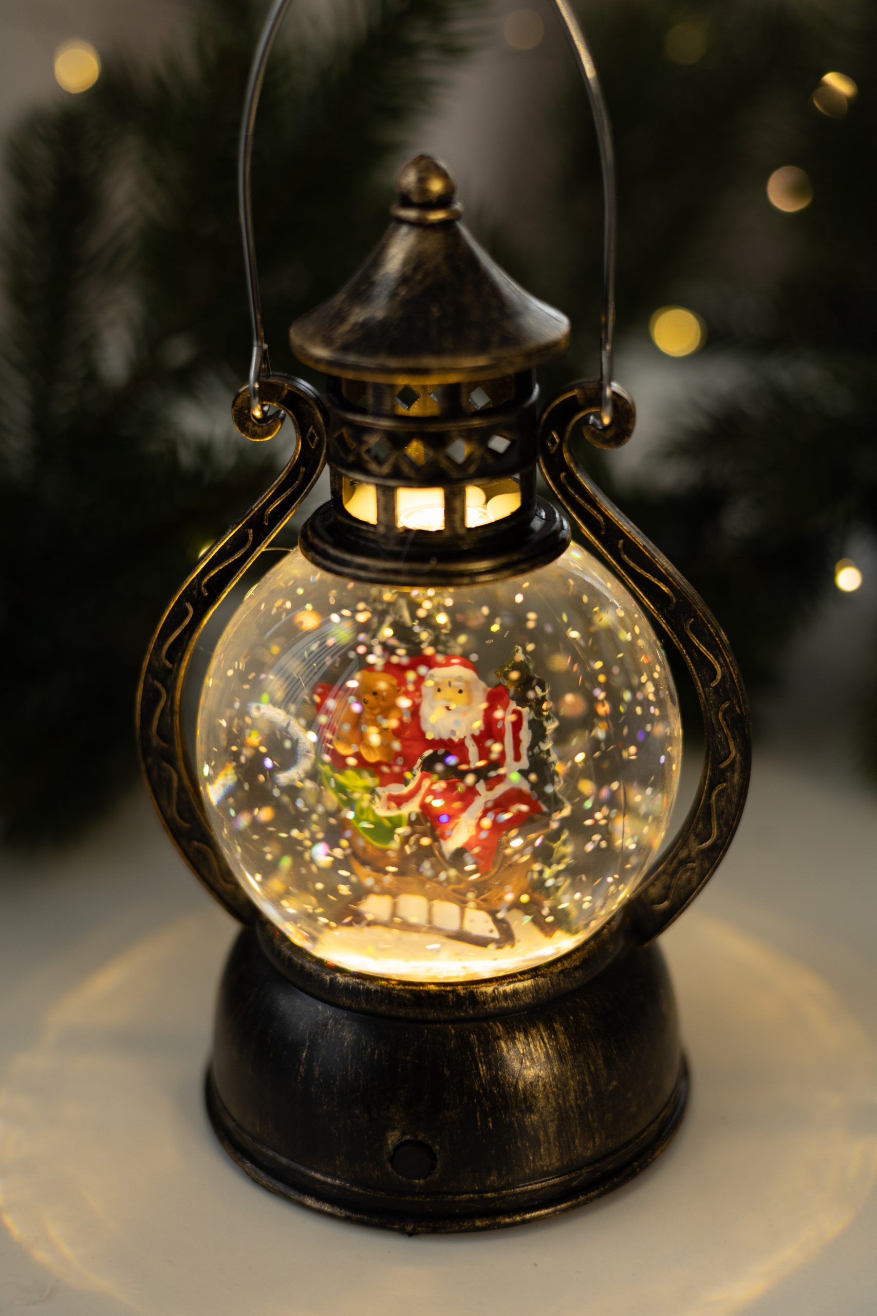 Гасова лампа має чарівний сюжет: Санта з великим мішком подарунків і милим ведмедиком мчить на санях крізь сніжну завірюху, поспішаючи доставити свято у кожен дім. 🎁 На фоні — дві засніжені ялинки, що створює атмосферу затишку, радості й очікування різдвяного дива.