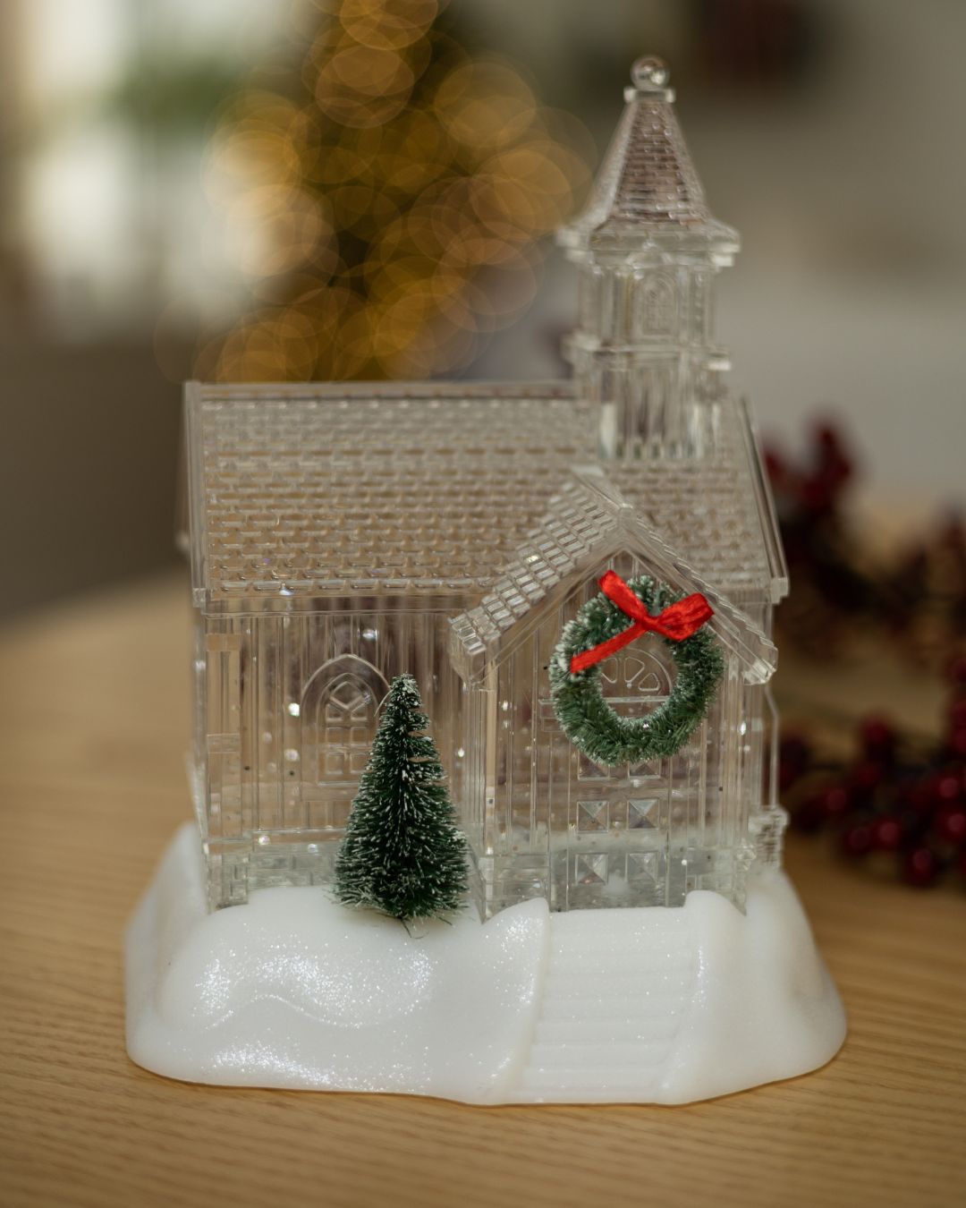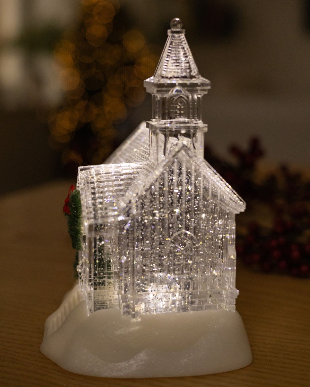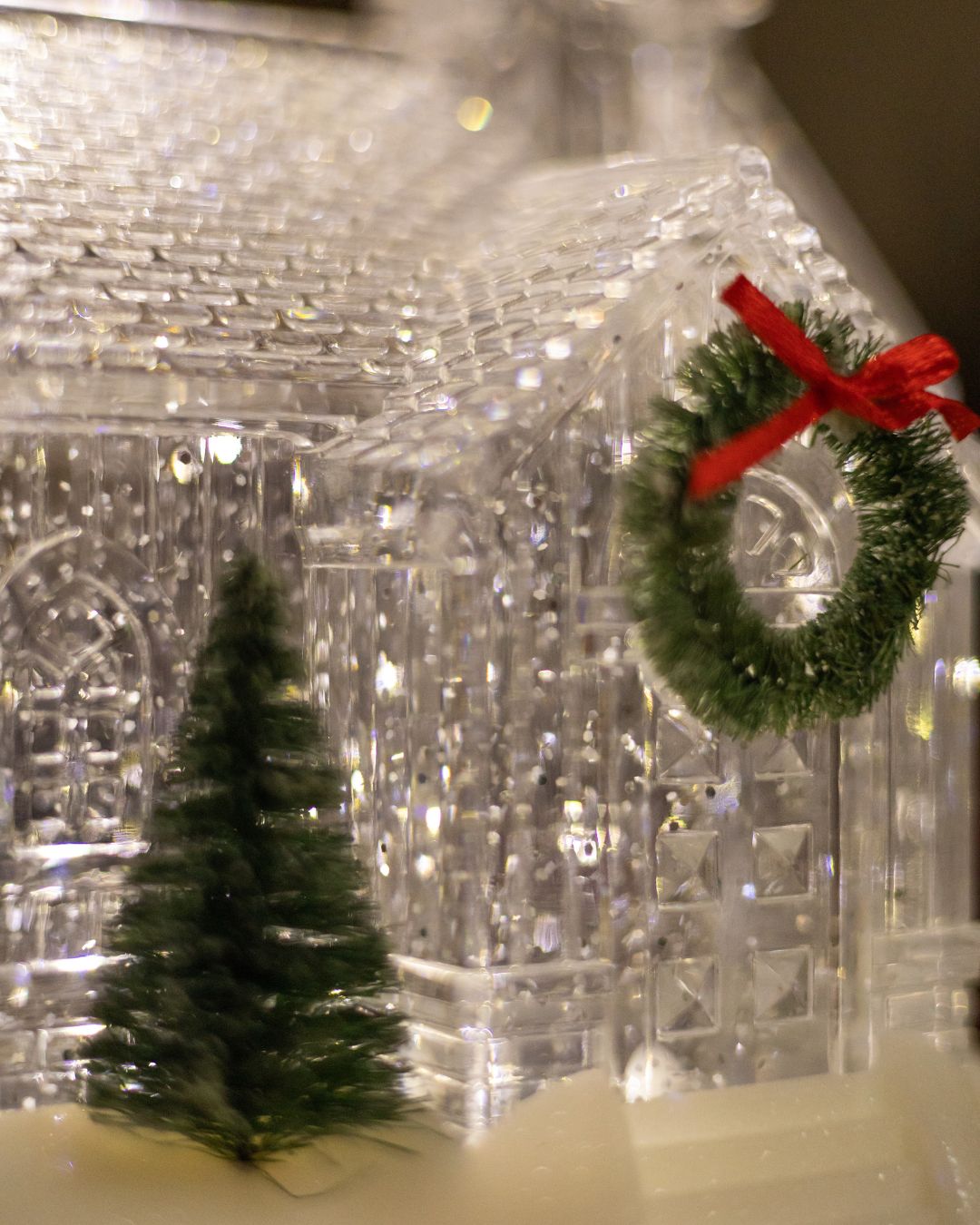 💫 Ліхтар зачаровує своїм прозорим білим, немов кришталевим, дизайном. Його витончені лінії нагадують сяючий палац зі снігу, ніби перенесений із різдвяної казки. На вході красується зелений вінок із червоною стрічкою, а поруч стоїть ялинка🎄, що додає святкового настрою. М’яка тепла підсвітка наповнює будиночок ніжним сяйвом, створюючи атмосферу спокою, затишку та зимової гармонії.