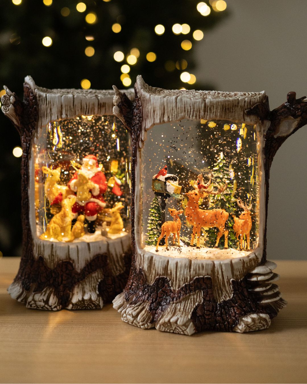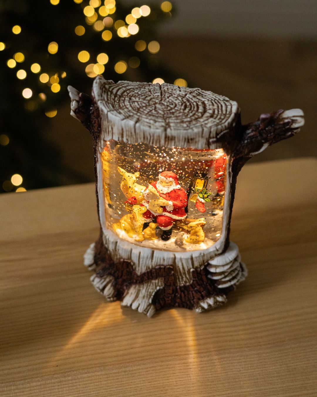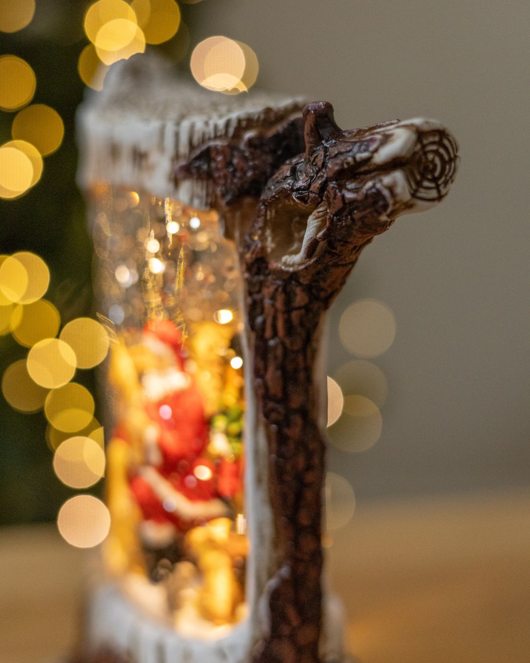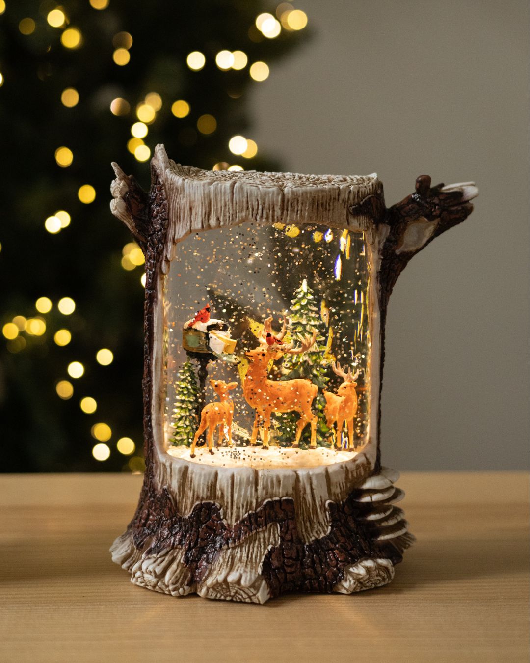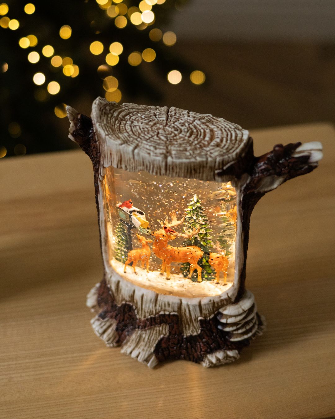 ✨ Новорічний ліхтар “Лісова казка” вражає своєю реалістичністю та затишною атмосферою. Дизайн ліхтаря виконаний у біло-коричневих тонах і максимально нагадує справжній дерев’яний пеньок, з гілочками, що органічно виходять з нього, створюючи відчуття зимового лісу. Усередині ліхтар оживають казкові сцени, що наповнює простір теплом і святковим настроєм.