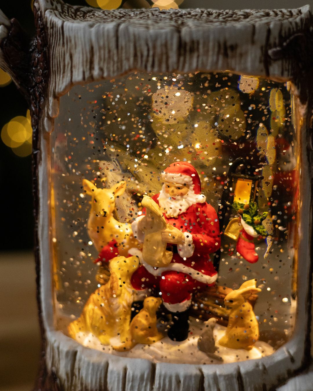 Санта сидить на пеньку і уважно читає список подарунків для своїх лісових друзів: оленя, песика, зайчиків та білочки. Поруч — теплий вуличний ліхтар з різдвяним чобітком, що додають сцені затишку і святкової магії.