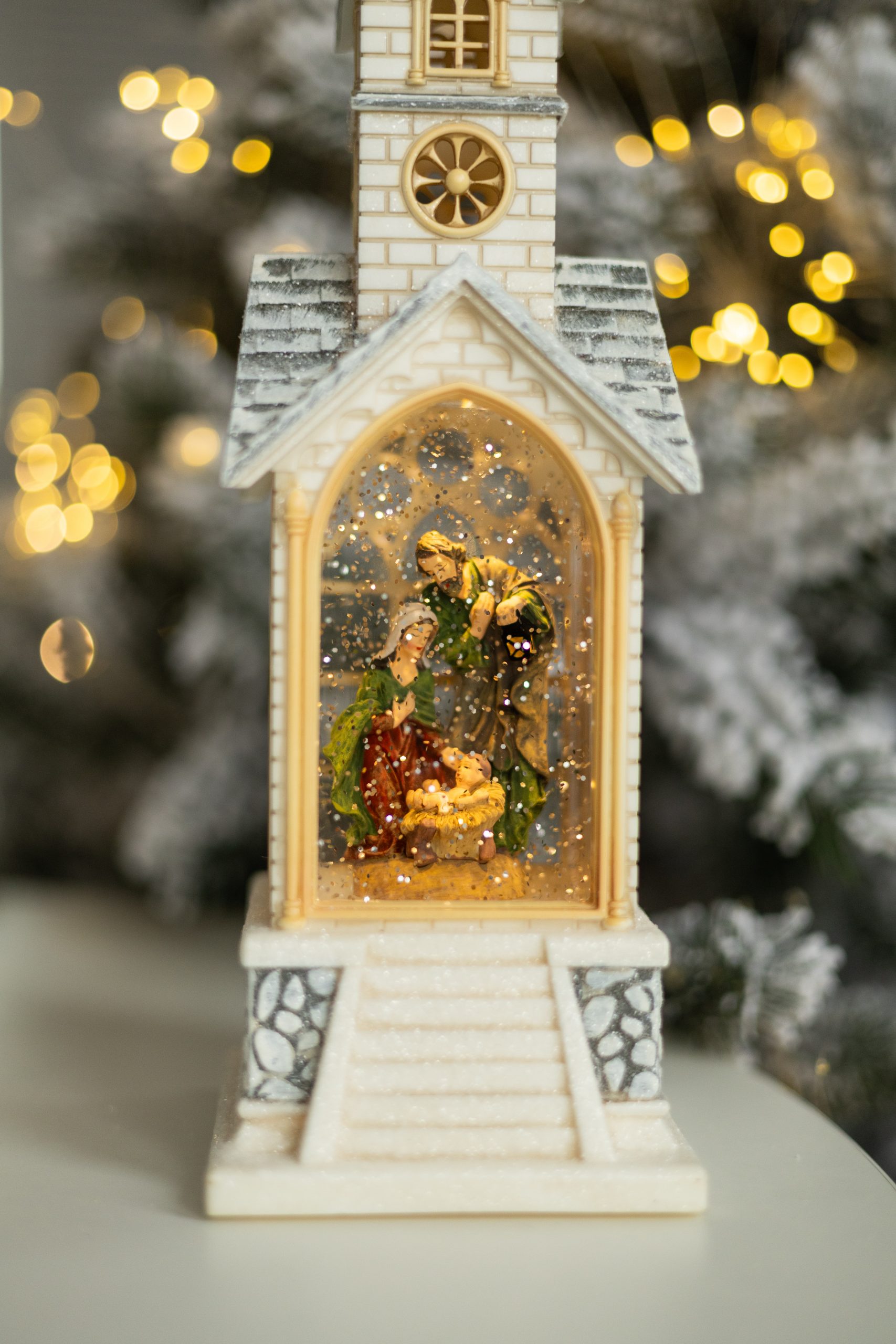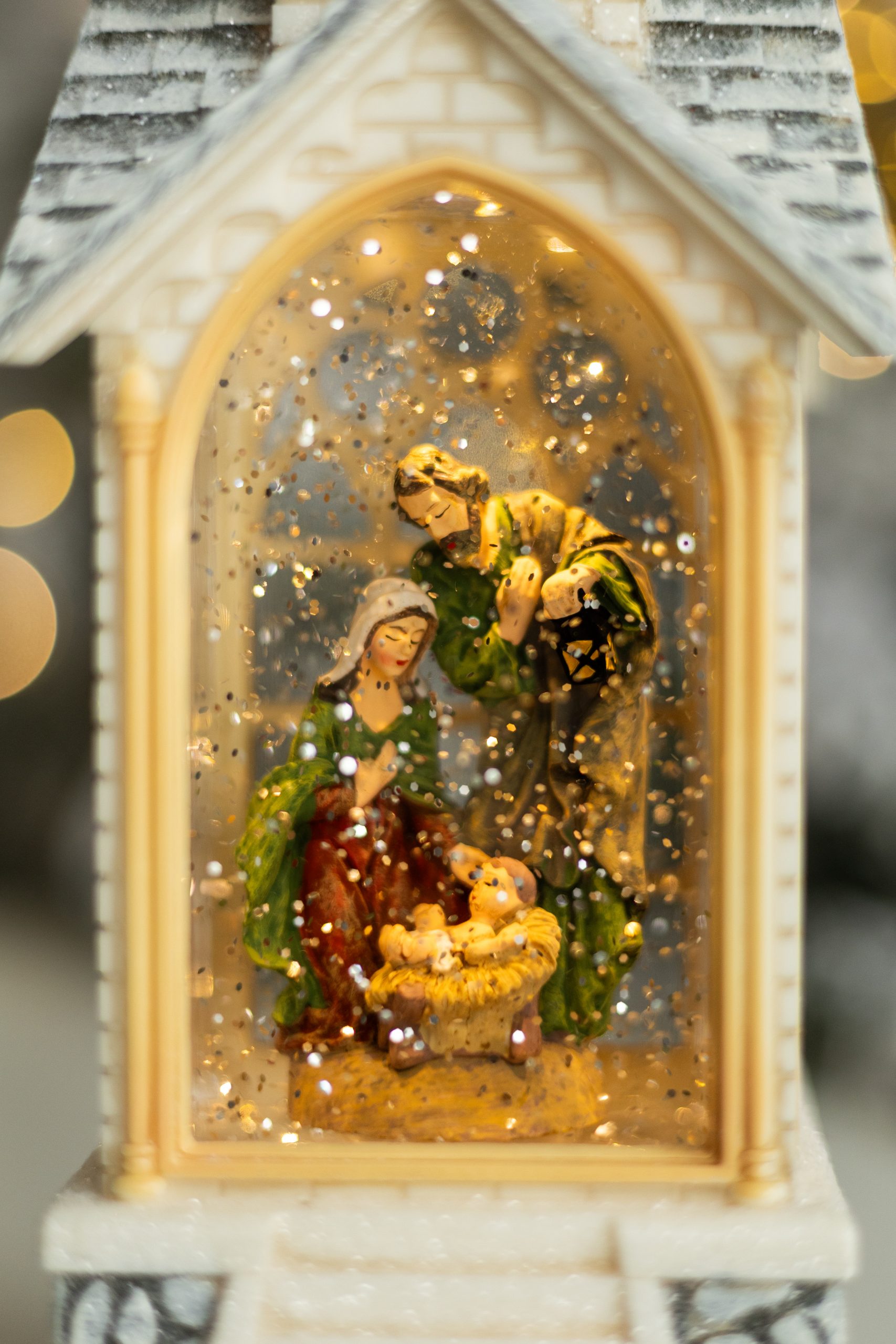 🌟🎄 Усередині розгортається ніжна різдвяна сцена. Тут зображено народження Христа: Діва Марія біля маленького Ісуса, що лежить на сіні, а поруч стоїть Йосип — чоловік, який оберігає Святу родину. Здається, ніби годинник на вежі саме б’є північ, сповіщаючи про настання Різдва, а всередині в цю мить оживає справжнє диво — довгоочікуване світле свято ✨🎄