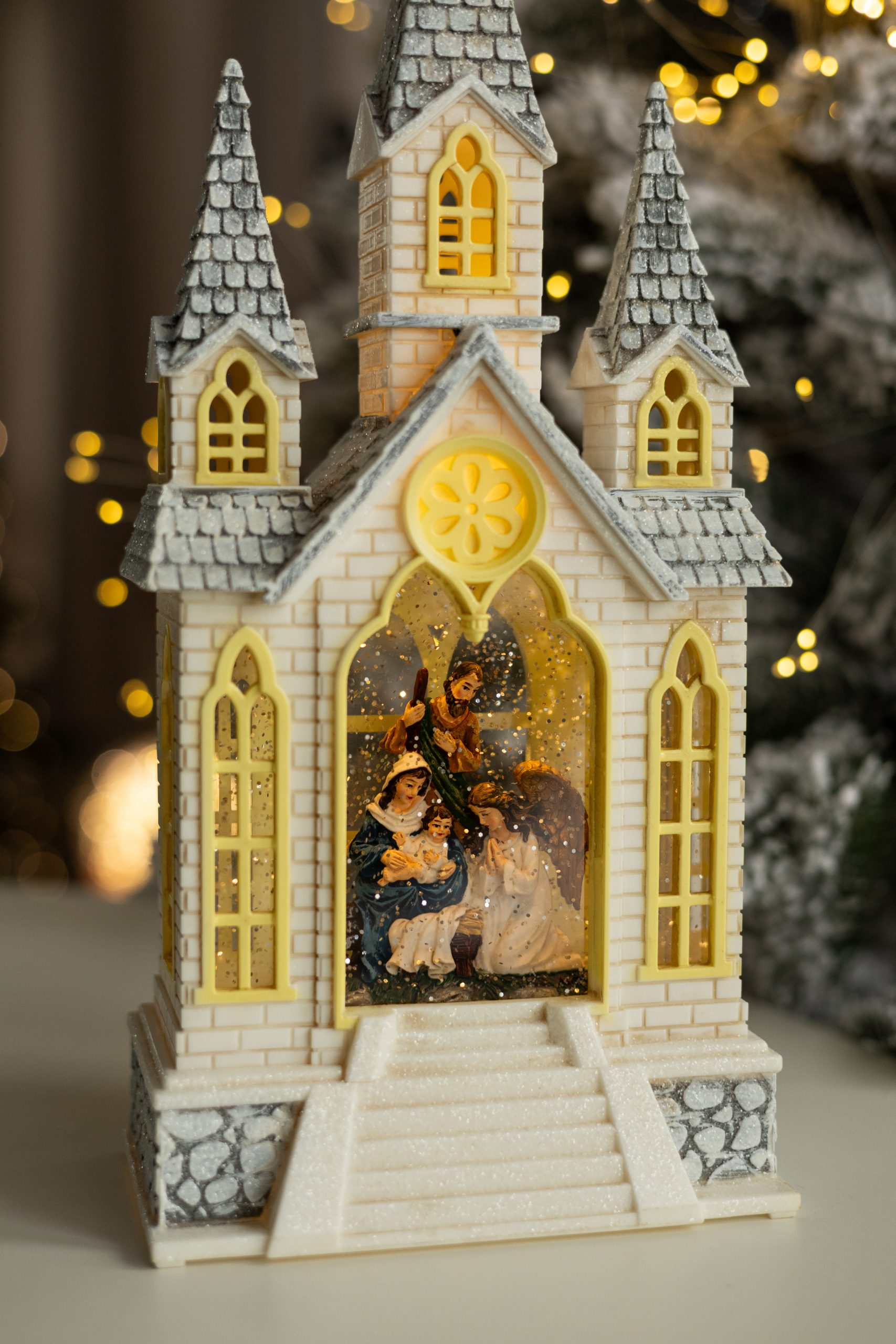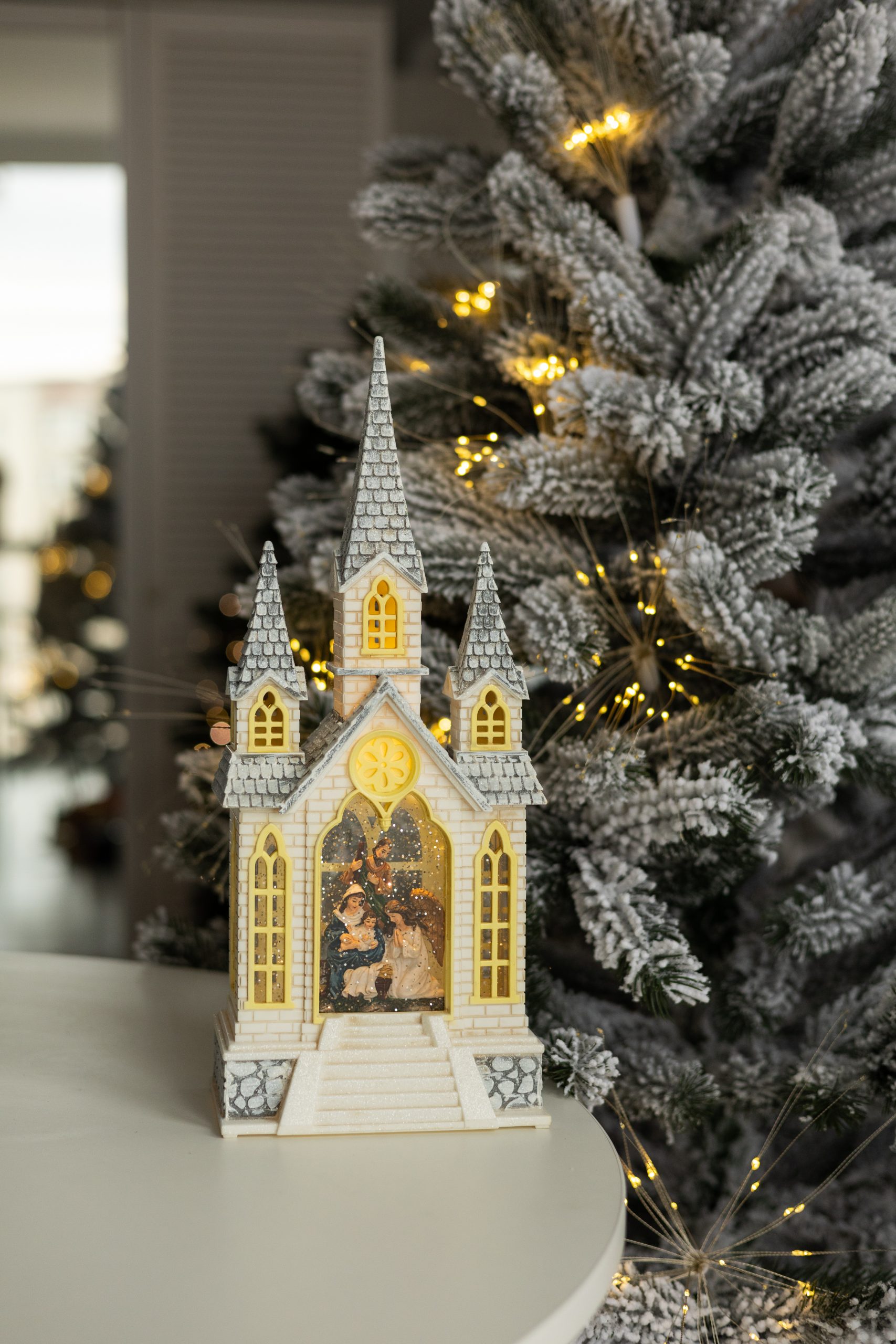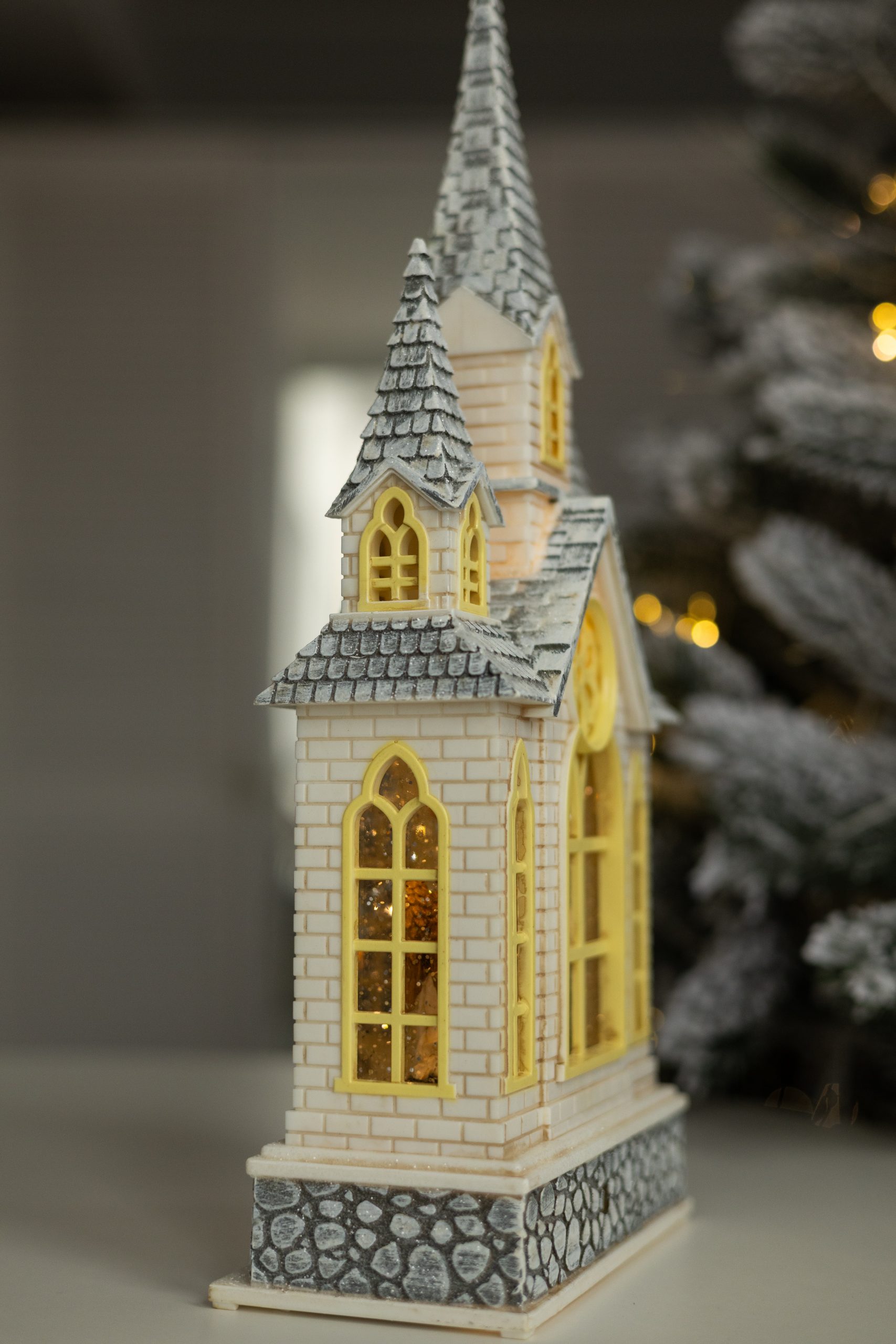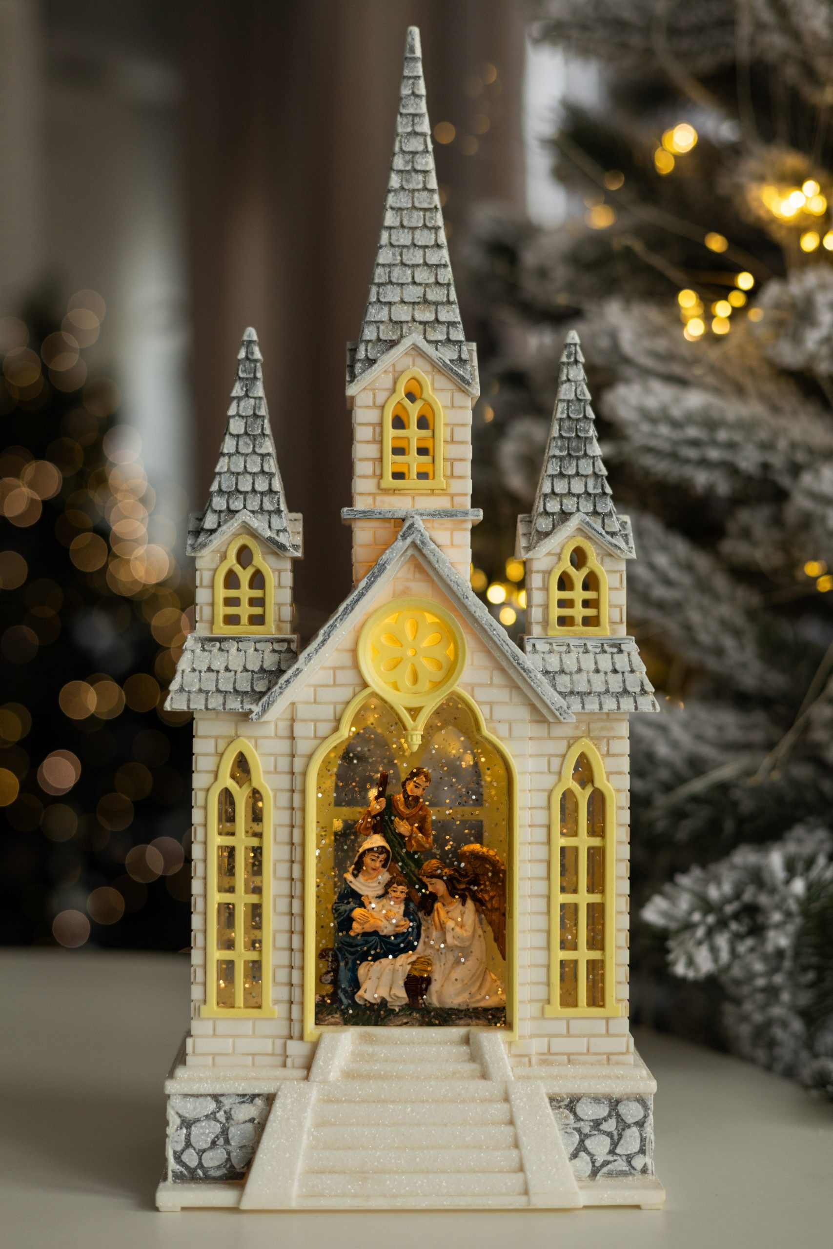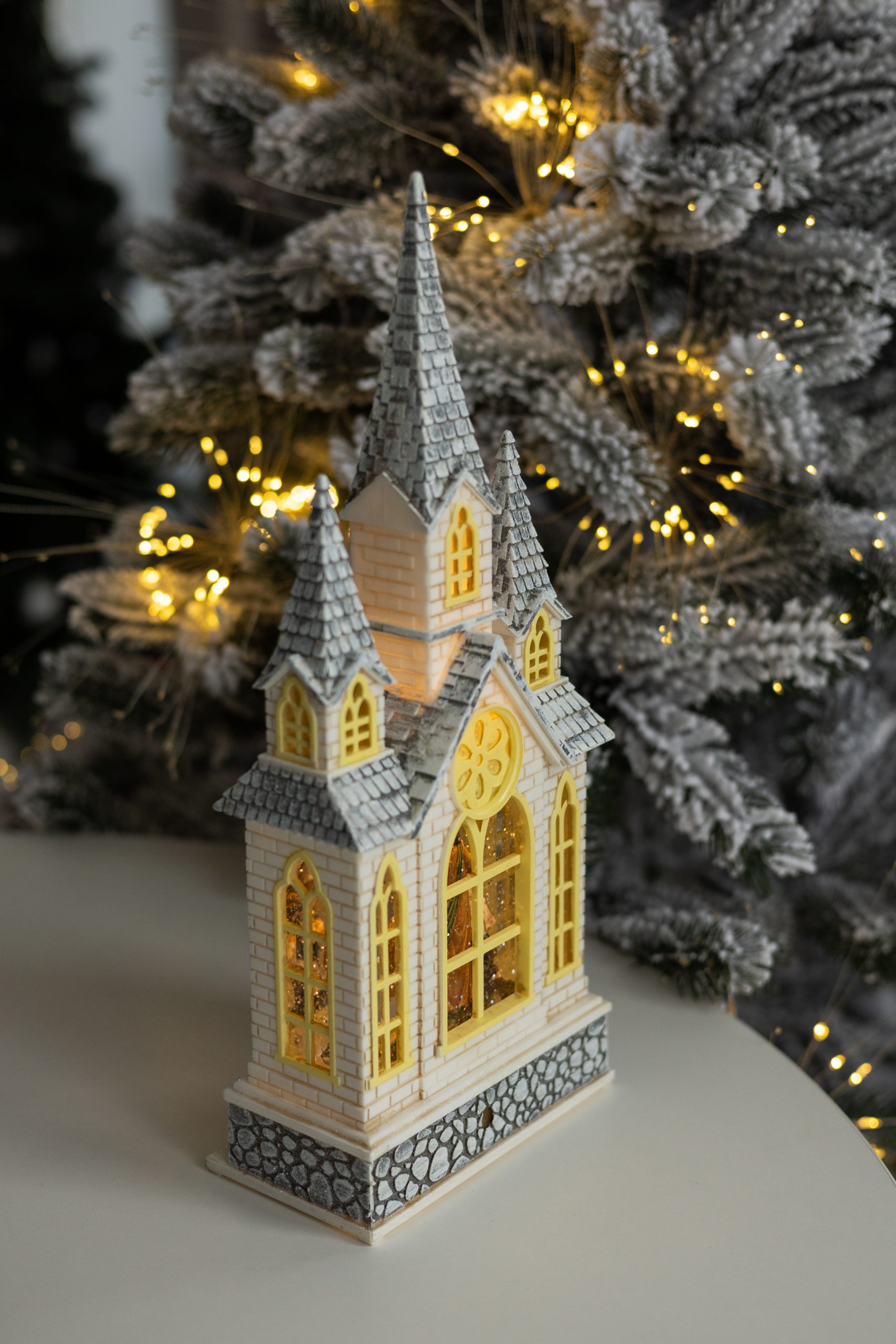 ✨Ліхтар у вигляді Різдвяного Собору виглядає святково та дуже атмосферно. Три високі вежі з «черепичними» дахами здіймаються догори ⛪, а фасад прикрашають високі вікна з теплою підсвіткою, що нагадують вітражі. Ніжні бежево-кам’яні тони та маленькі сходи до входу завершують образ затишного храму, який у ввімкненому стані сяє немов справжній собор у нічному місті ✨.
