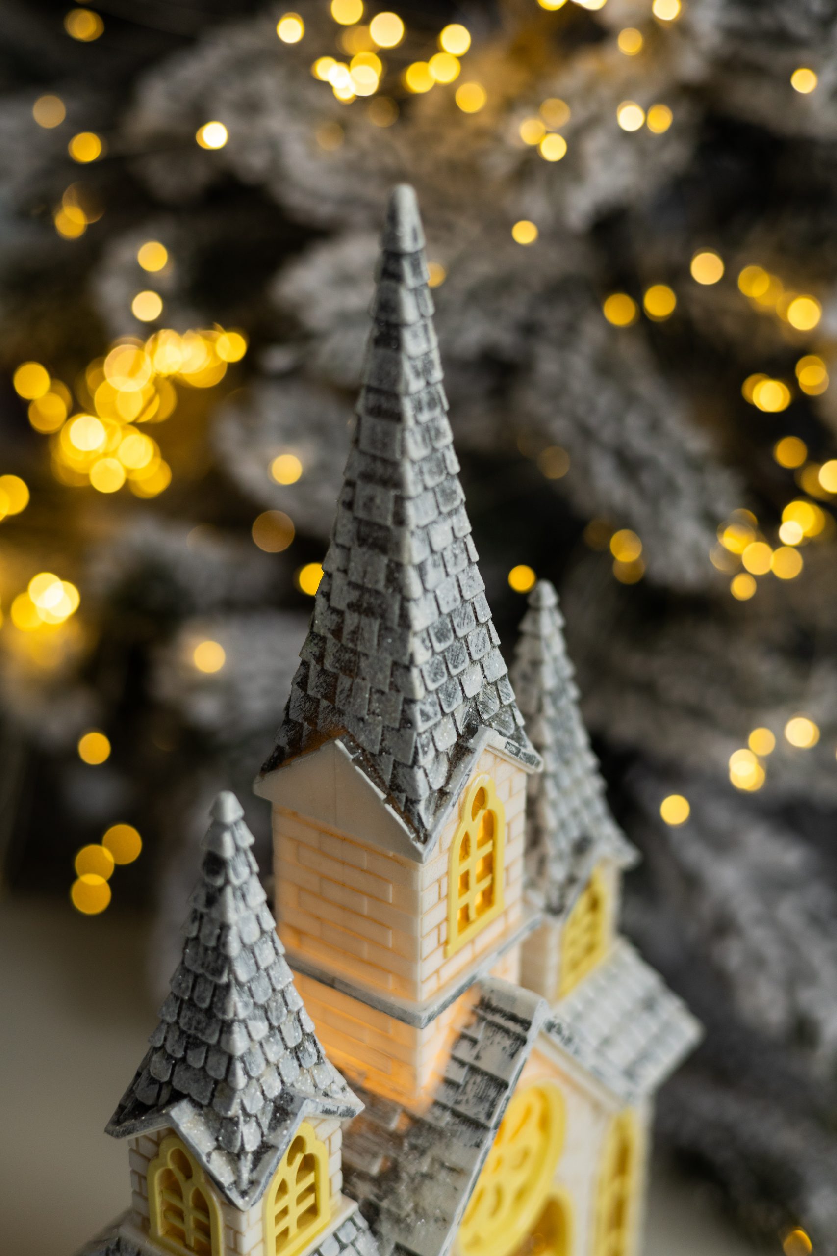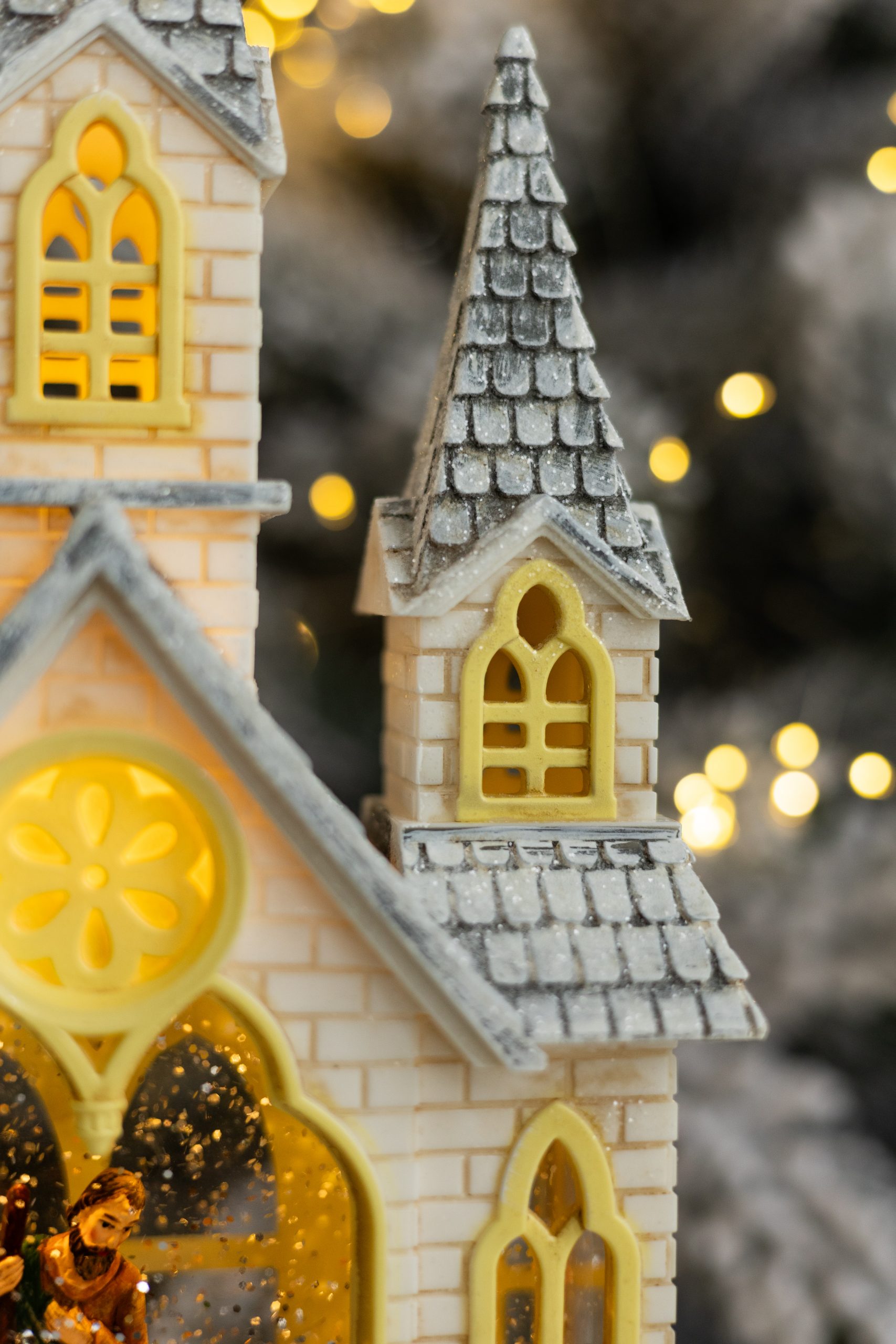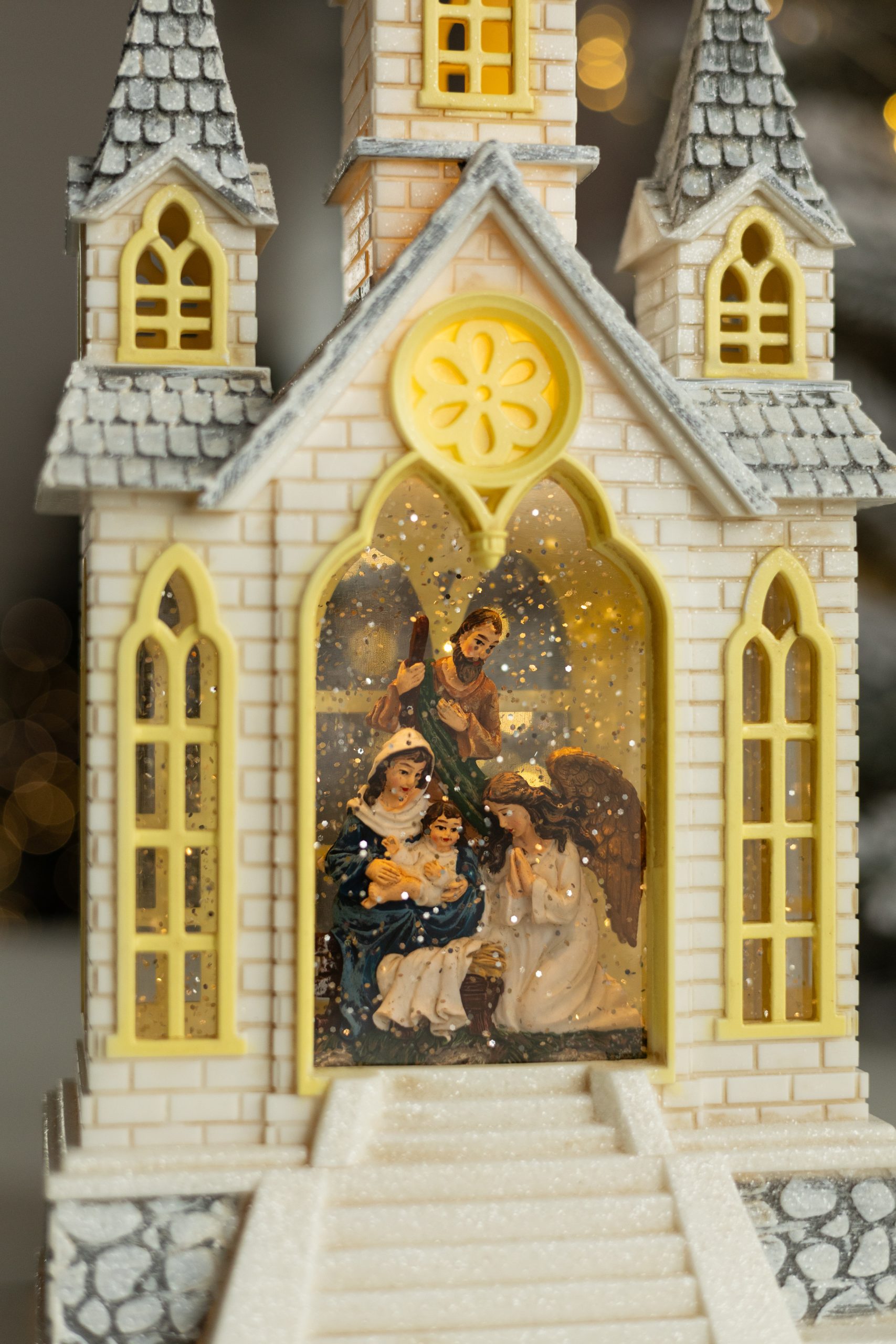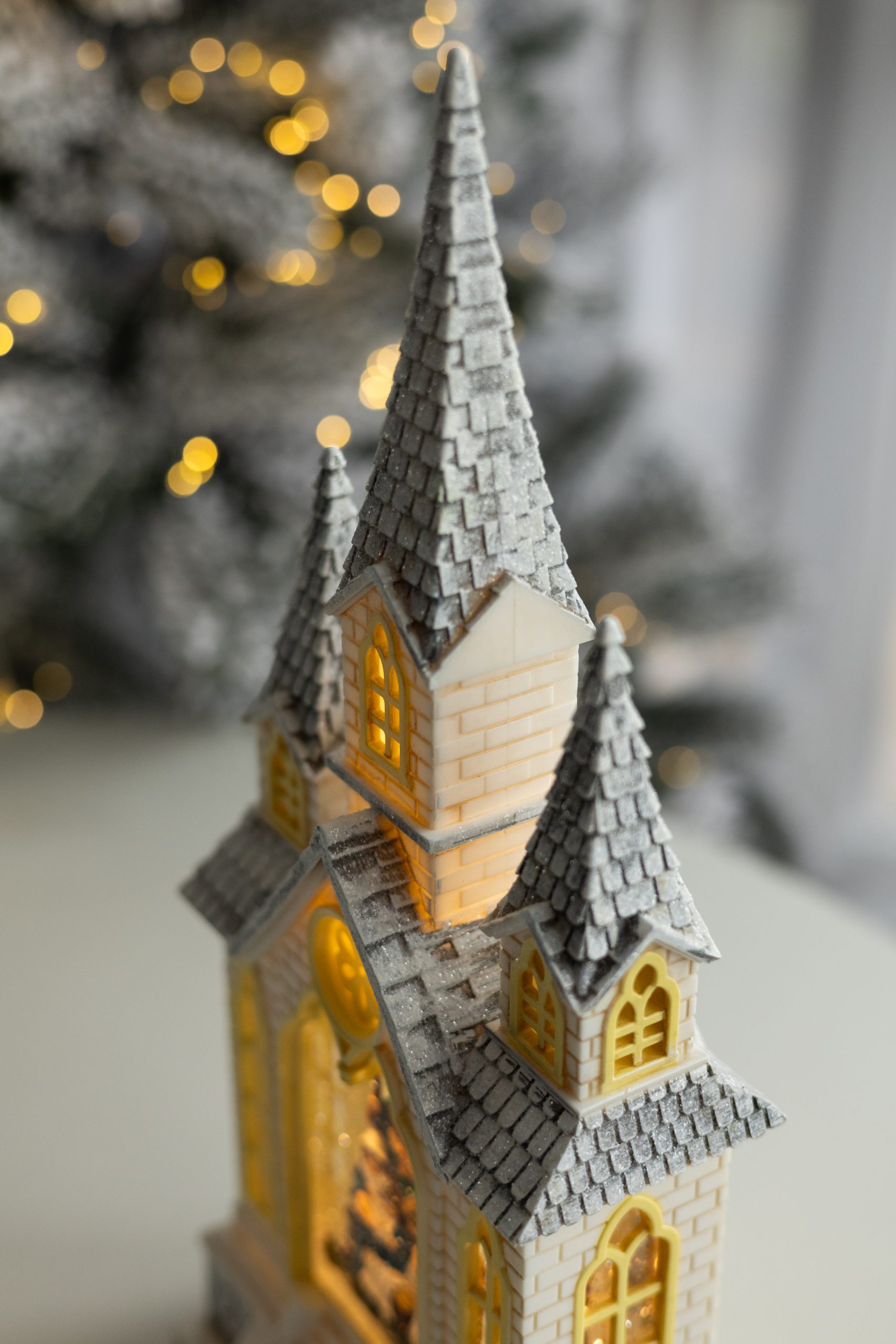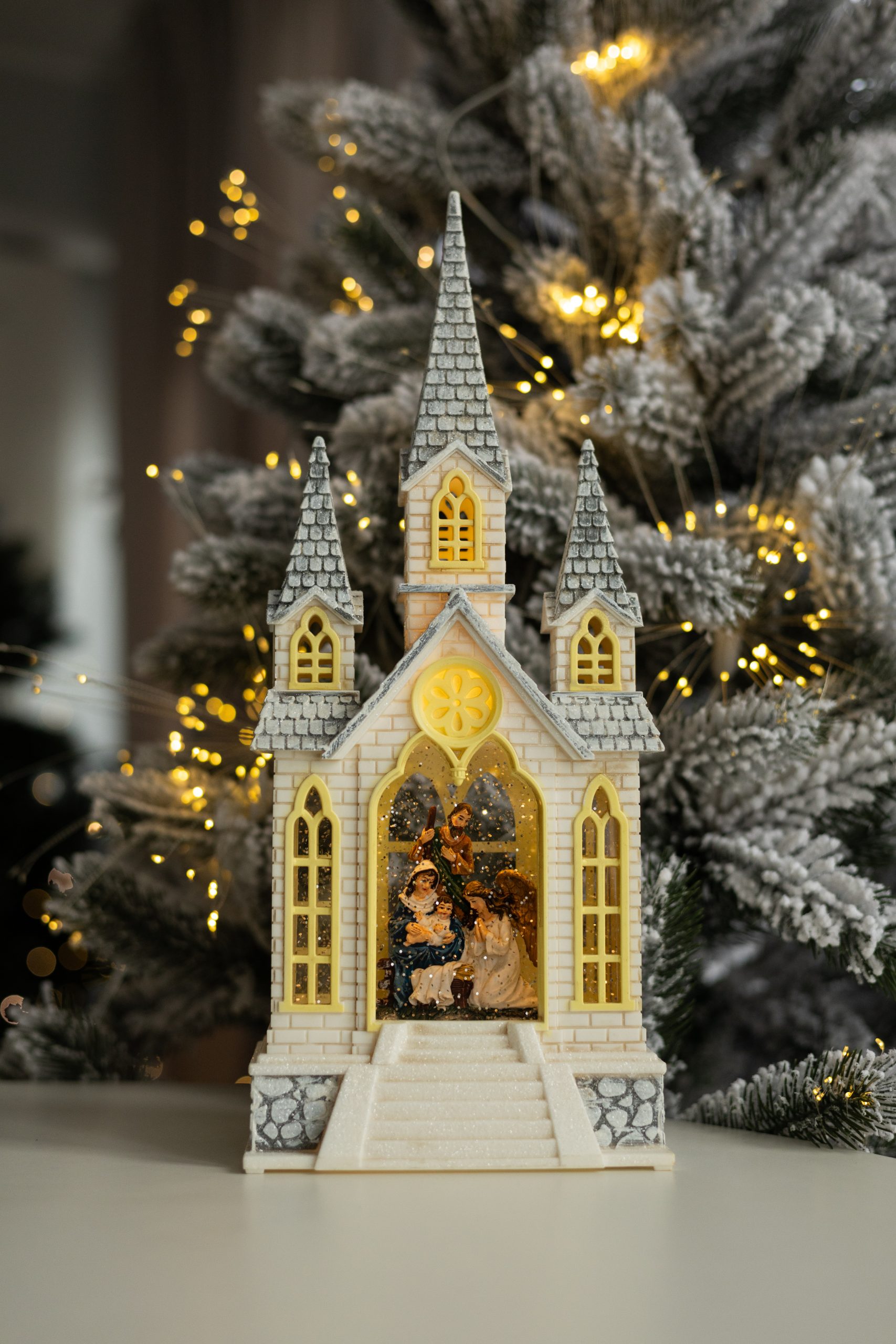 ✨Ліхтар у вигляді Різдвяного Собору виглядає святково та дуже атмосферно. Три високі вежі з «черепичними» дахами здіймаються догори ⛪, а фасад прикрашають високі вікна з теплою підсвіткою, що нагадують вітражі. Ніжні бежево-кам’яні тони та маленькі сходи до входу завершують образ затишного храму, який у ввімкненому стані сяє немов справжній собор у нічному місті ✨.