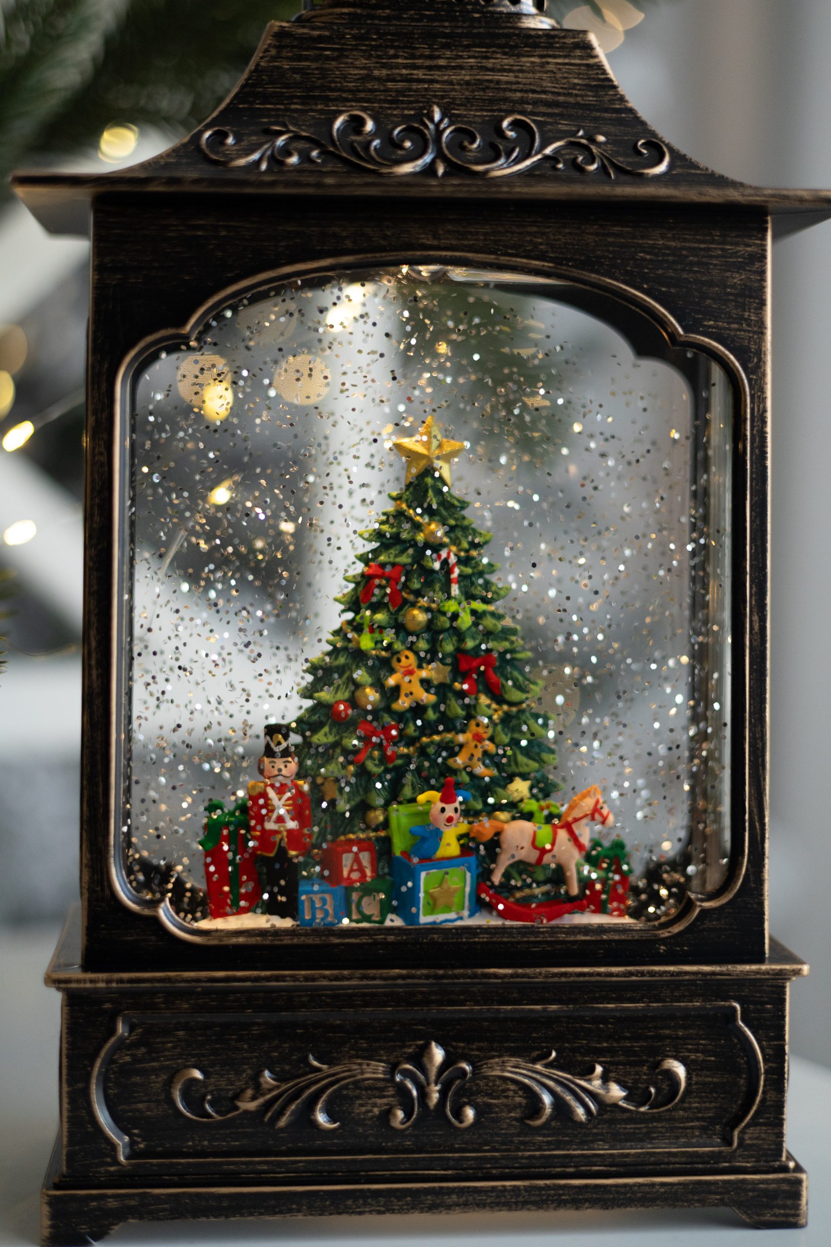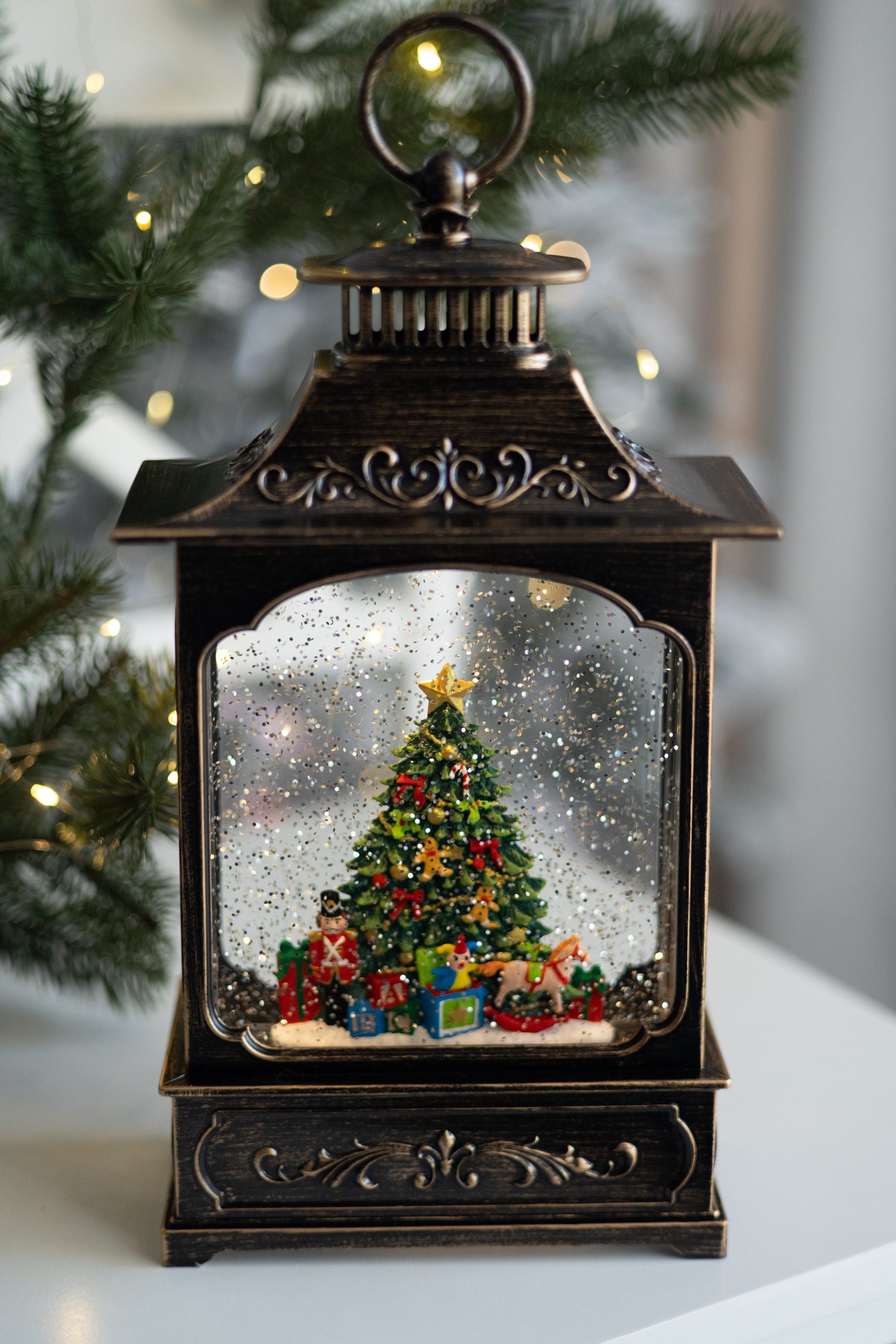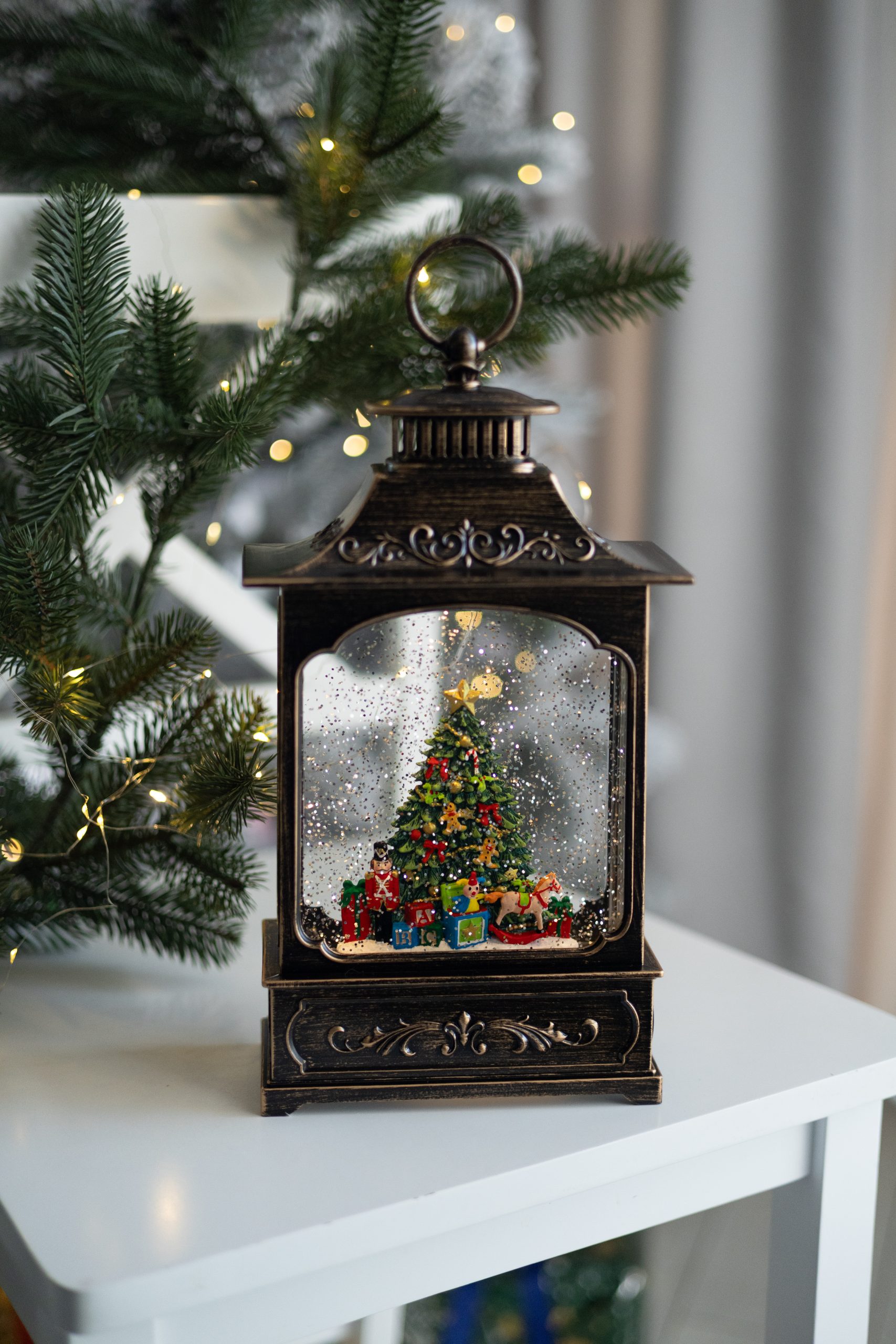 🎄Усередині ліхтаря — височіє велика святкова ялинка, щедро оздоблена гірляндами, червоними бантами, пряниковими чоловічками, золотими кулями та цукровими тростинами, а на її верхівці сяє золота зірка. Біля ялинки розташувалися барвисті подарунки, лускунчик та коник-гойдалка — разом вони створюють справді чарівну, казкову сцену ✨.