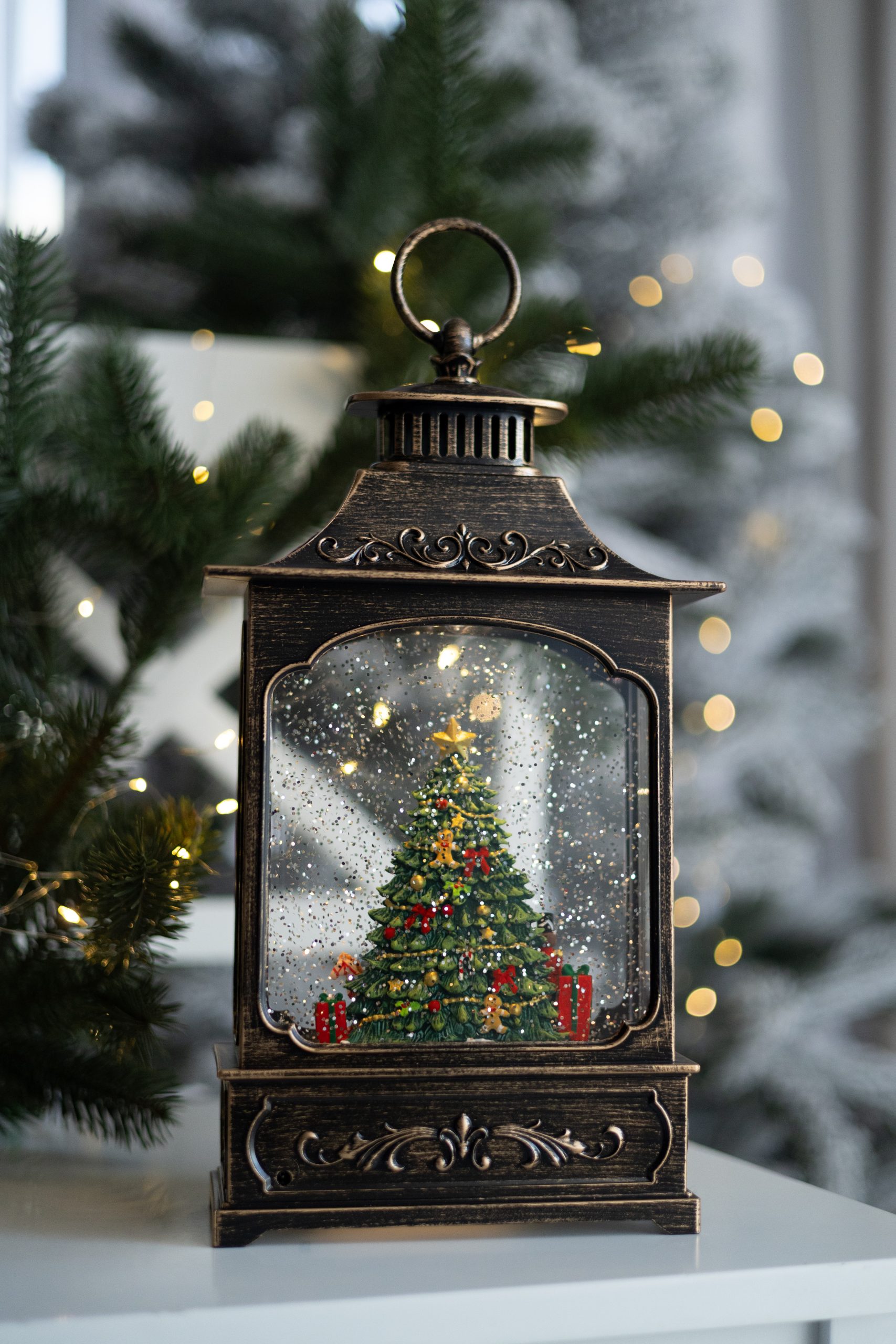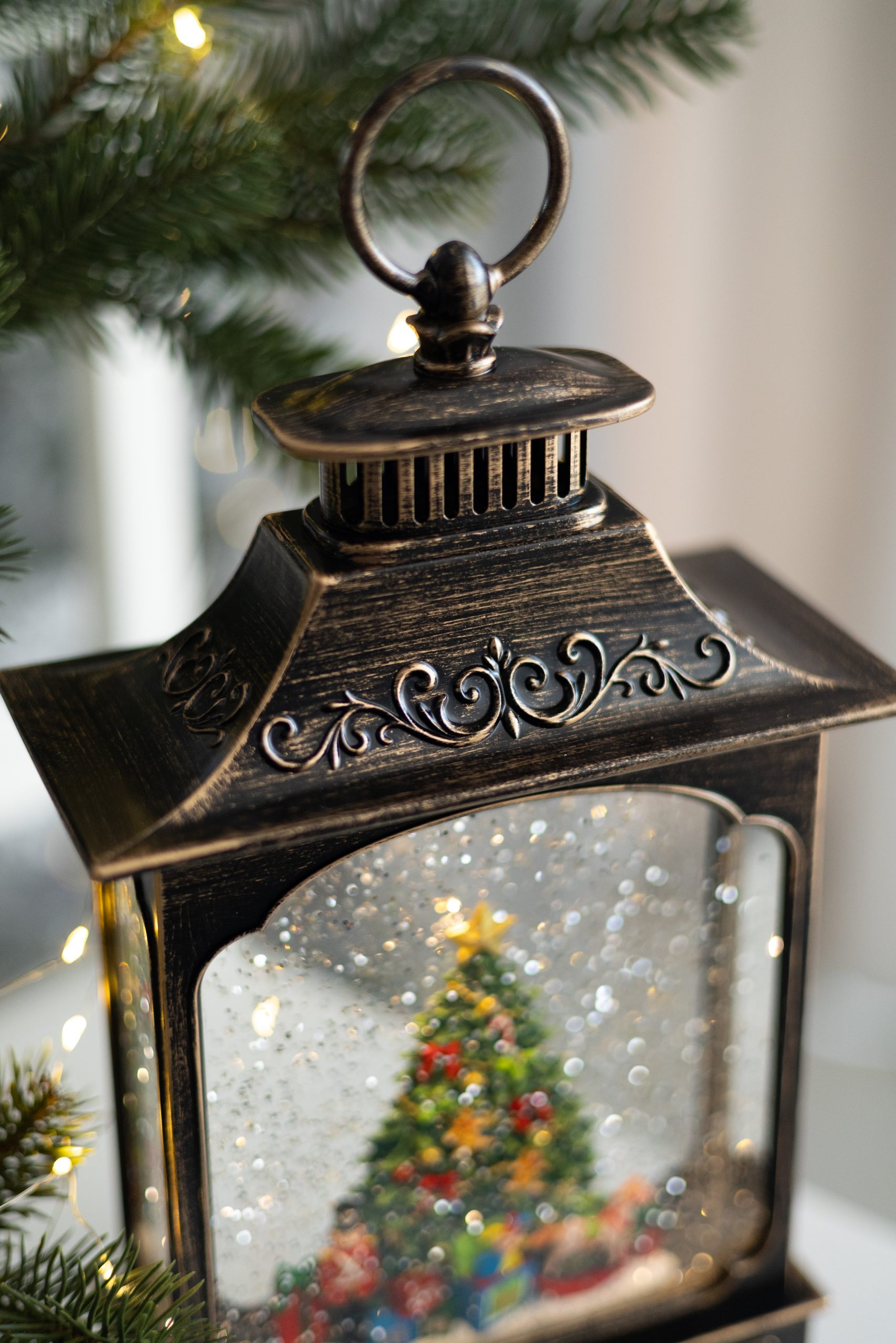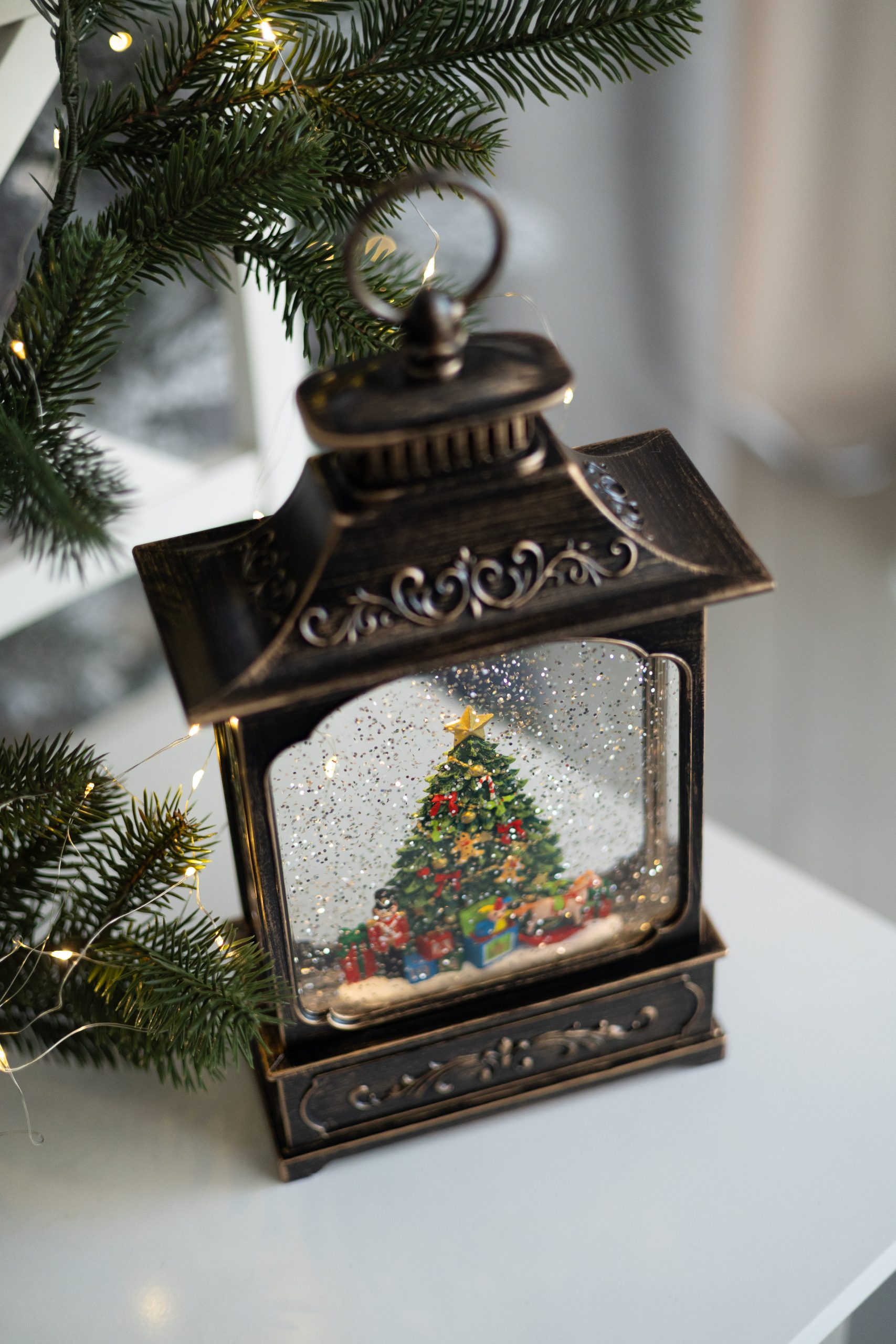 🎄Усередині ліхтаря — височіє велика святкова ялинка, щедро оздоблена гірляндами, червоними бантами, пряниковими чоловічками, золотими кулями та цукровими тростинами, а на її верхівці сяє золота зірка. Біля ялинки розташувалися барвисті подарунки, лускунчик та коник-гойдалка — разом вони створюють справді чарівну, казкову сцену ✨.