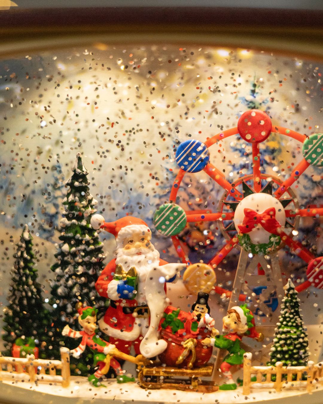“Санта біля оглядового колеса” Санта зі списком подарунків, поряд двоє помічників Ельфів тягнуть сани з купою подарунків, а на фоні крутиться оглядове колесо.