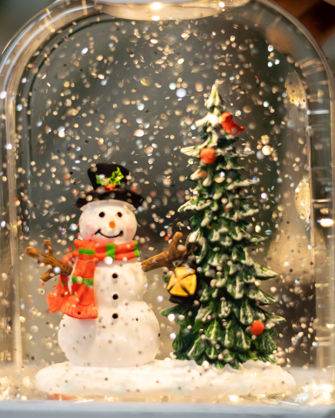 - Білий корпус із сюжетом “Сніговик біля ялинки”. Сніговик тримає в руці ліхтар з теплою підсвіткою, на фоні – засніжена ялинка з пташками.