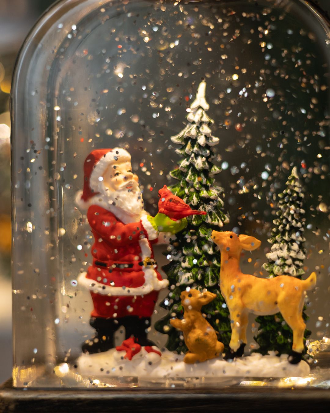 - Бронзовий корпус із сюжетом “Санта з лісовими звірями”. Санта тримає в руках пташку, на них захоплено дивляться зайчик та косуля, на фоні – засніжені ялинки.