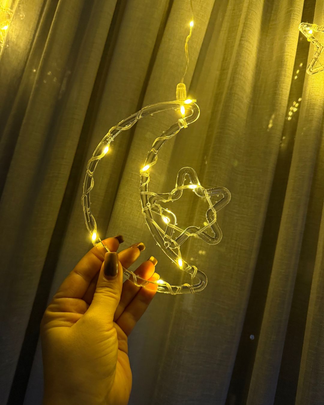 Гірлянда складається з менших зірочок угорі та більших місяців унизу, з яких посередині мерехтять маленькі зірочки — ніби нічне небо ожило просто у Вашій кімнаті. Всередині фігурок – ніжні крапельки роси, що виглядають дуже атмосферно.