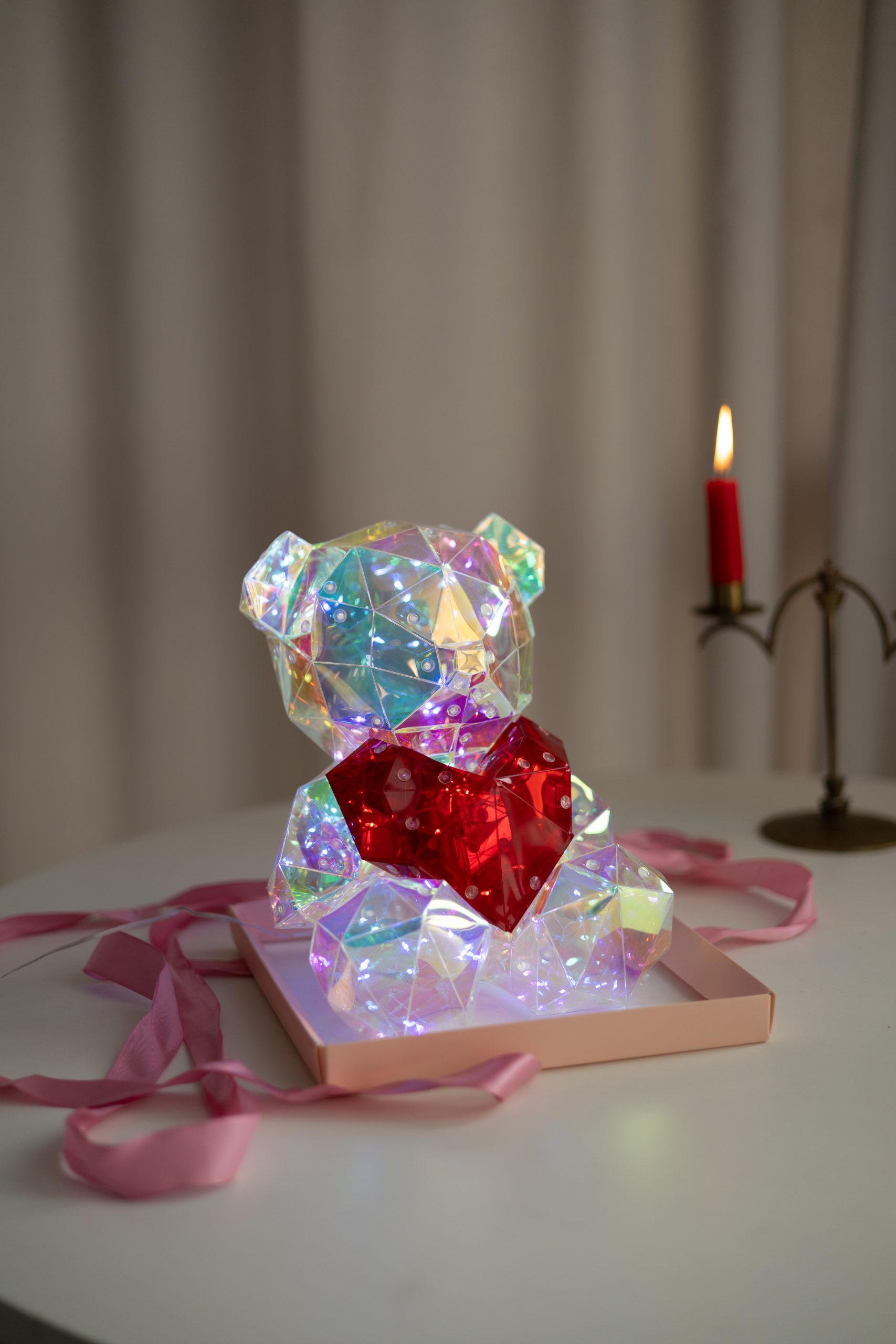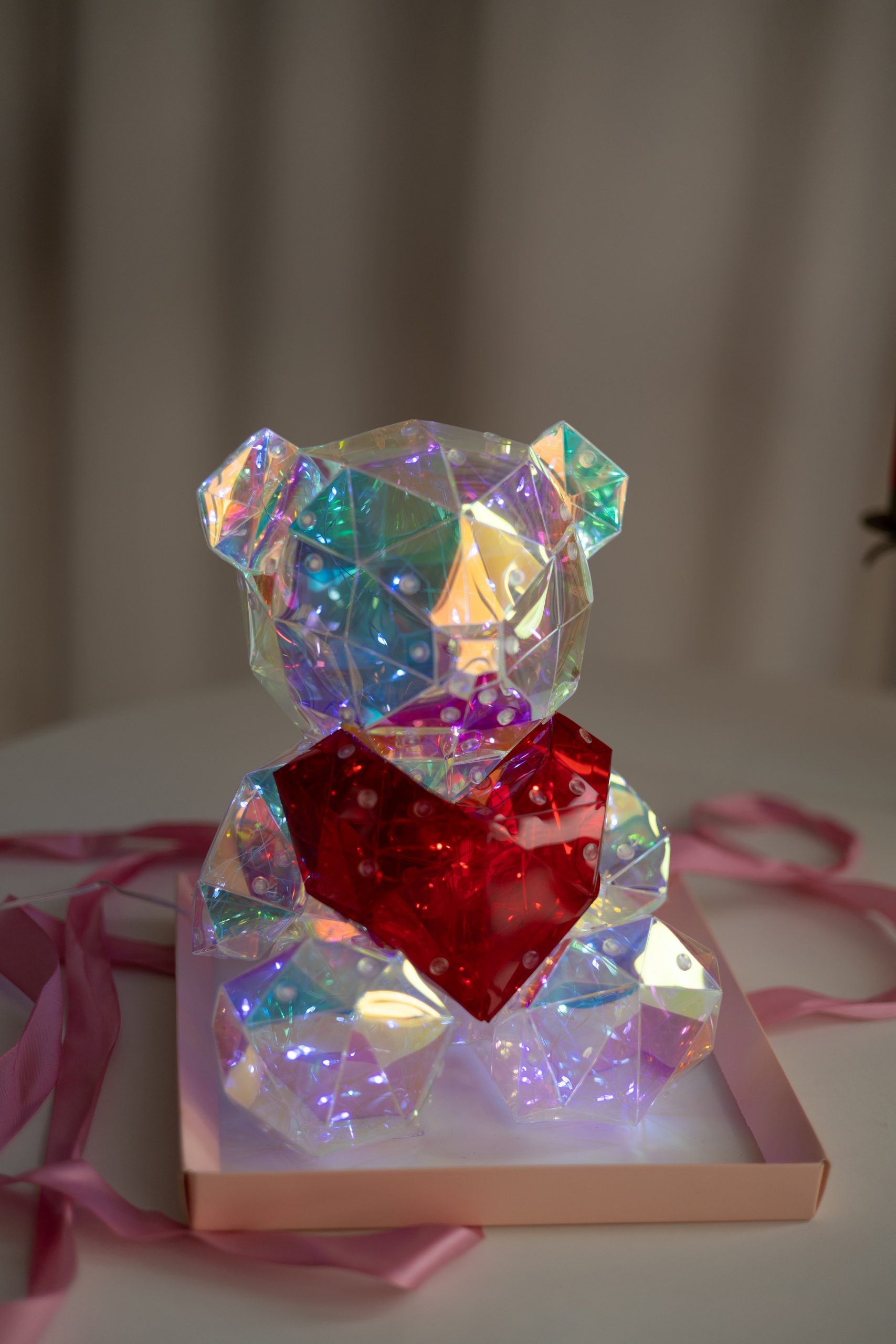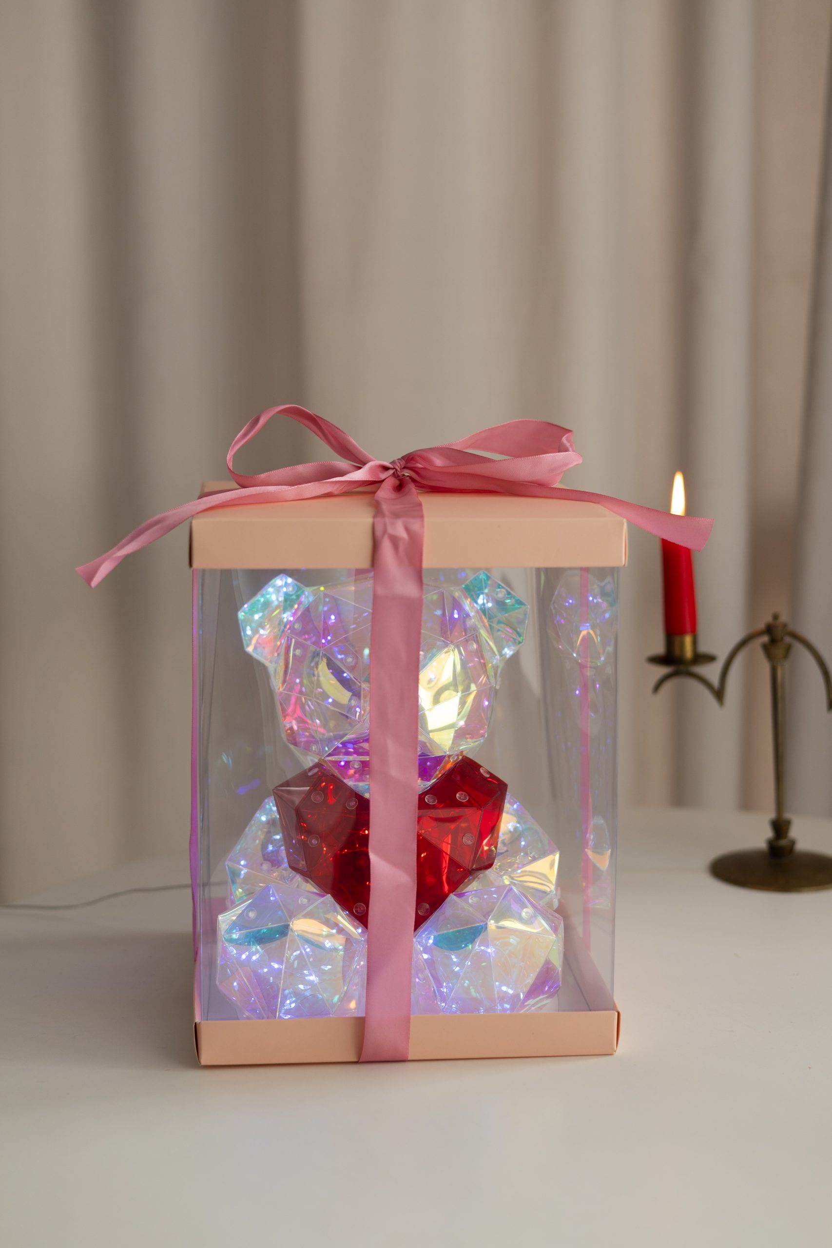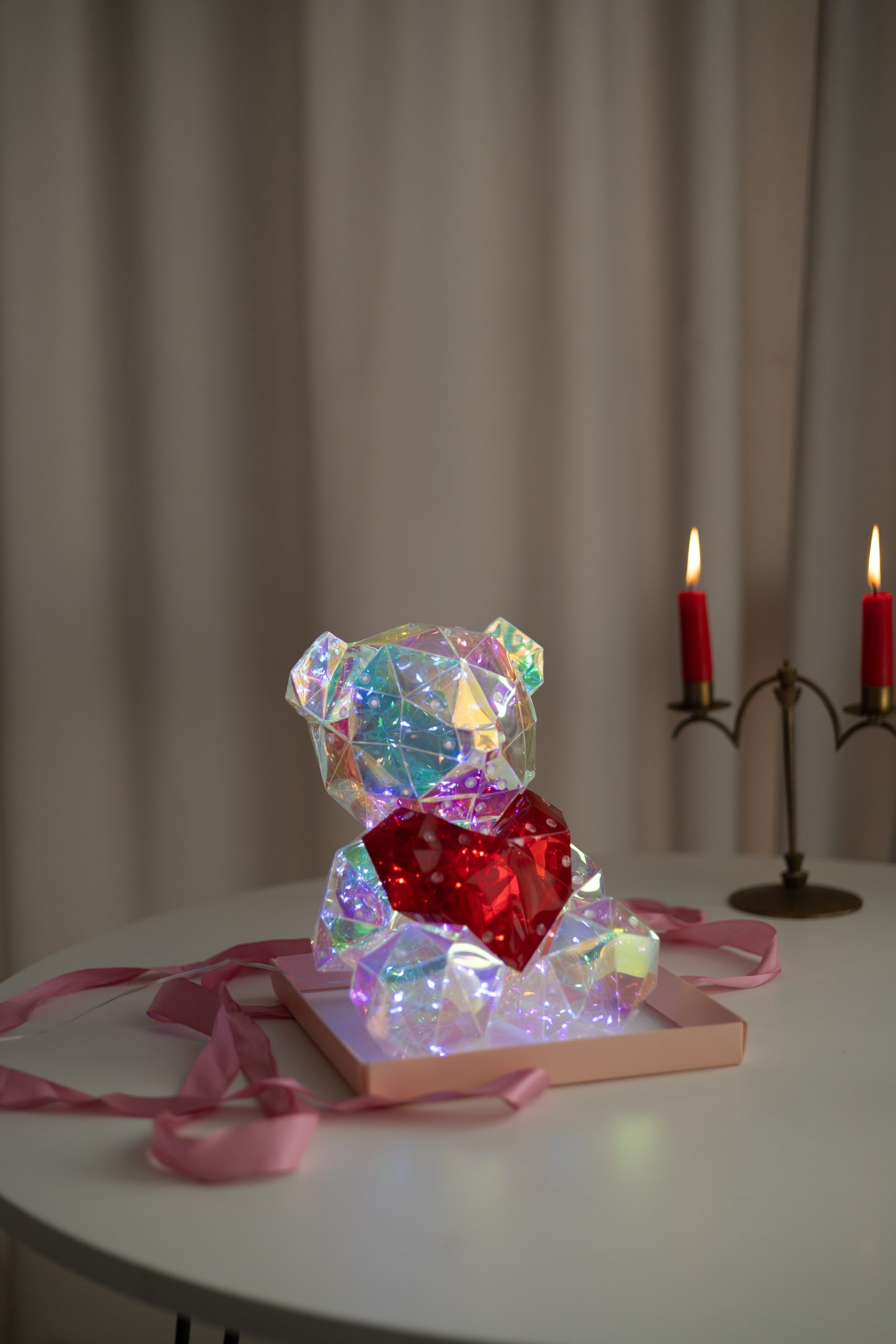 ✨ Кришталевий голографічний 3D нічник «Ведмедик з сердечком» з підсвіткою — чарівний подарунок, який можна вручати одразу. Прозора коробка вже зібрана та прикрашена ніжним бантиком, тож нічник готовий створювати святковий настрій без зайвого пакування.