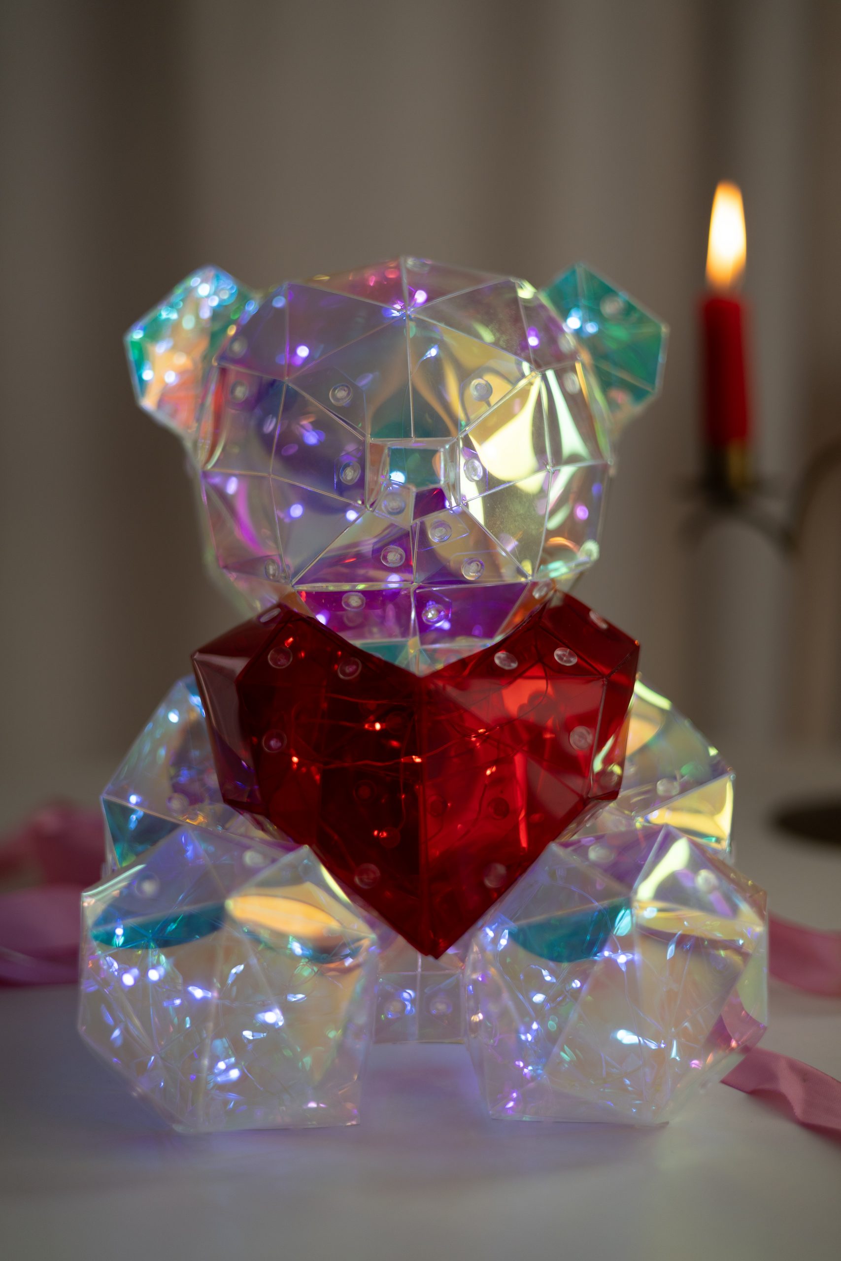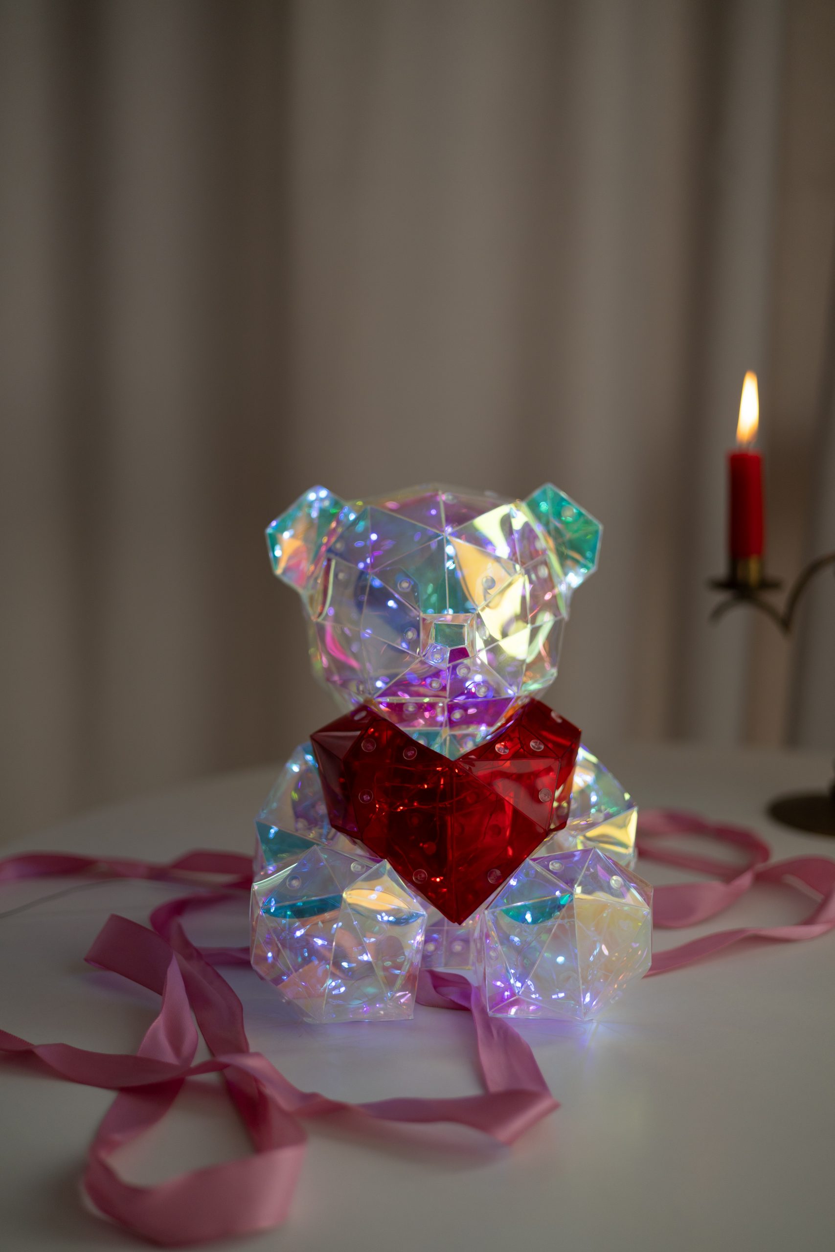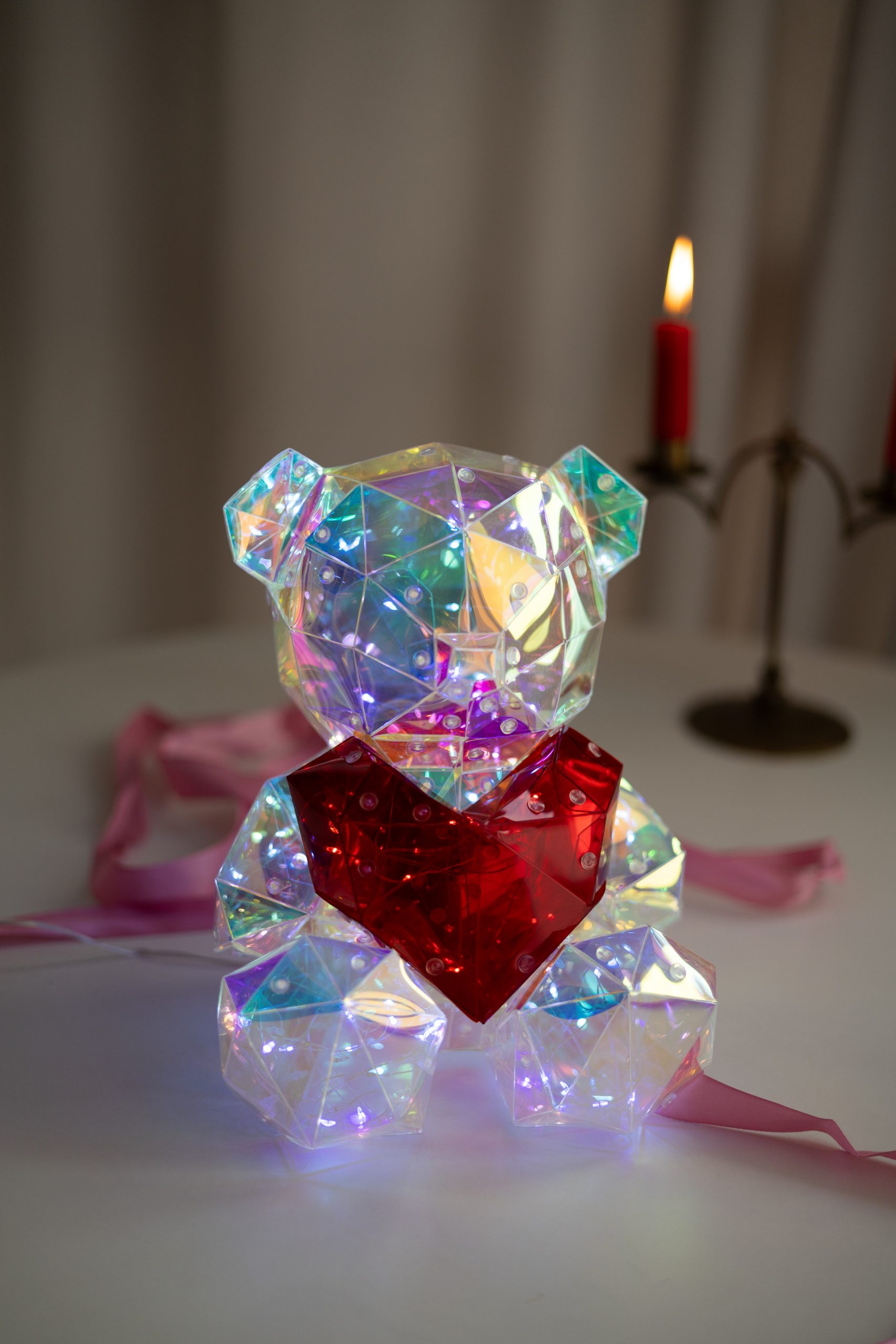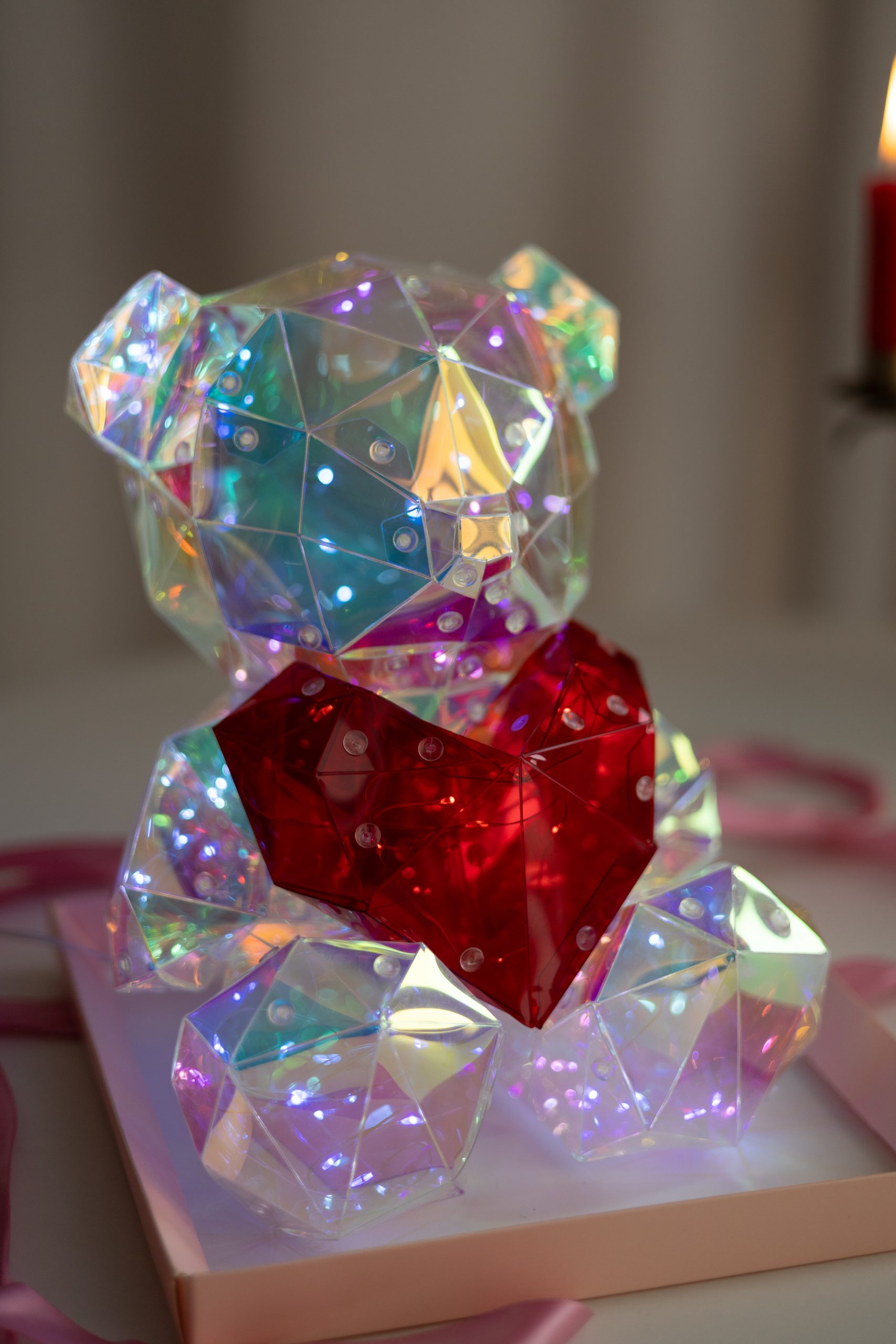 ✨ Кришталевий голографічний 3D нічник «Ведмедик з сердечком» з підсвіткою — чарівний подарунок, який можна вручати одразу. Прозора коробка вже зібрана та прикрашена ніжним бантиком, тож нічник готовий створювати святковий настрій без зайвого пакування.
