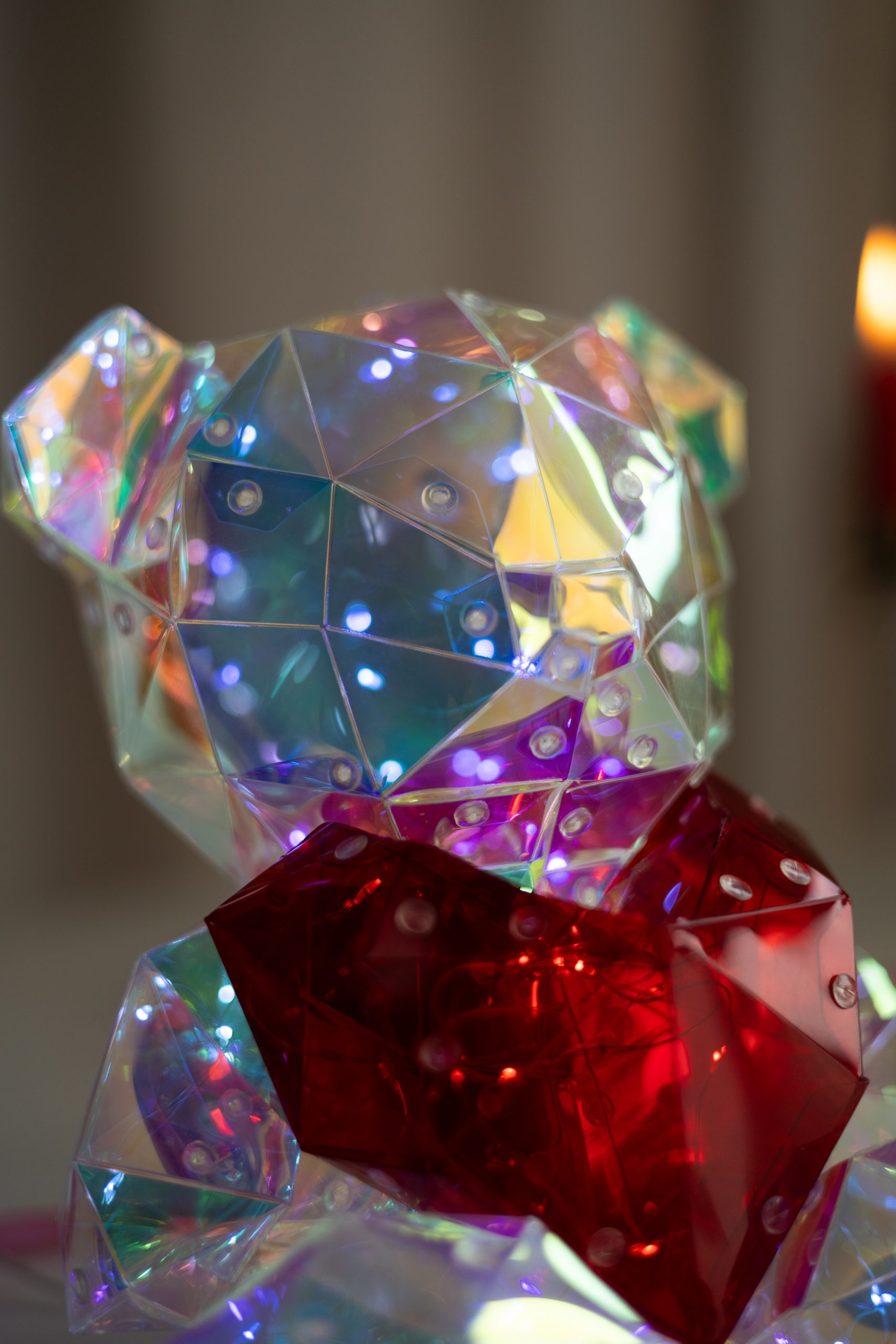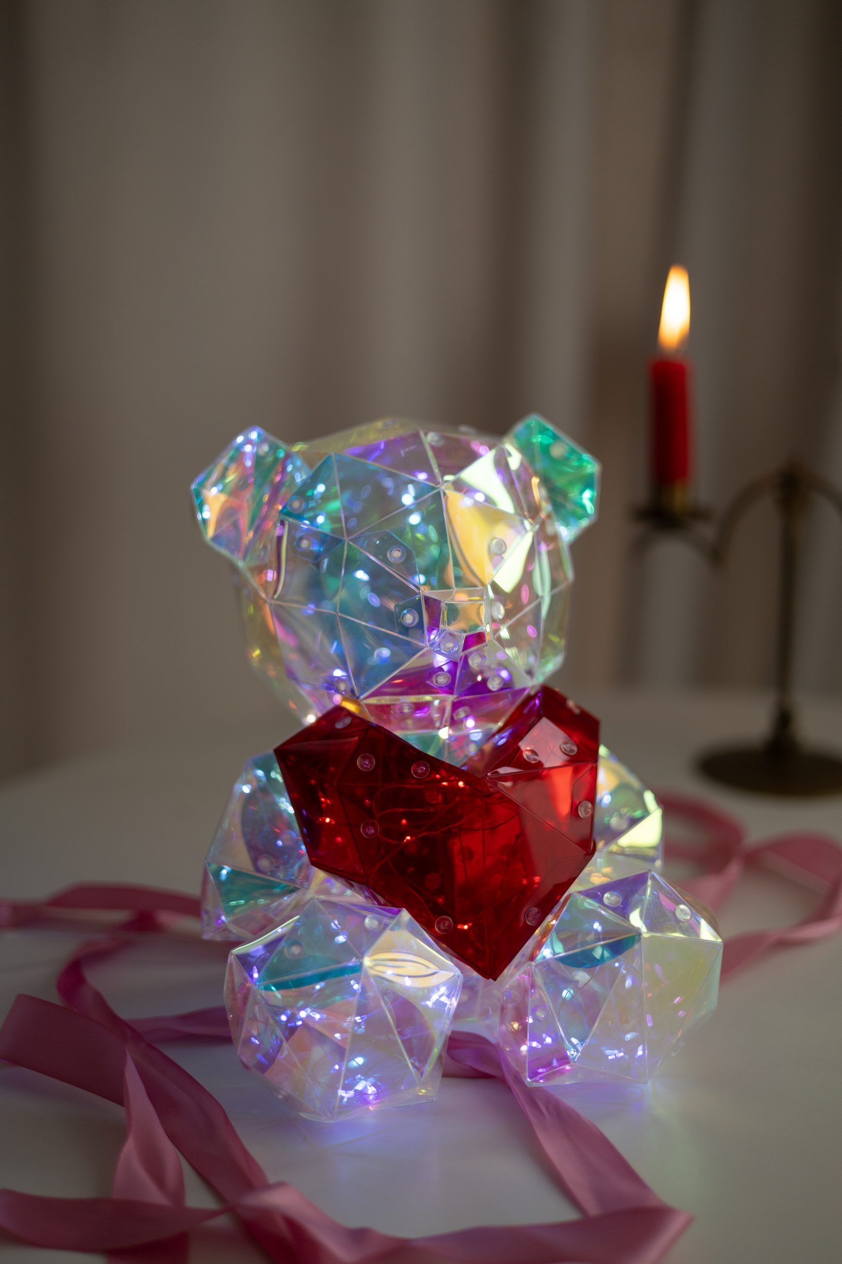 🐻 Корпус ведмедика складається з безлічі тонких граней, які навіть у вимкненому стані красиво переливаються на світлі. Коли нічник увімкнено, ведмедик засяє зсередини, наповнюючи простір теплою казковою атмосферою — ідеально для дитячої, спальні або робочого столу.