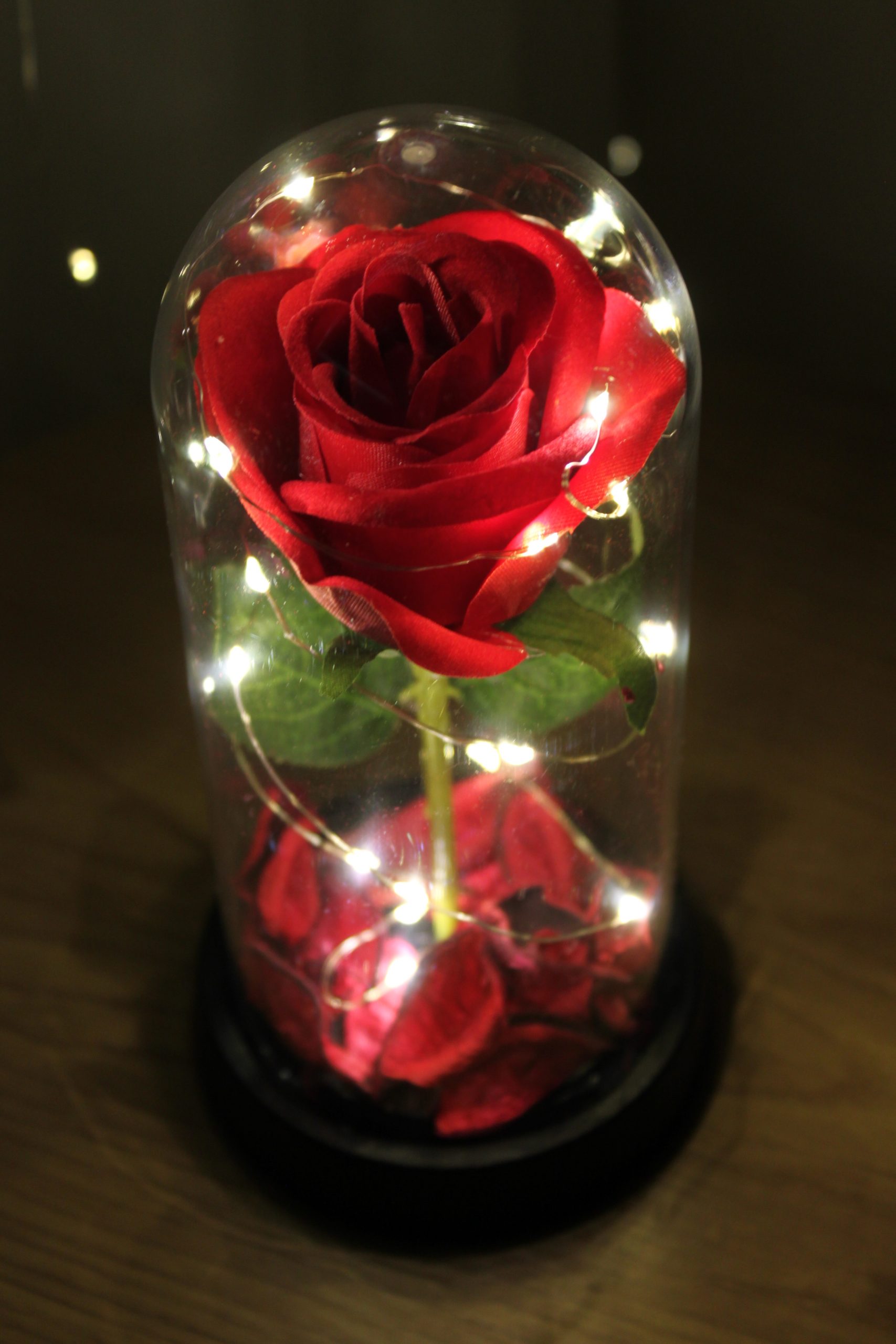 Сяюча троянда – це витончене поєднання романтики та пристрасті. Червона троянда у прозорій скляній колбі, доповнена ніжною теплою підсвіткою, виглядає чарівно.  А пелюстки сухоцвітів на дні додають композиції особливого шарму та загадковості.