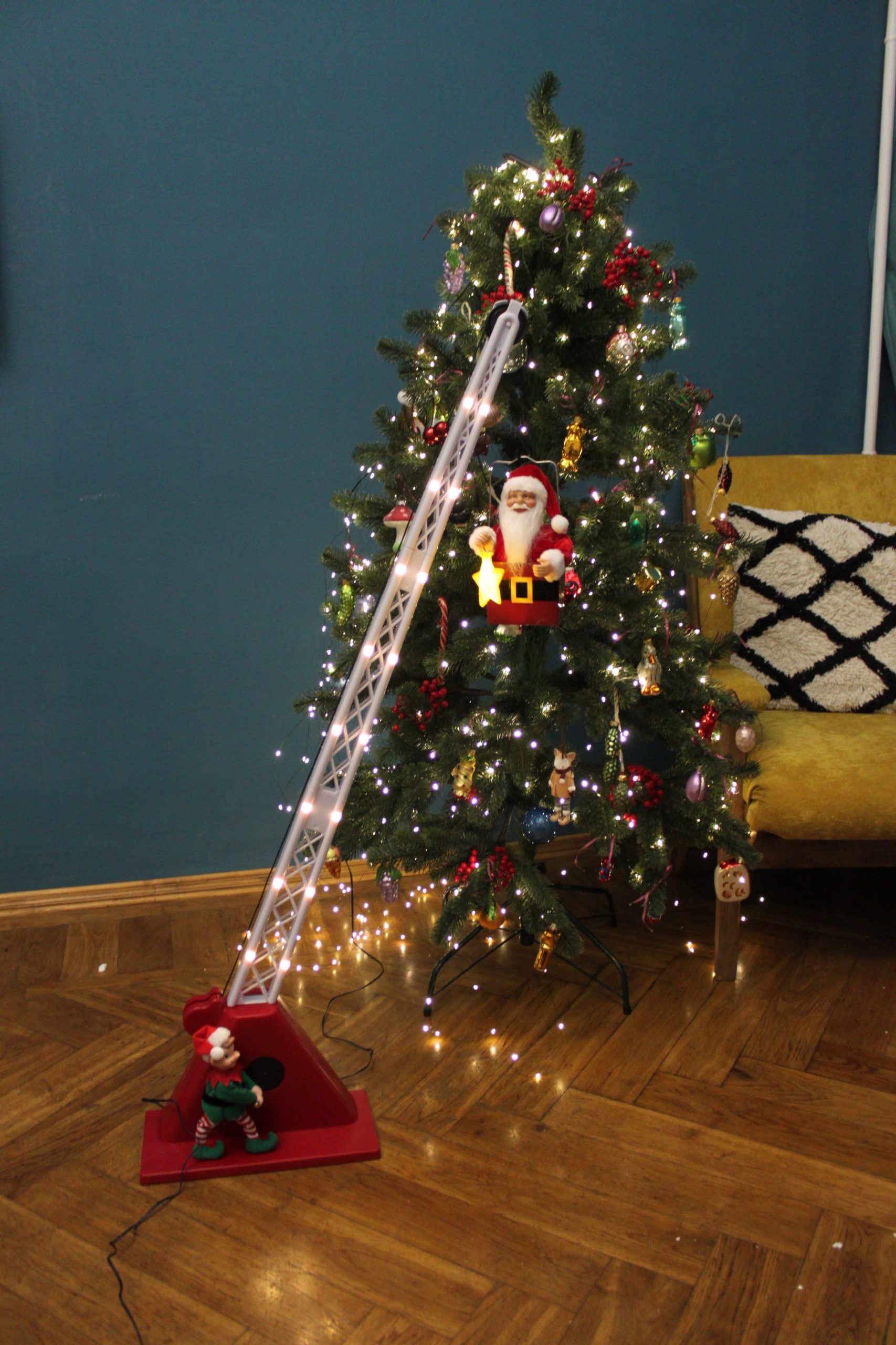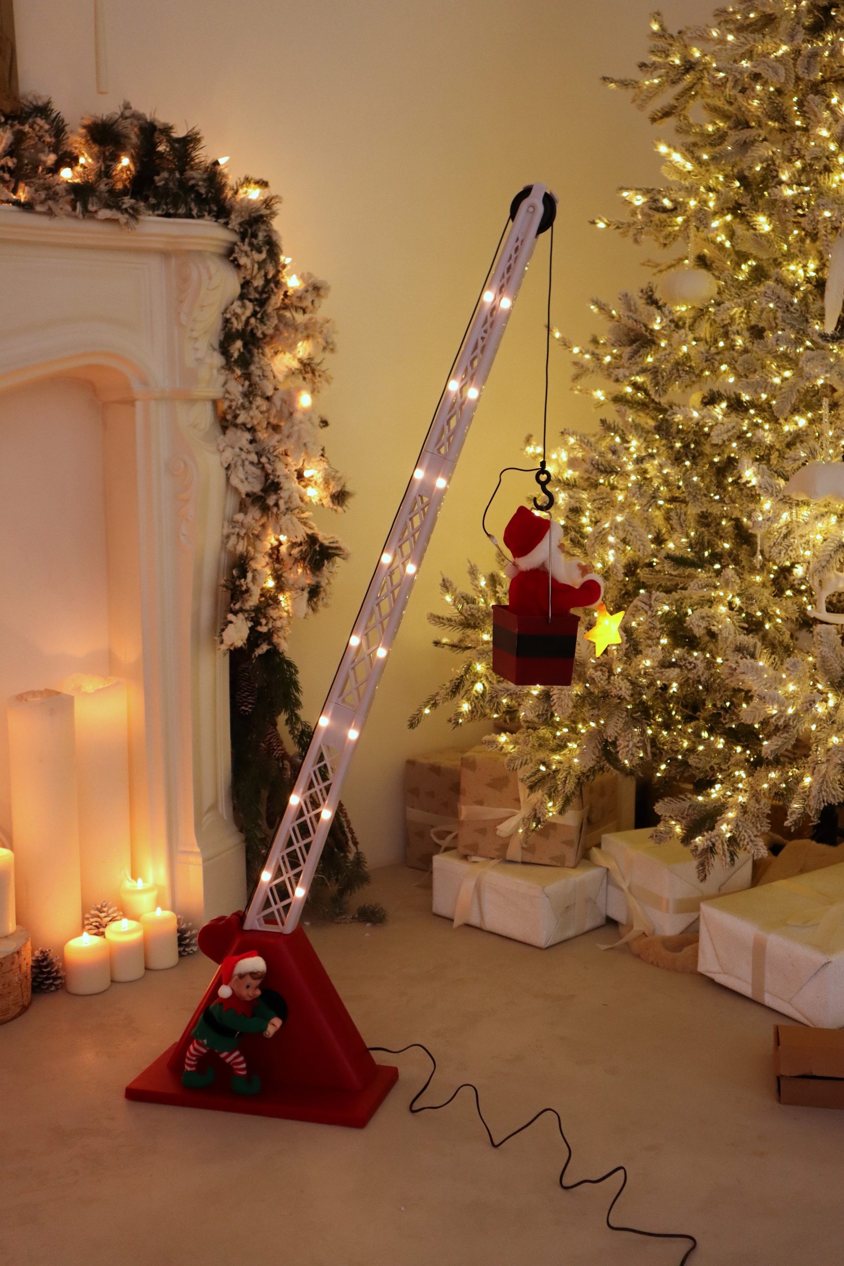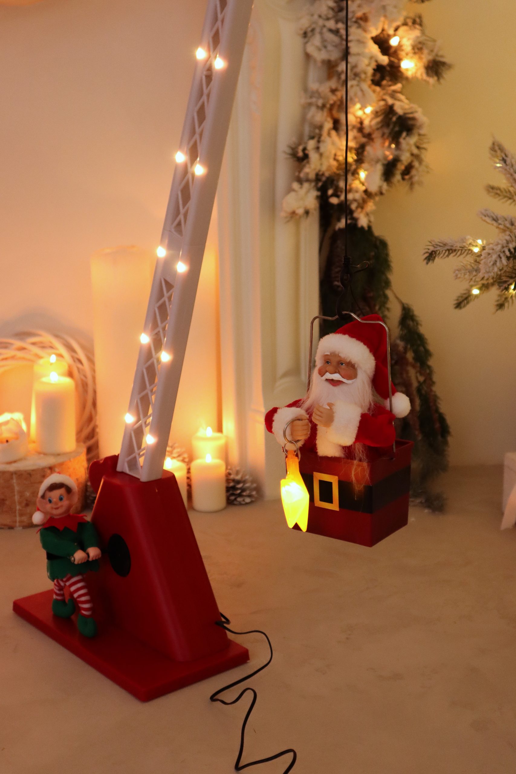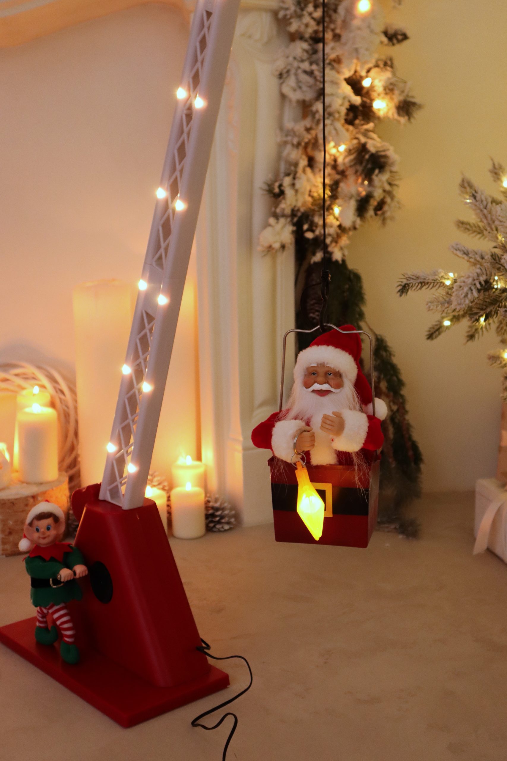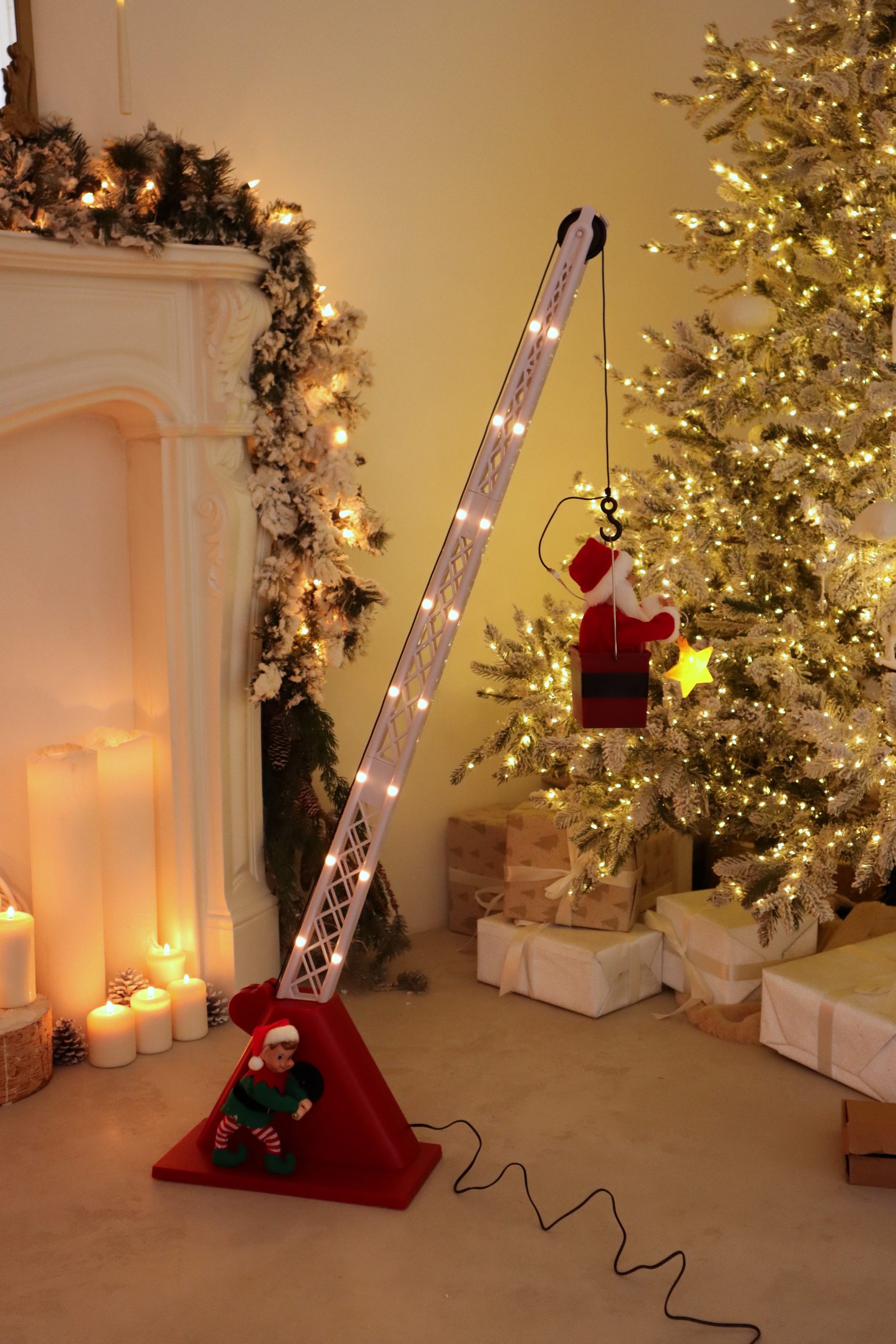 Не встигаєте прикрасити ялинку? Новорічна бригада вже спішить Вам на допомогу на “Сяючому крані”, щоб врятувати Новий рік. Працьовитий Ельф керує краном, допомагаючи Санті підніматись та опускатись, щоб Санта встигнув прикрасити ялинку. Вертикальна (біла) частина крану світиться, що створює ще чарівніший ефект.
