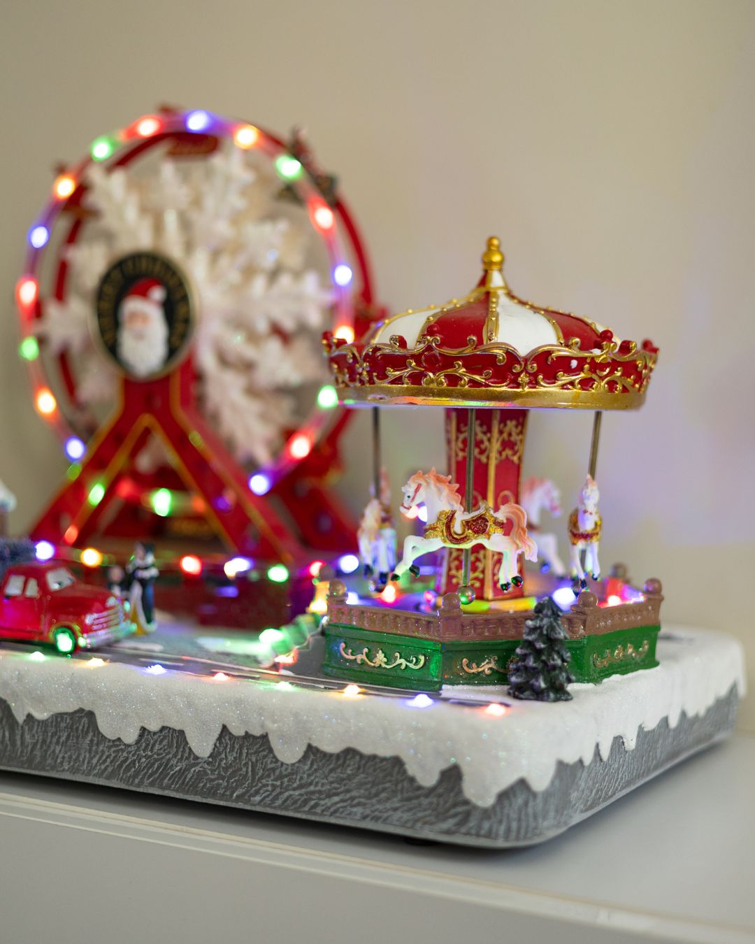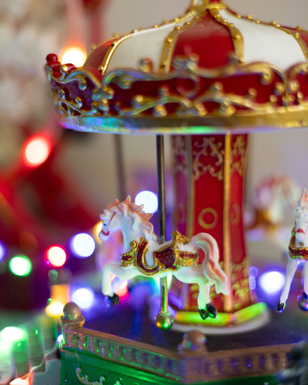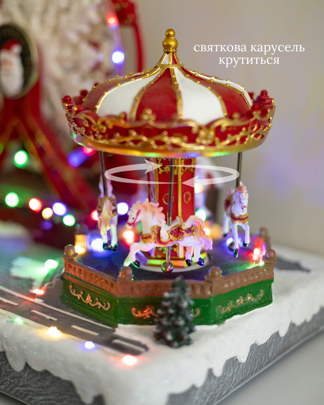 - Крутиться святкова карусель з 4 фігурками коней.