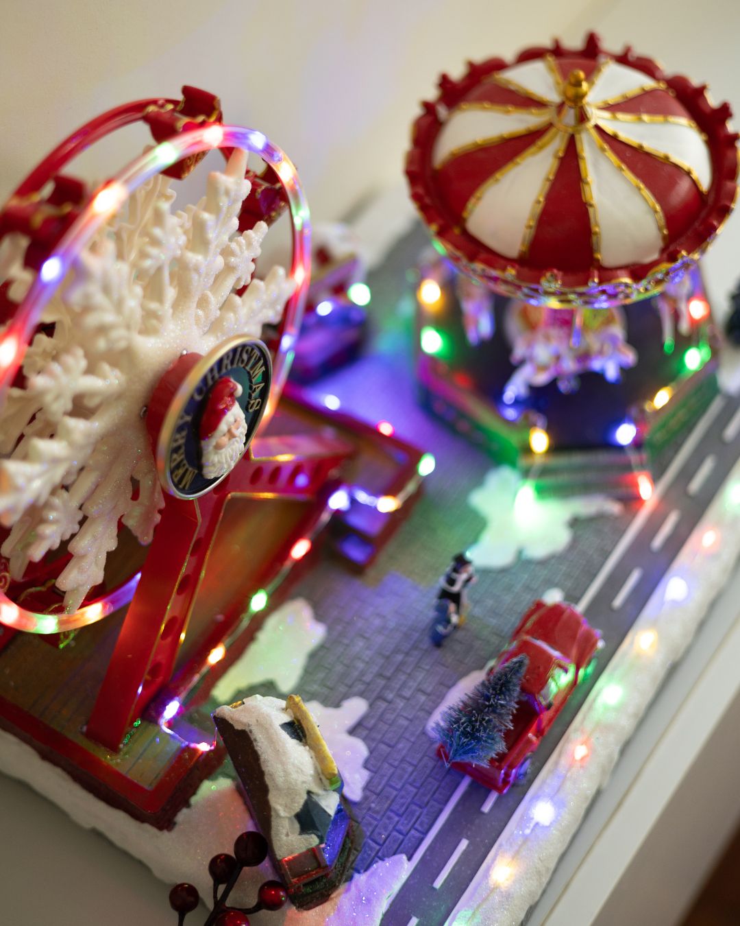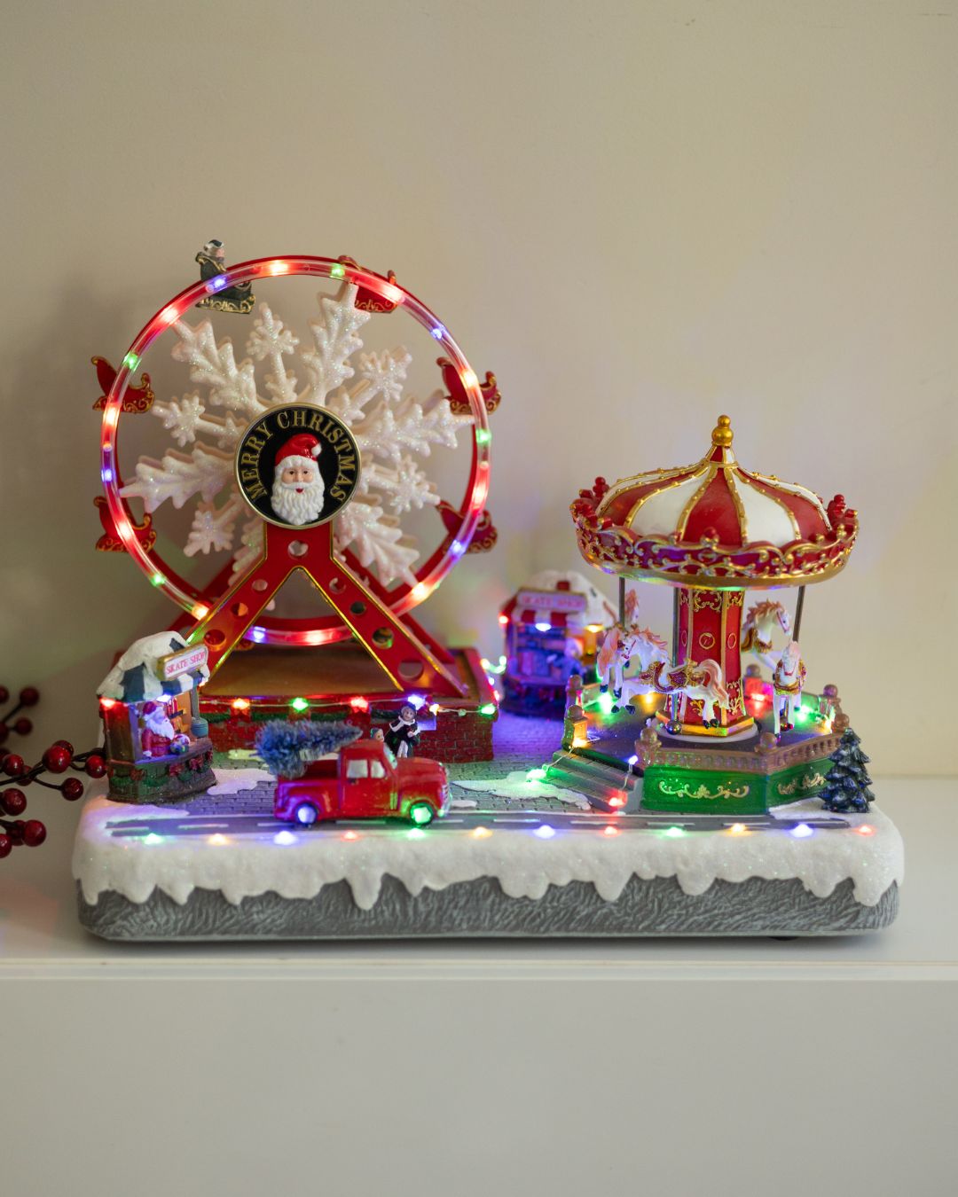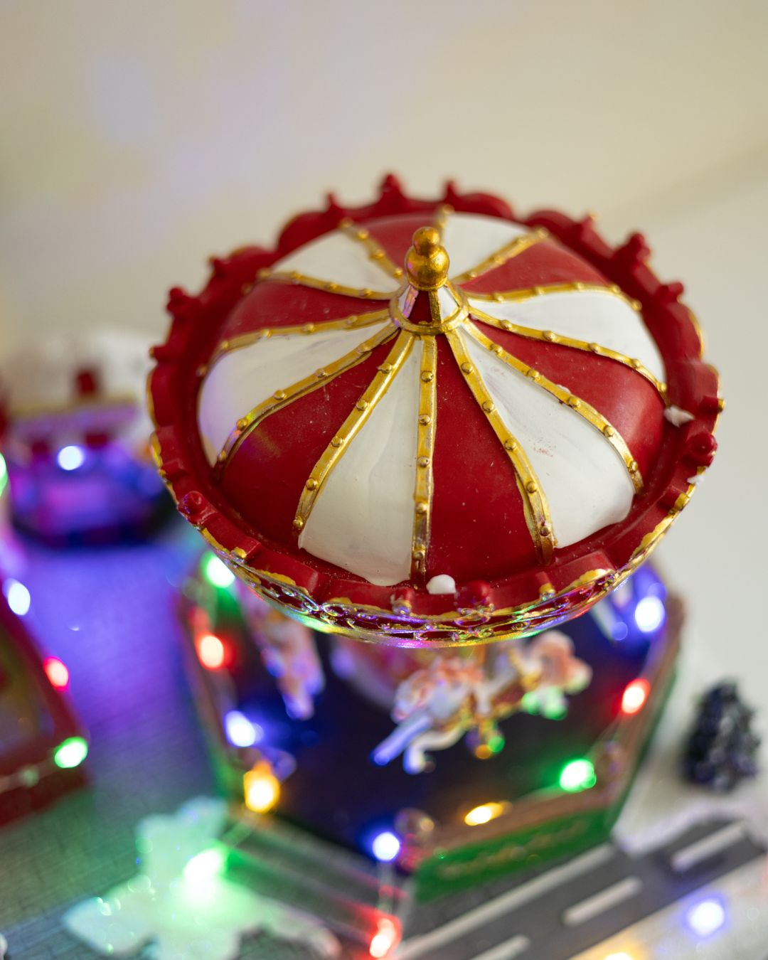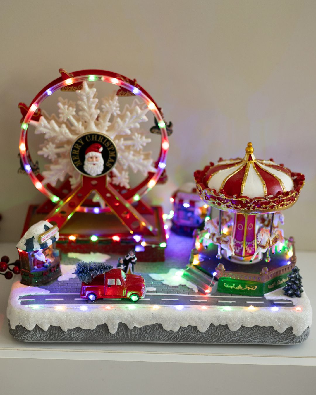 - Крутиться святкова карусель з 4 фігурками коней.