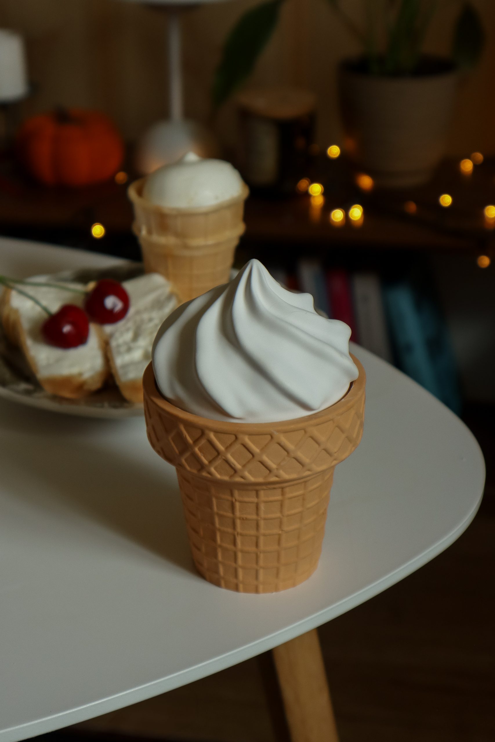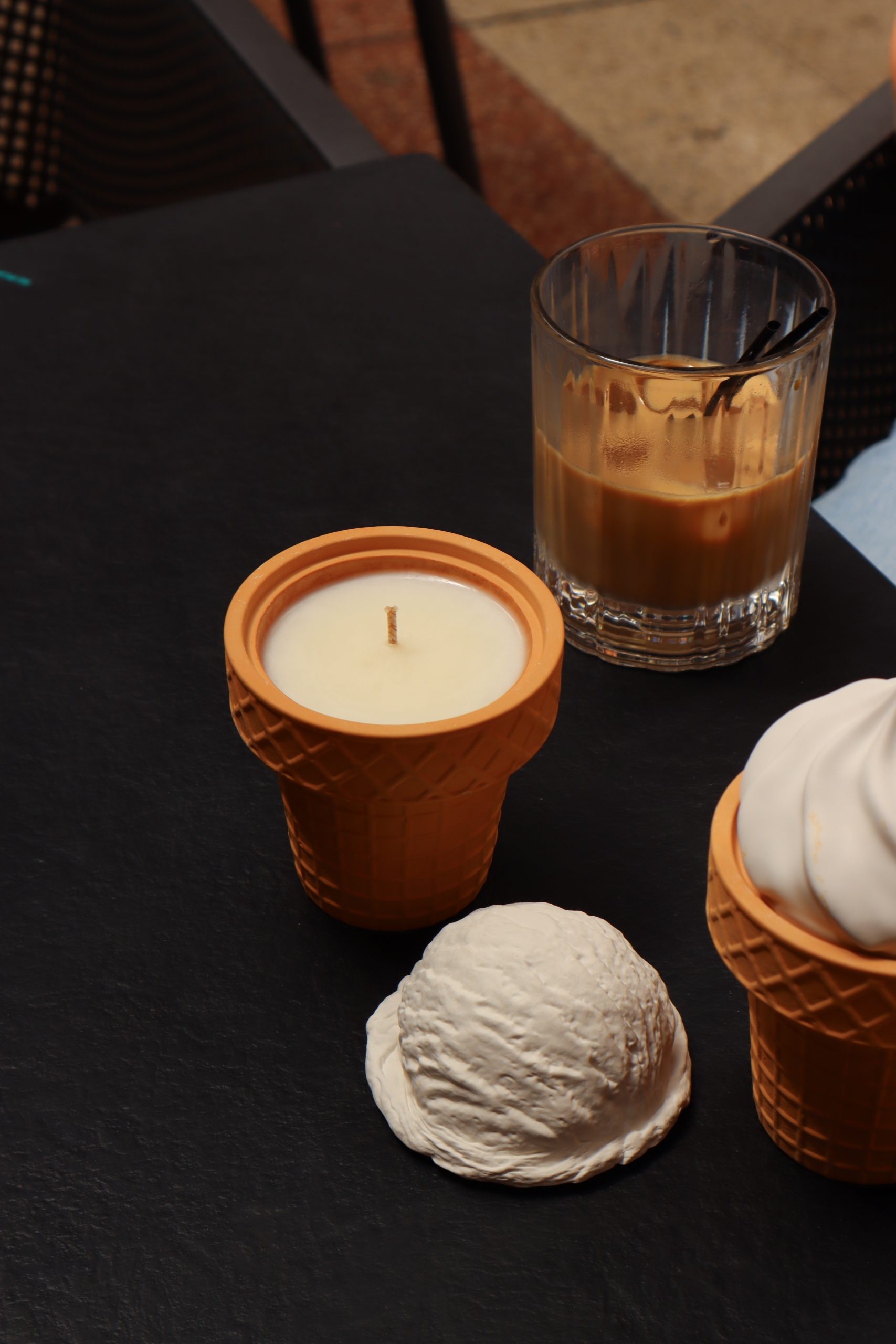 Свічка залита у стильне гіпсове кашпо ручної роботи, натхнене формами та відтінками улюбленого десерту. Кожен виріб — унікальний, створений з любовʼю до деталей.