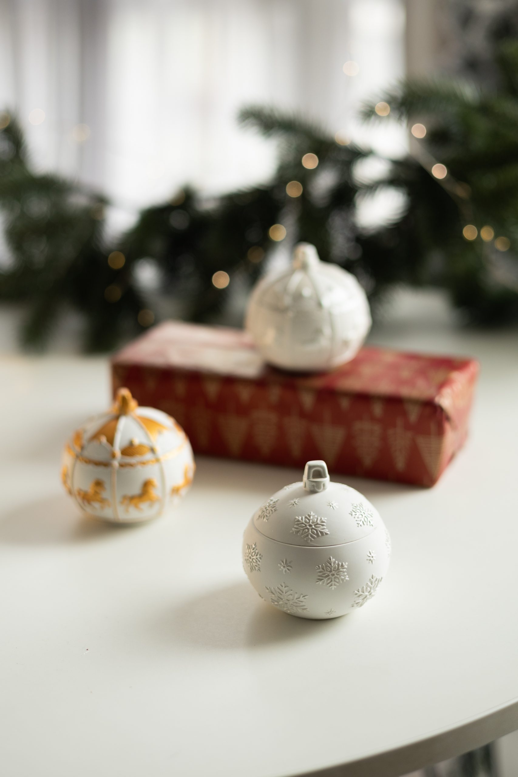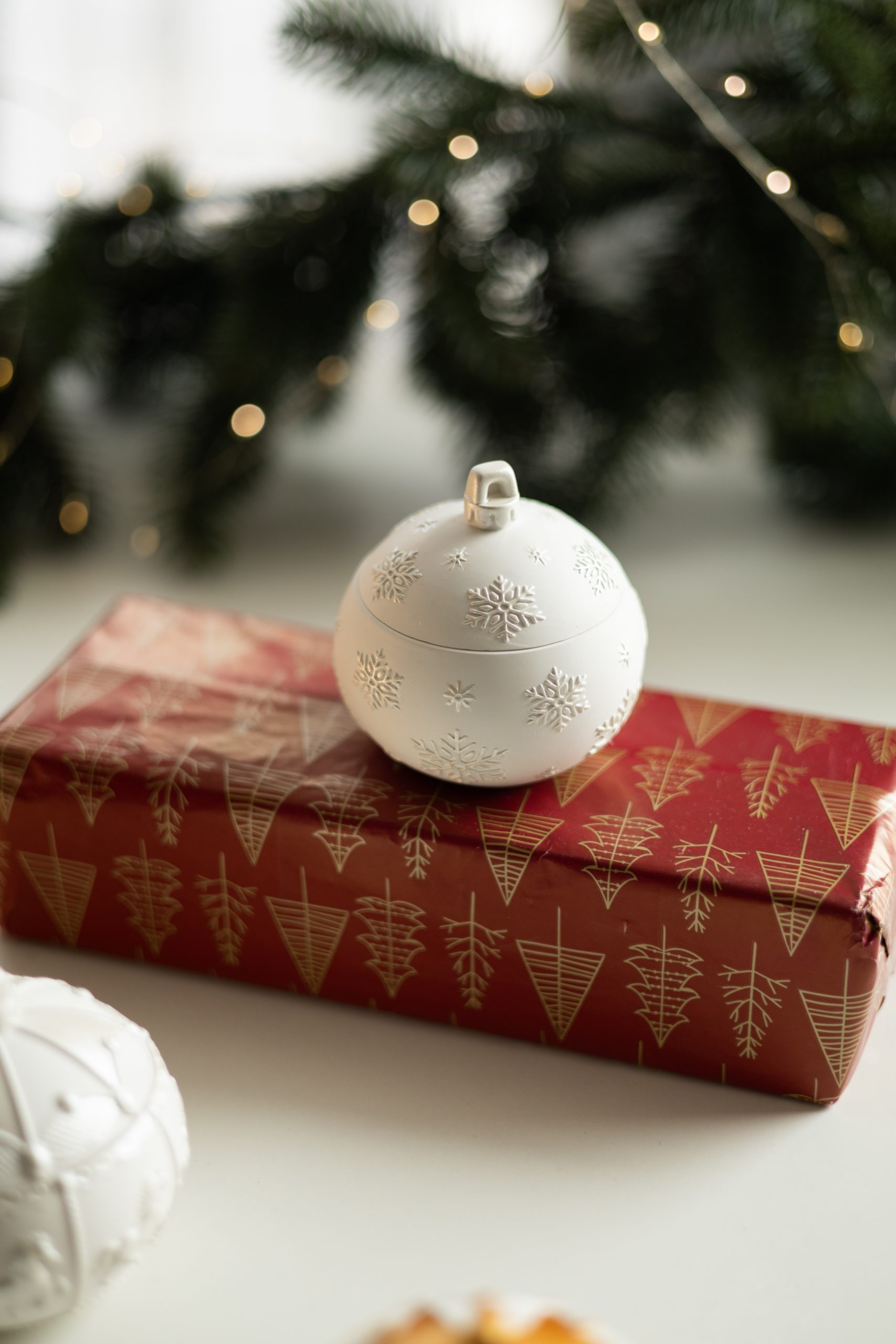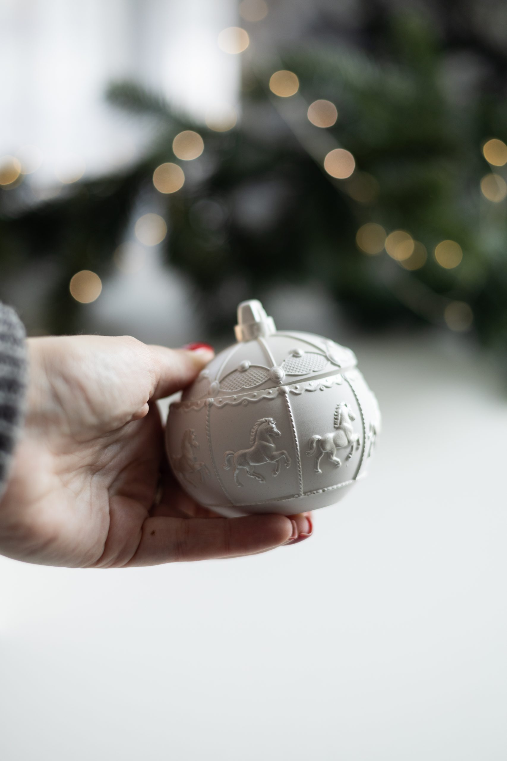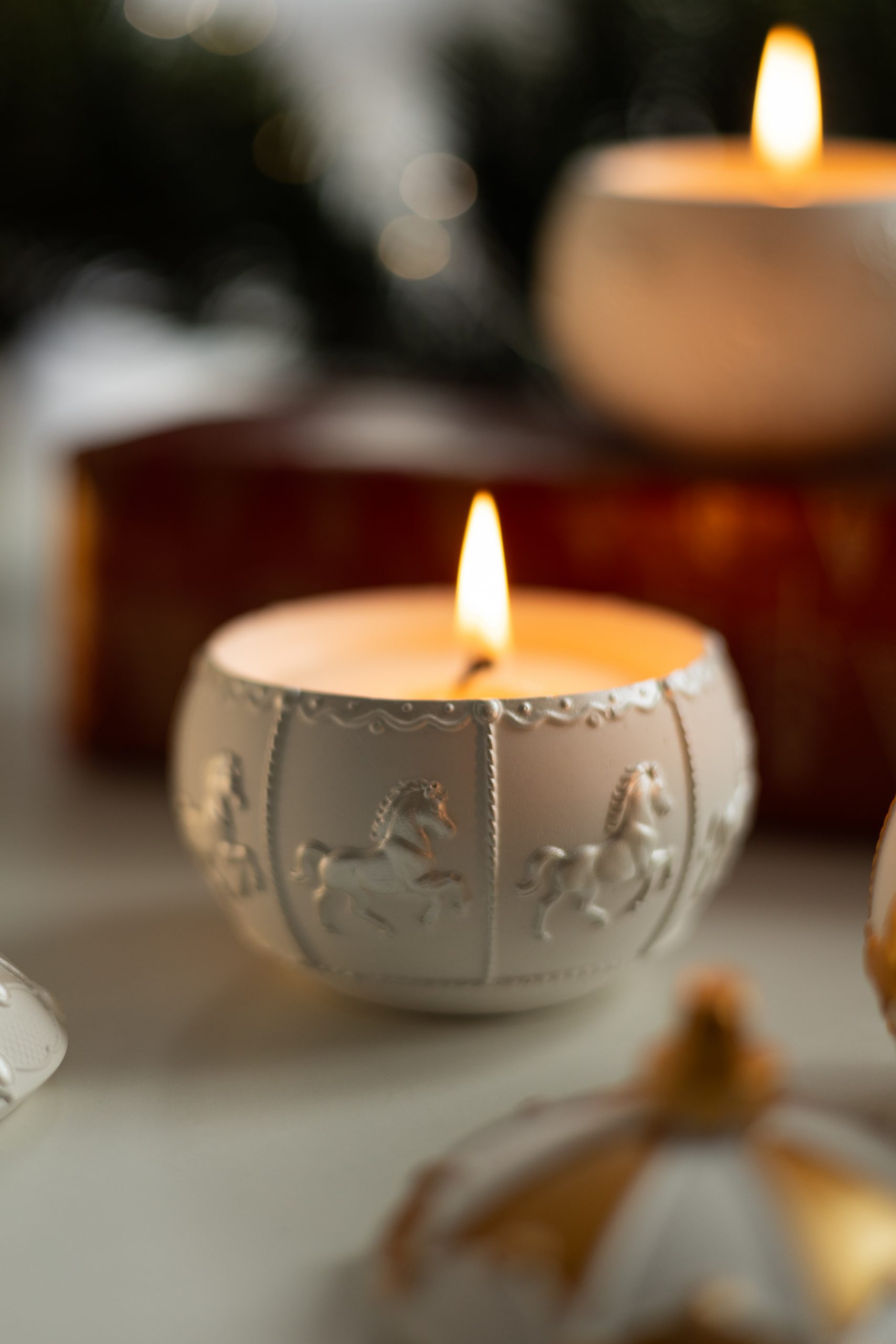 🕯️ Свічка в гіпсовому кашпо “Новорічна куля” – це поєднання затишку, стилю та ручної роботи. Корпус прикрашений ніжним малюнком сніжинок або коників у вигляді каруселей, а кришка доповнена тримачем для стрічки, що надає виробу особливого шарму.