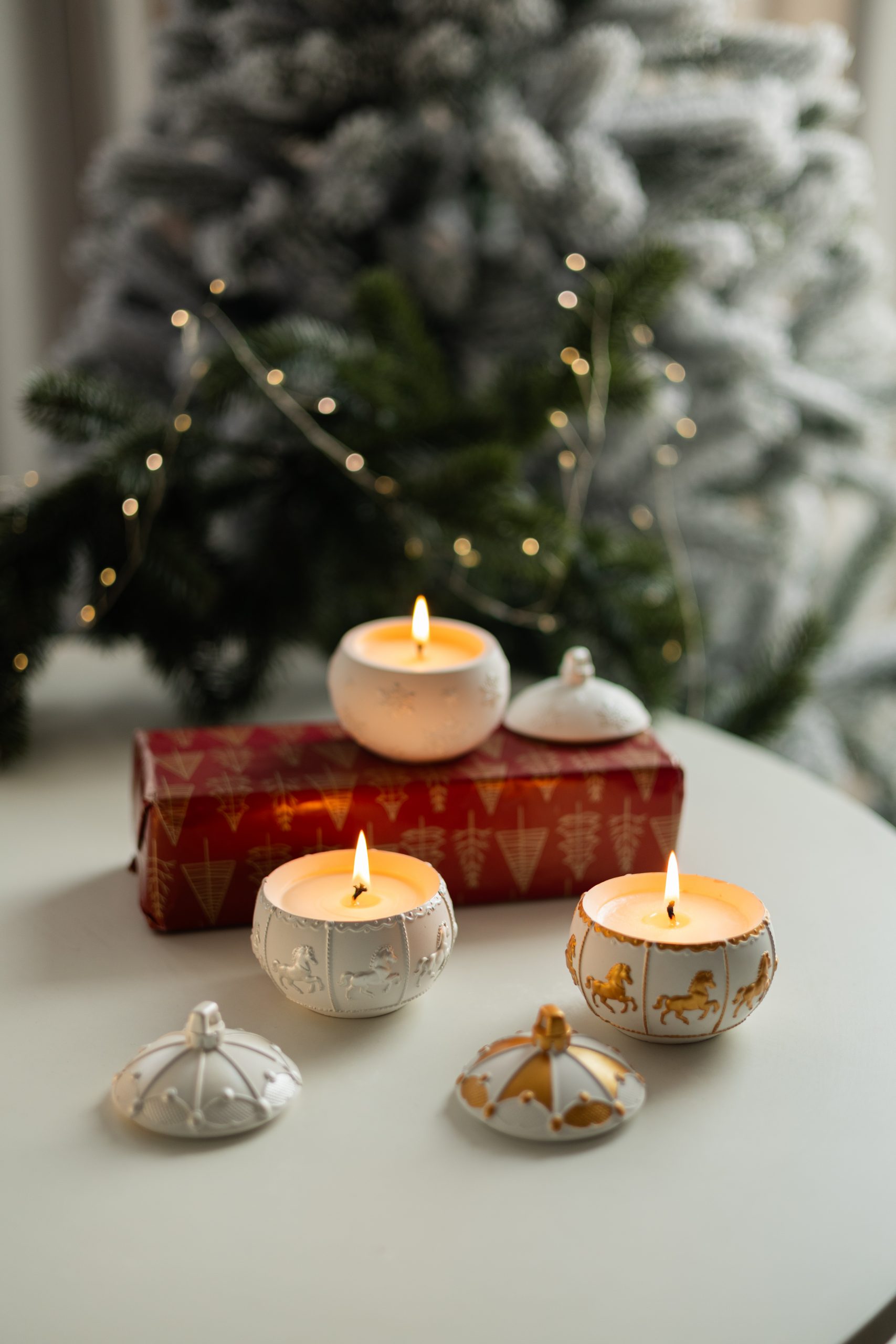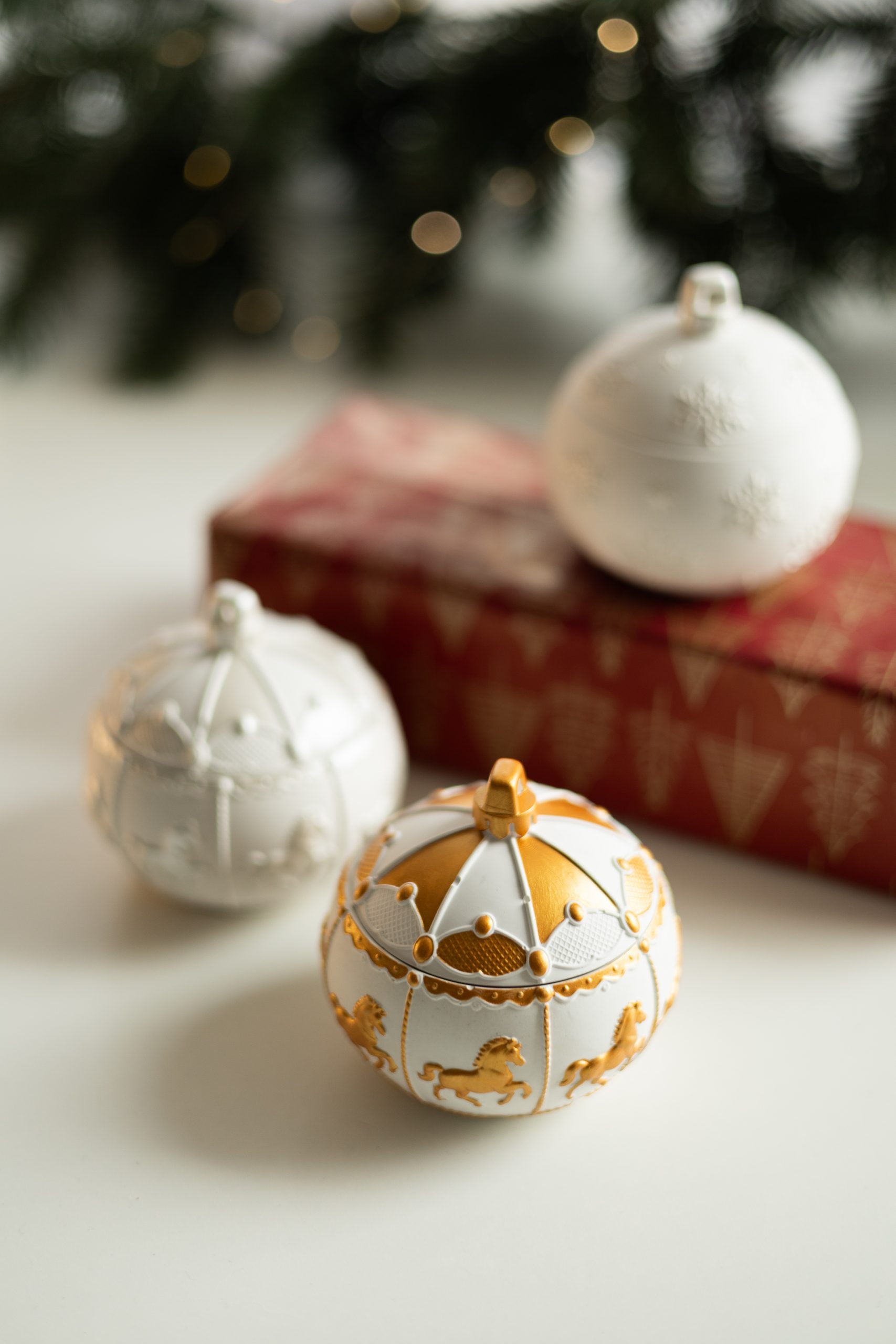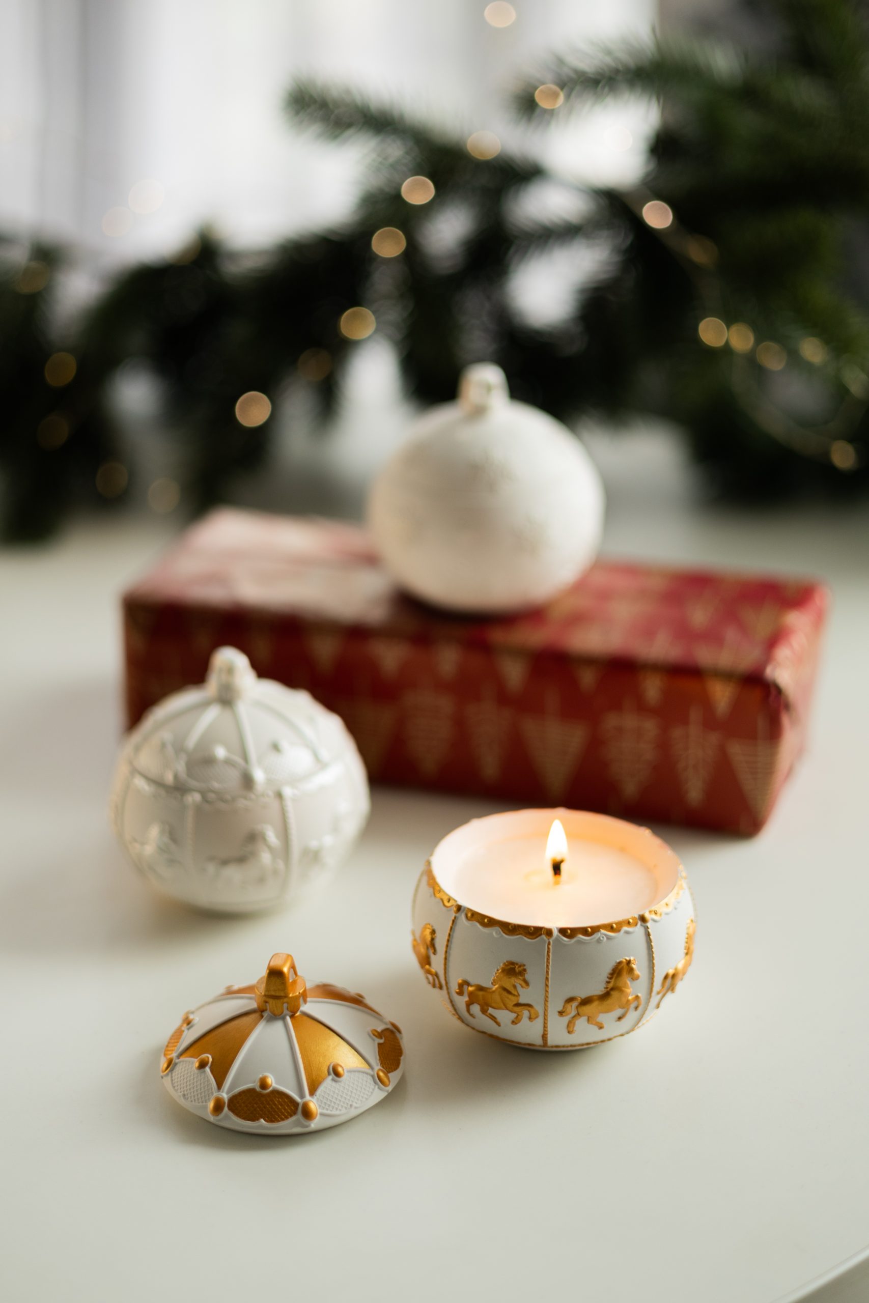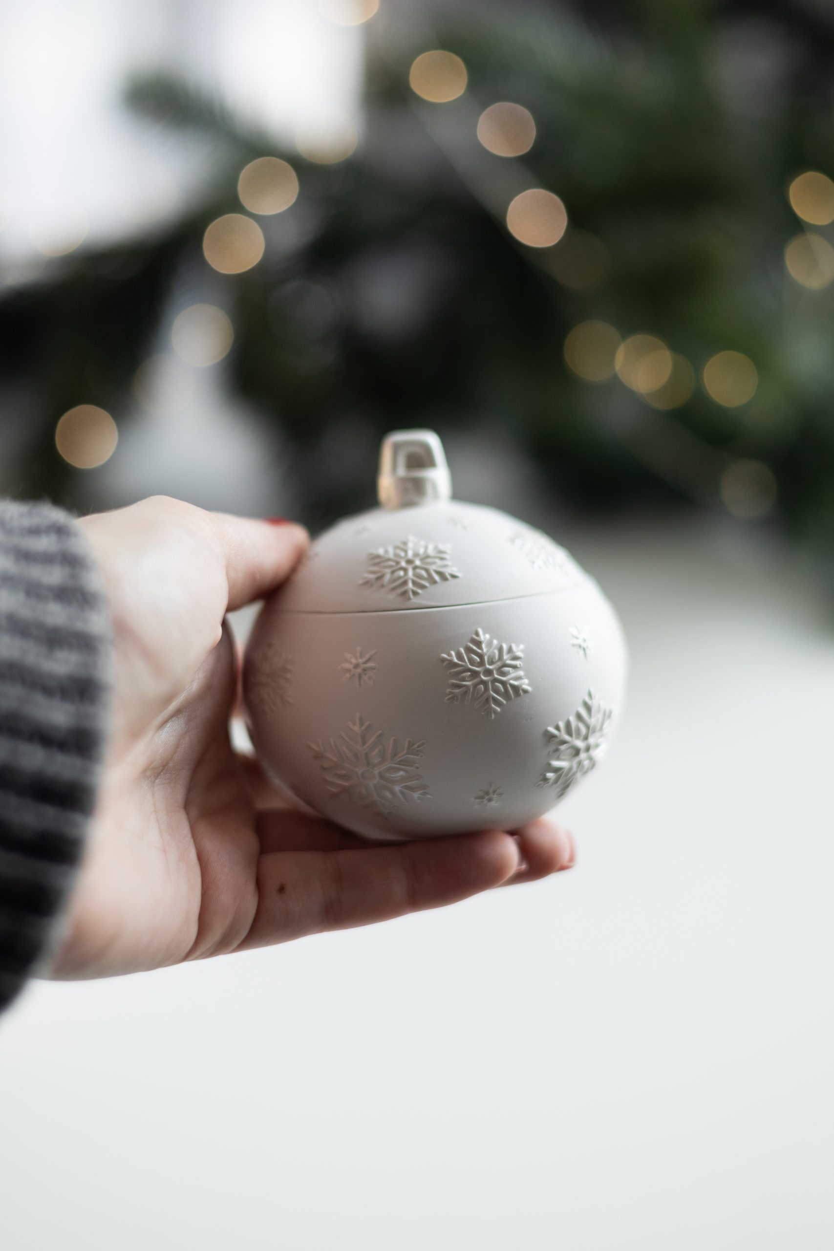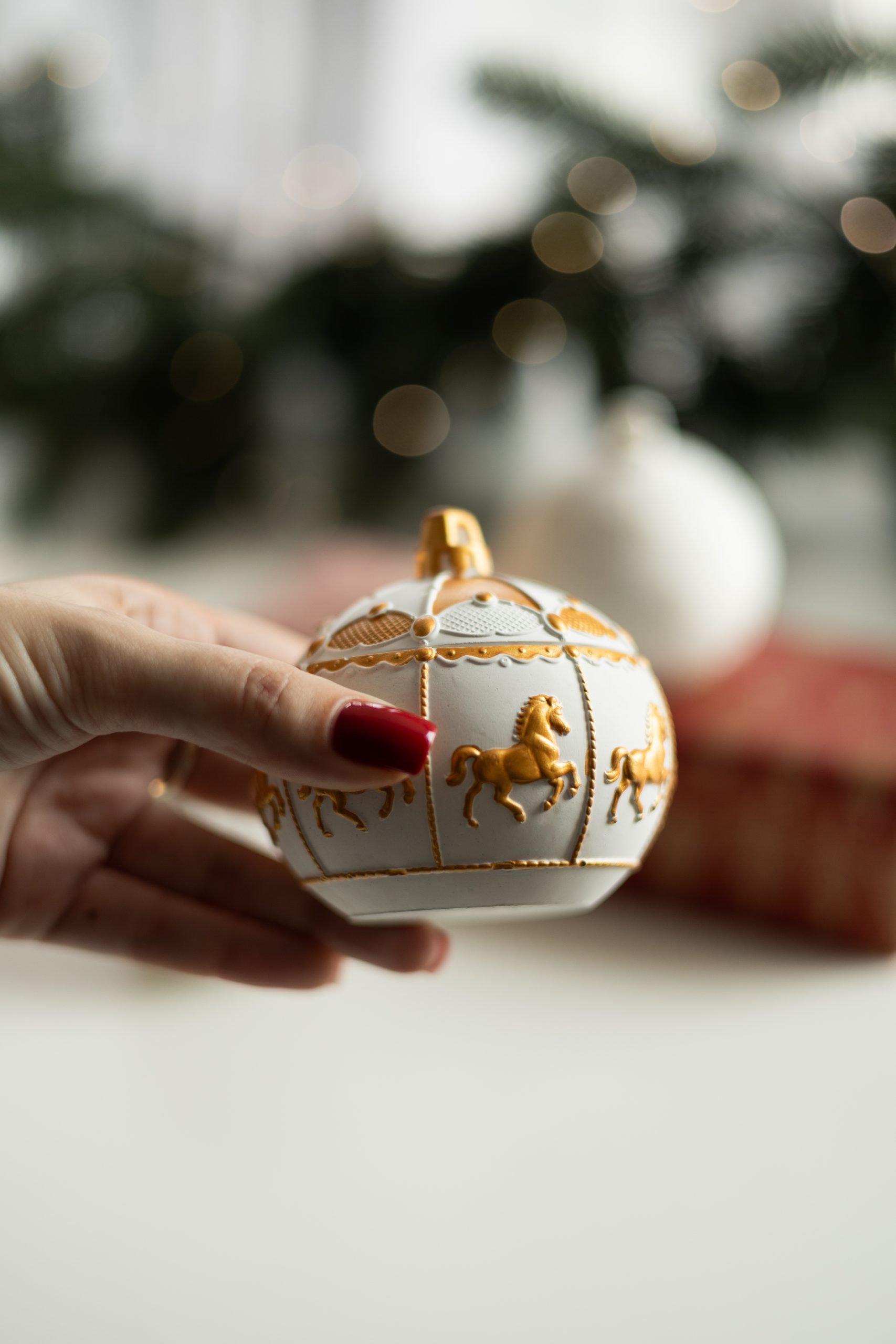 🕯️ Свічка в гіпсовому кашпо “Новорічна куля” – це поєднання затишку, стилю та ручної роботи. Корпус прикрашений ніжним малюнком сніжинок або коників у вигляді каруселей, а кришка доповнена тримачем для стрічки, що надає виробу особливого шарму.