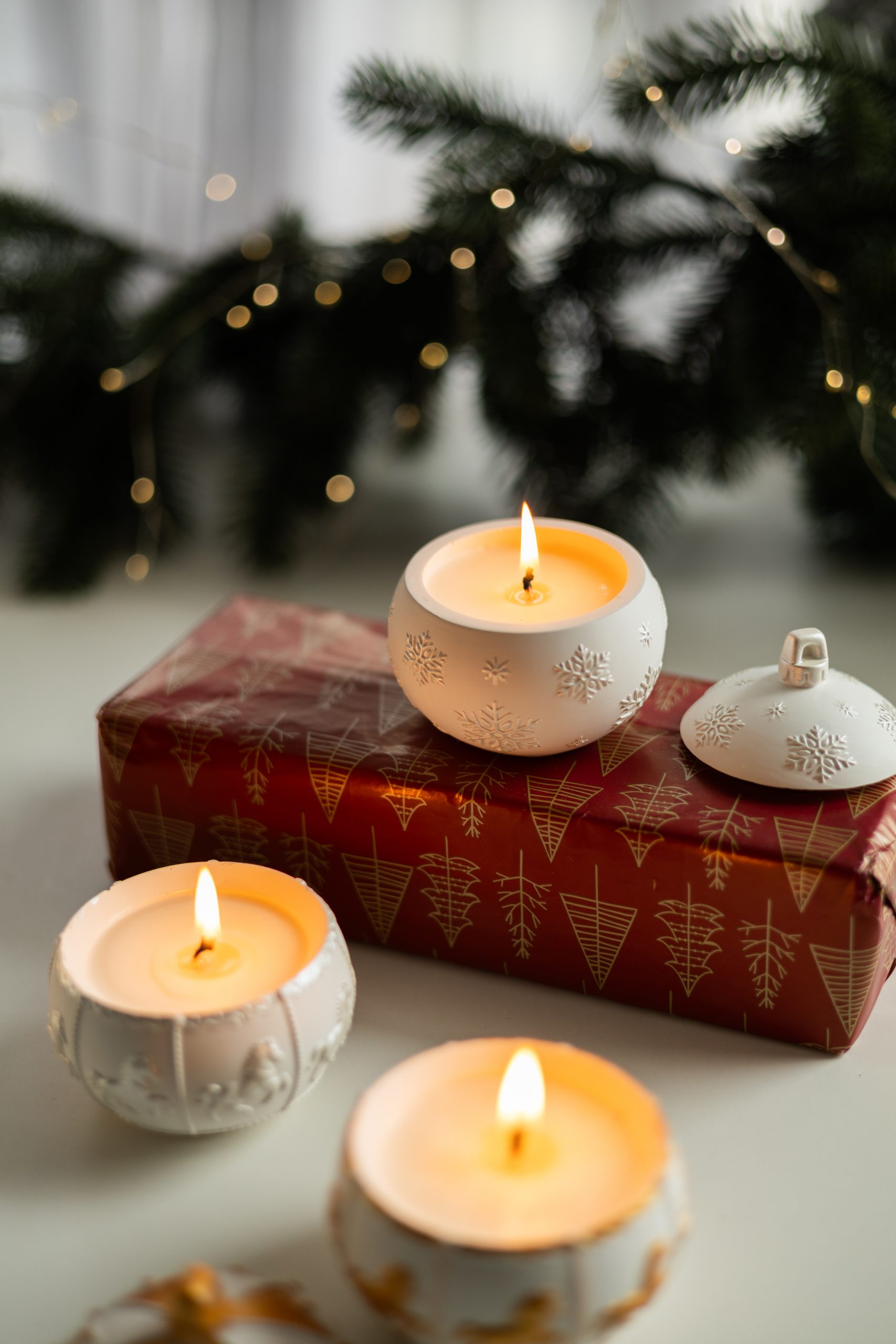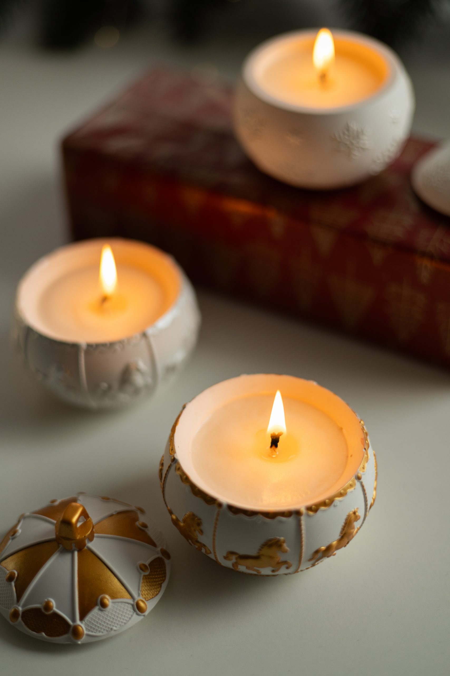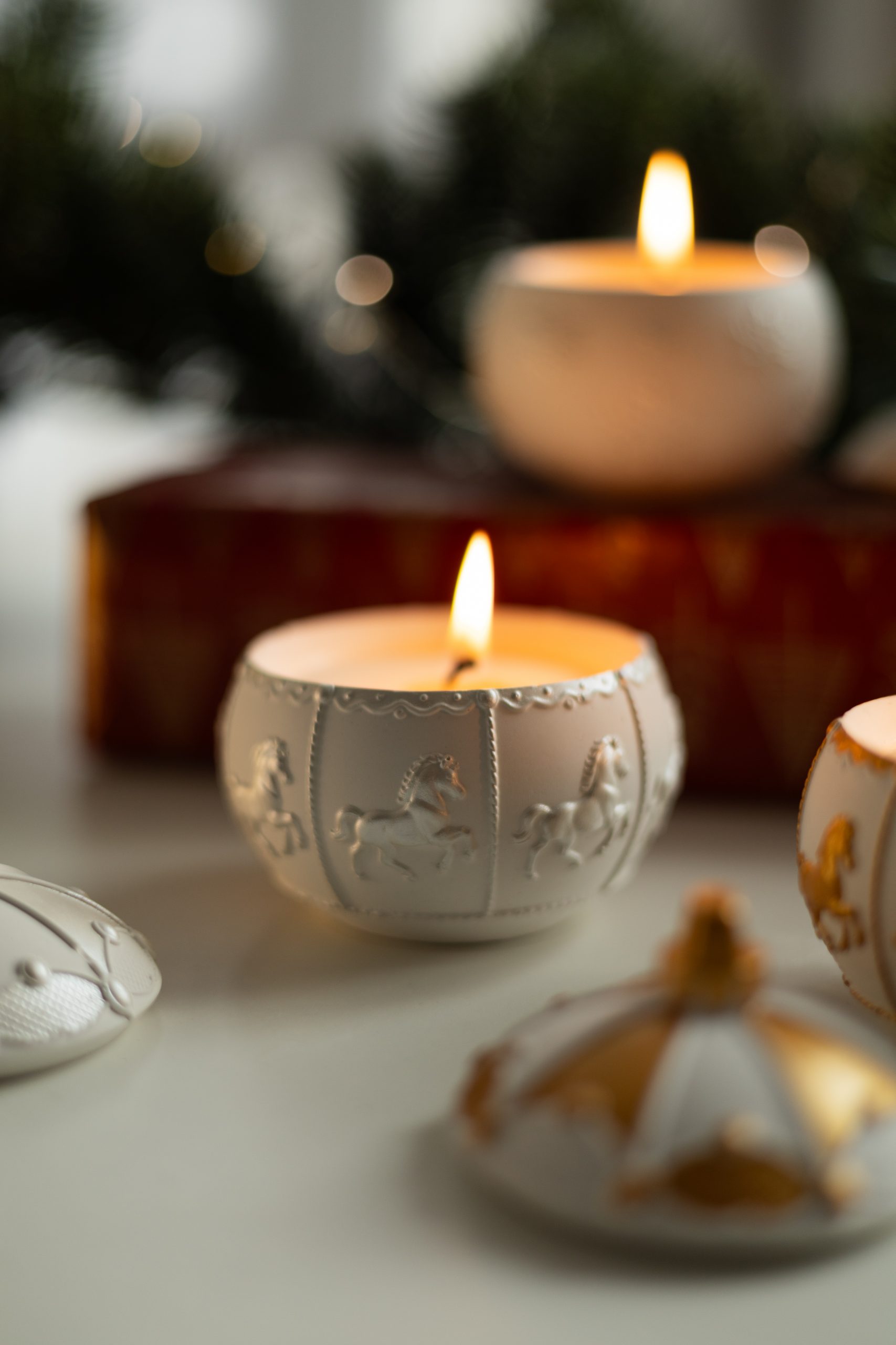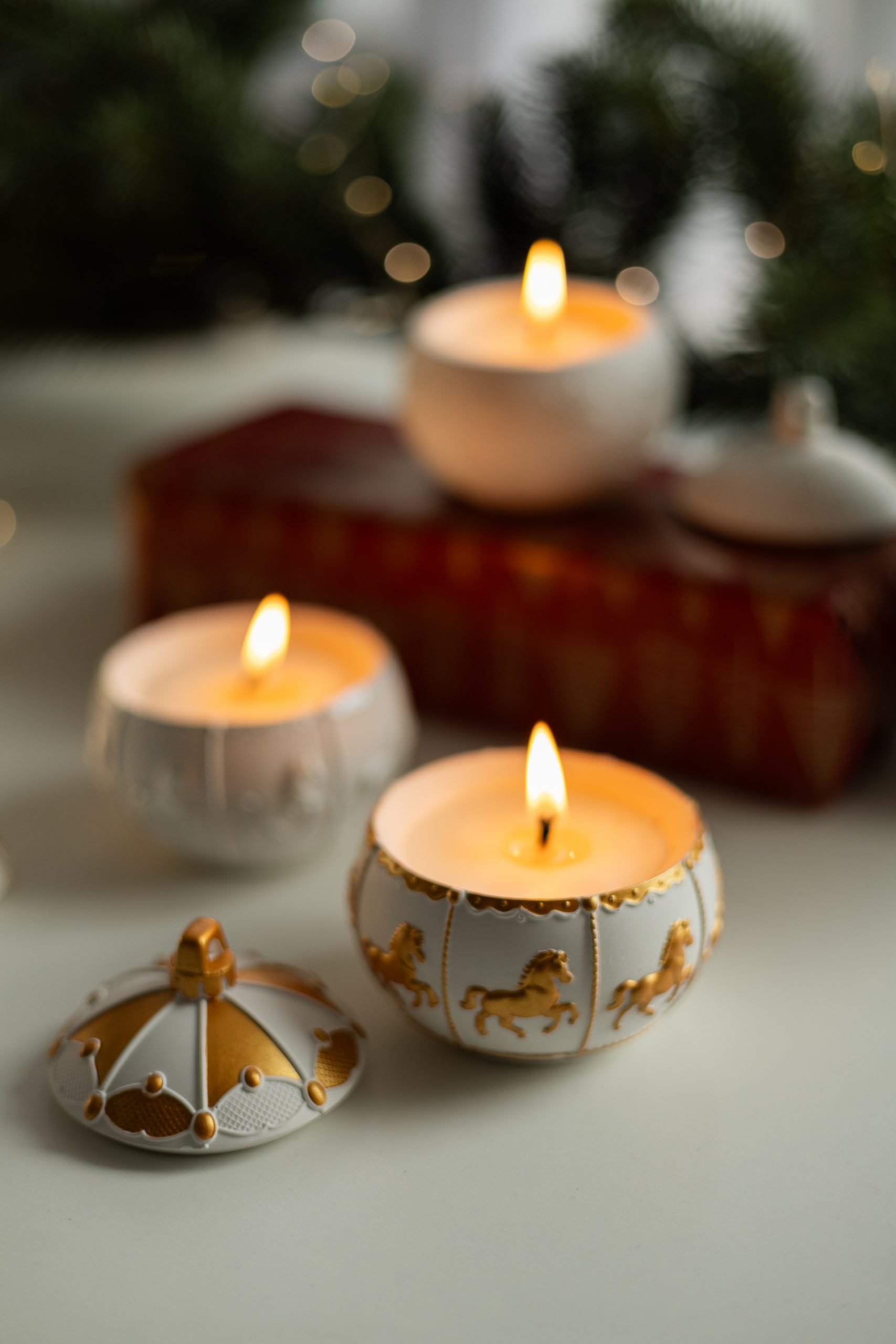 🕯️ Свічка в гіпсовому кашпо “Новорічна куля” – це поєднання затишку, стилю та ручної роботи. Корпус прикрашений ніжним малюнком сніжинок або коників у вигляді каруселей, а кришка доповнена тримачем для стрічки, що надає виробу особливого шарму.