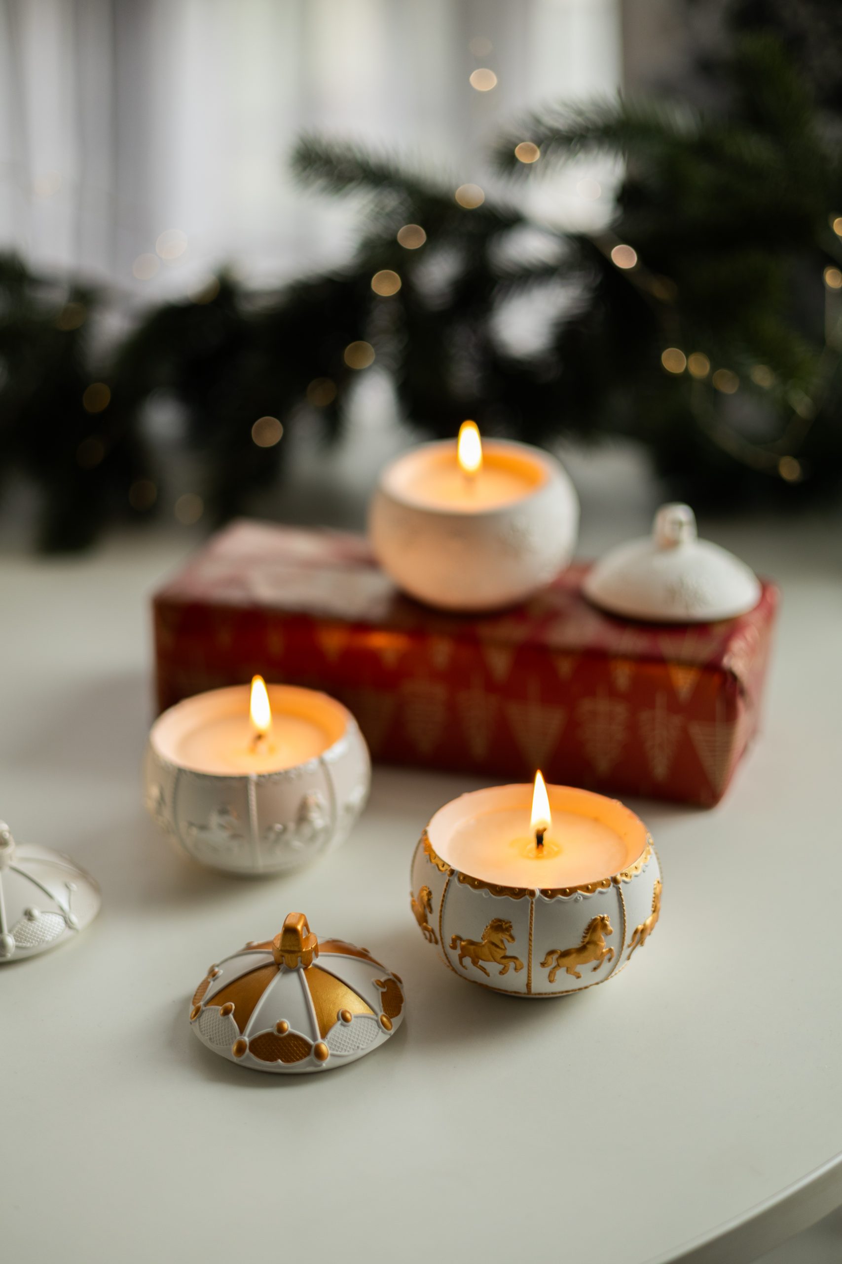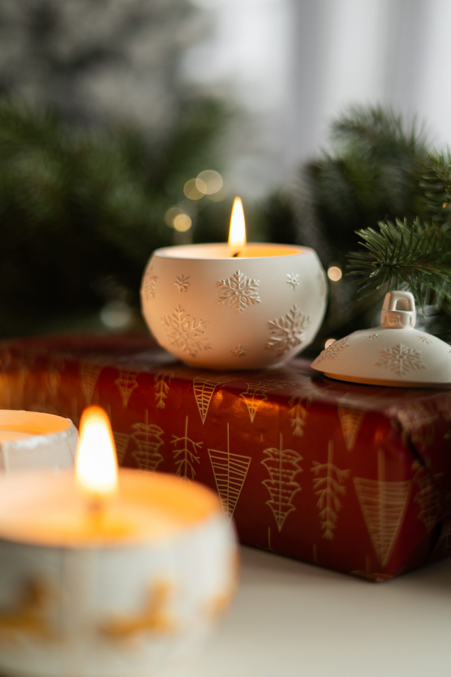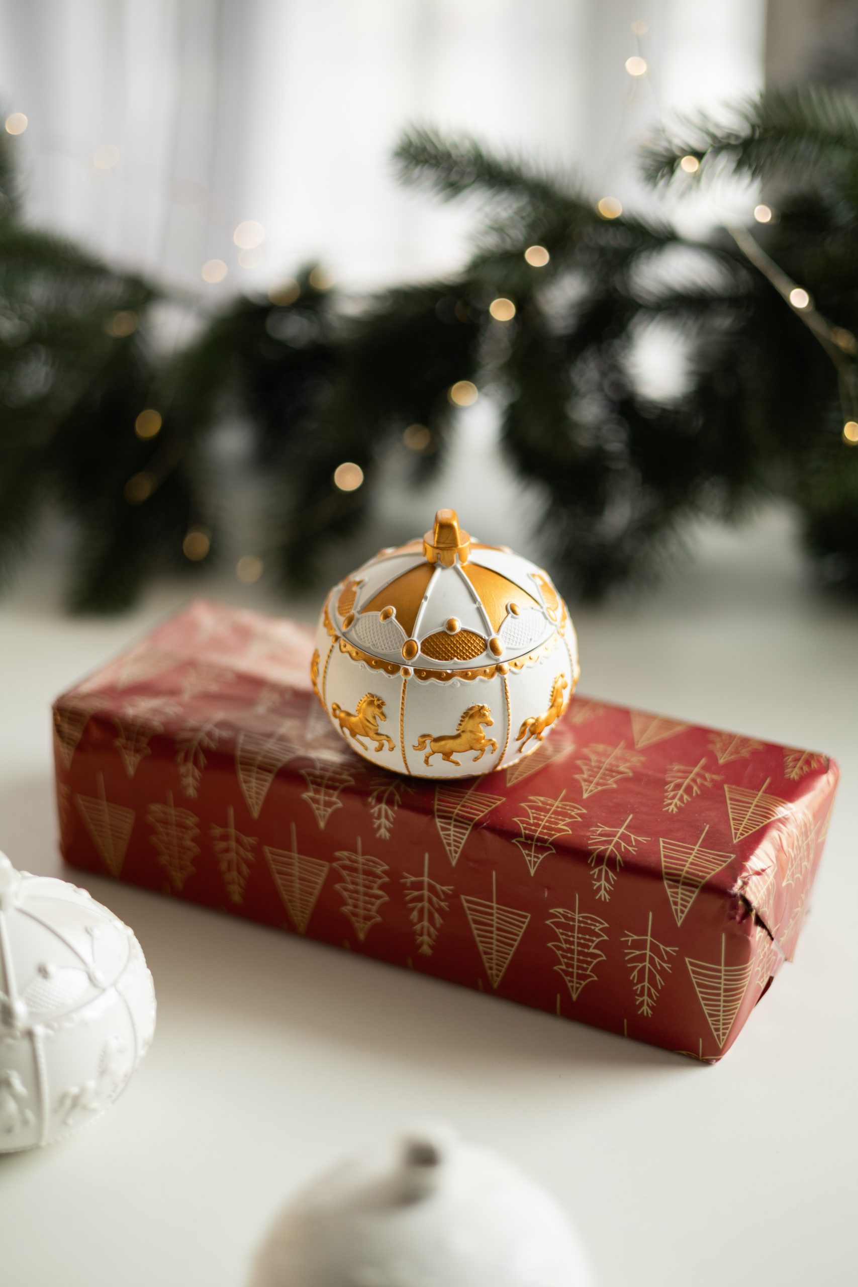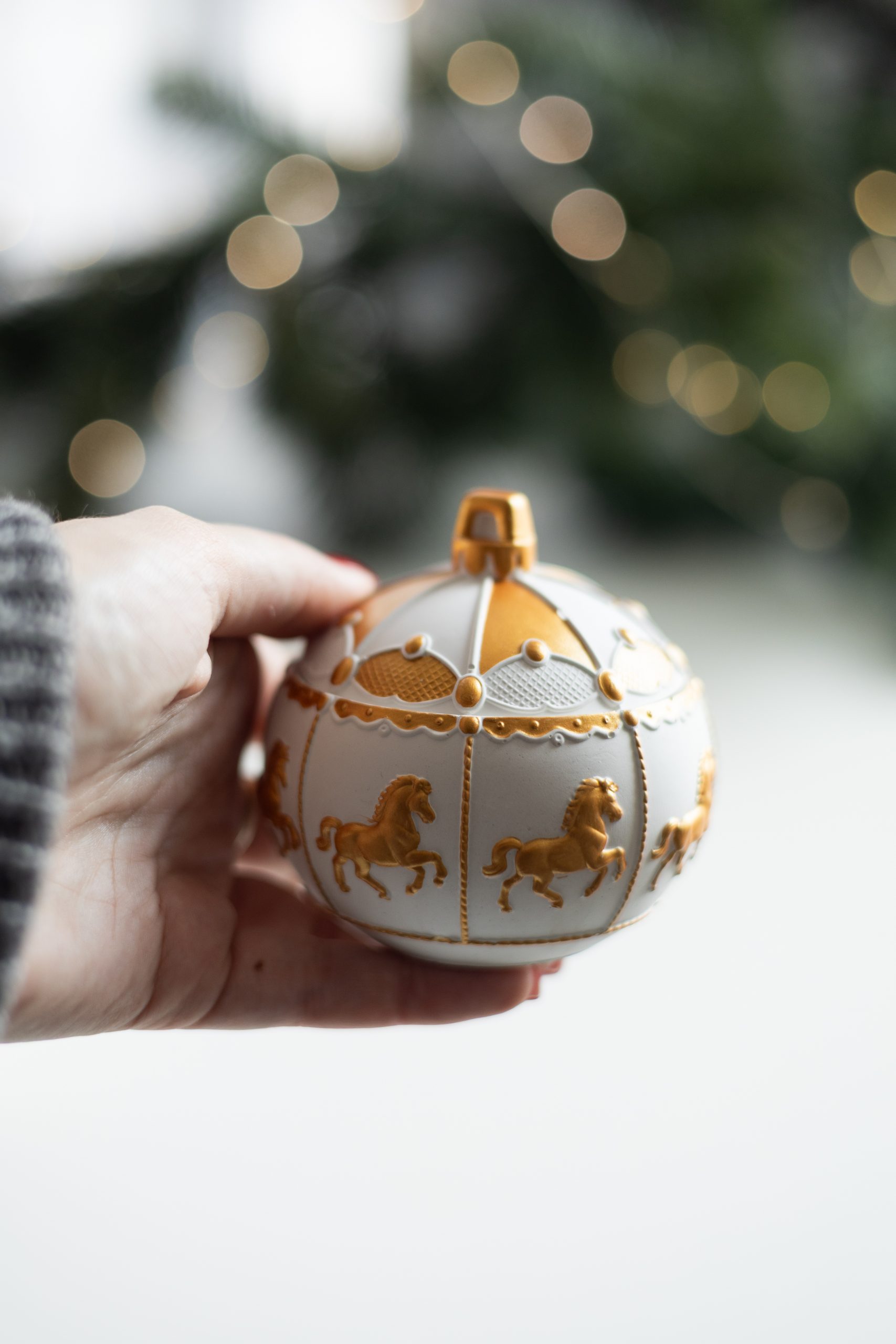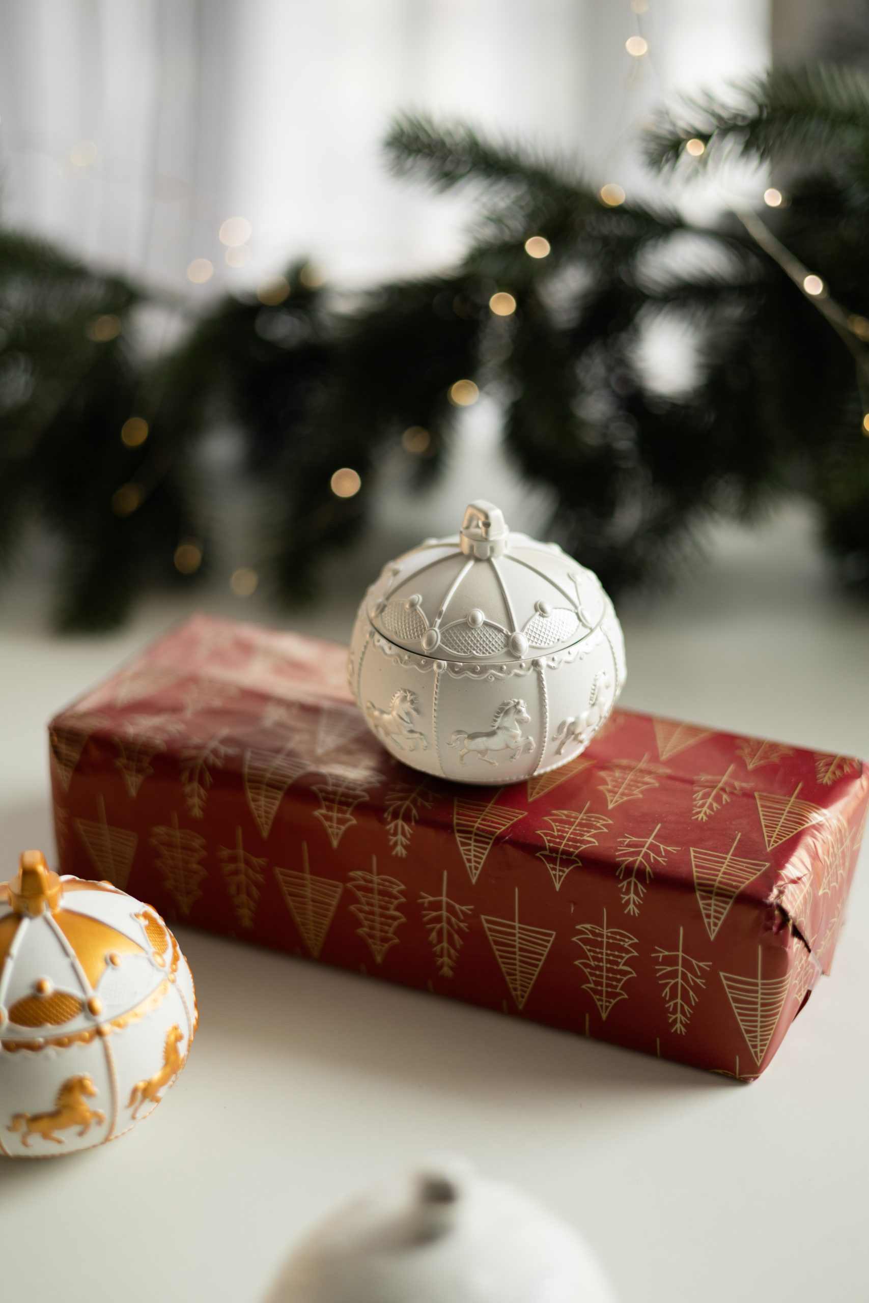 🕯️ Свічка в гіпсовому кашпо “Новорічна куля” – це поєднання затишку, стилю та ручної роботи. Корпус прикрашений ніжним малюнком сніжинок або коників у вигляді каруселей, а кришка доповнена тримачем для стрічки, що надає виробу особливого шарму.