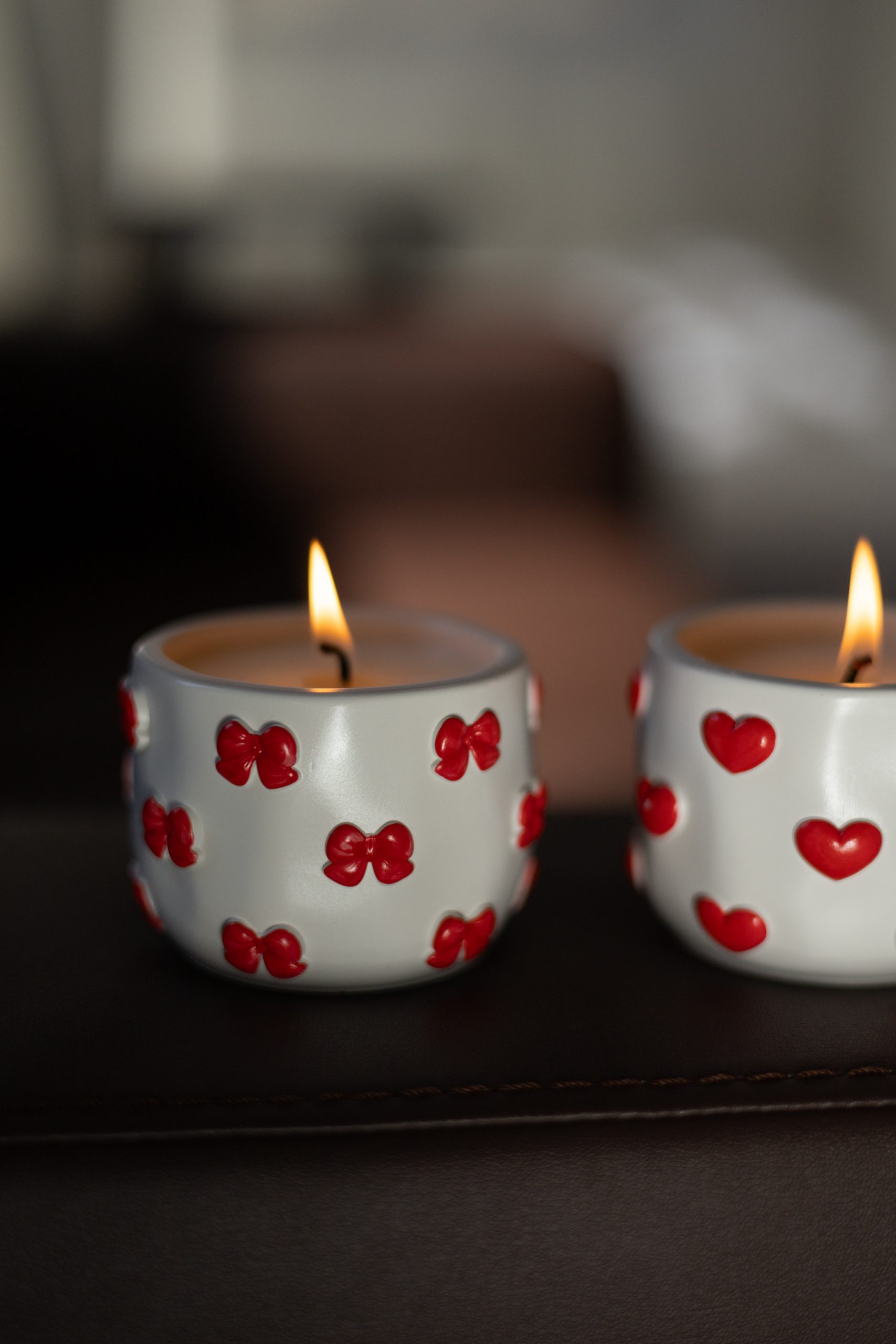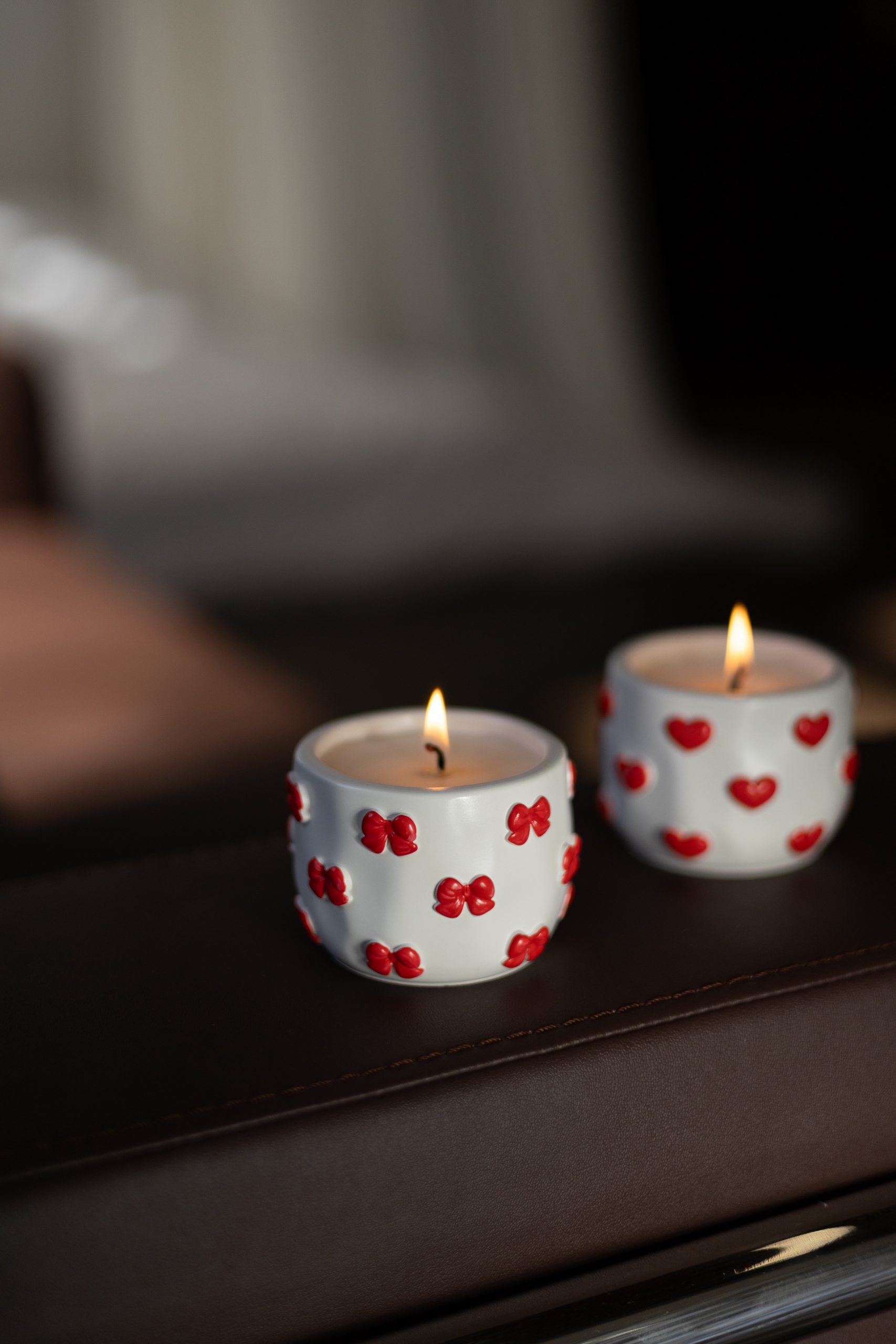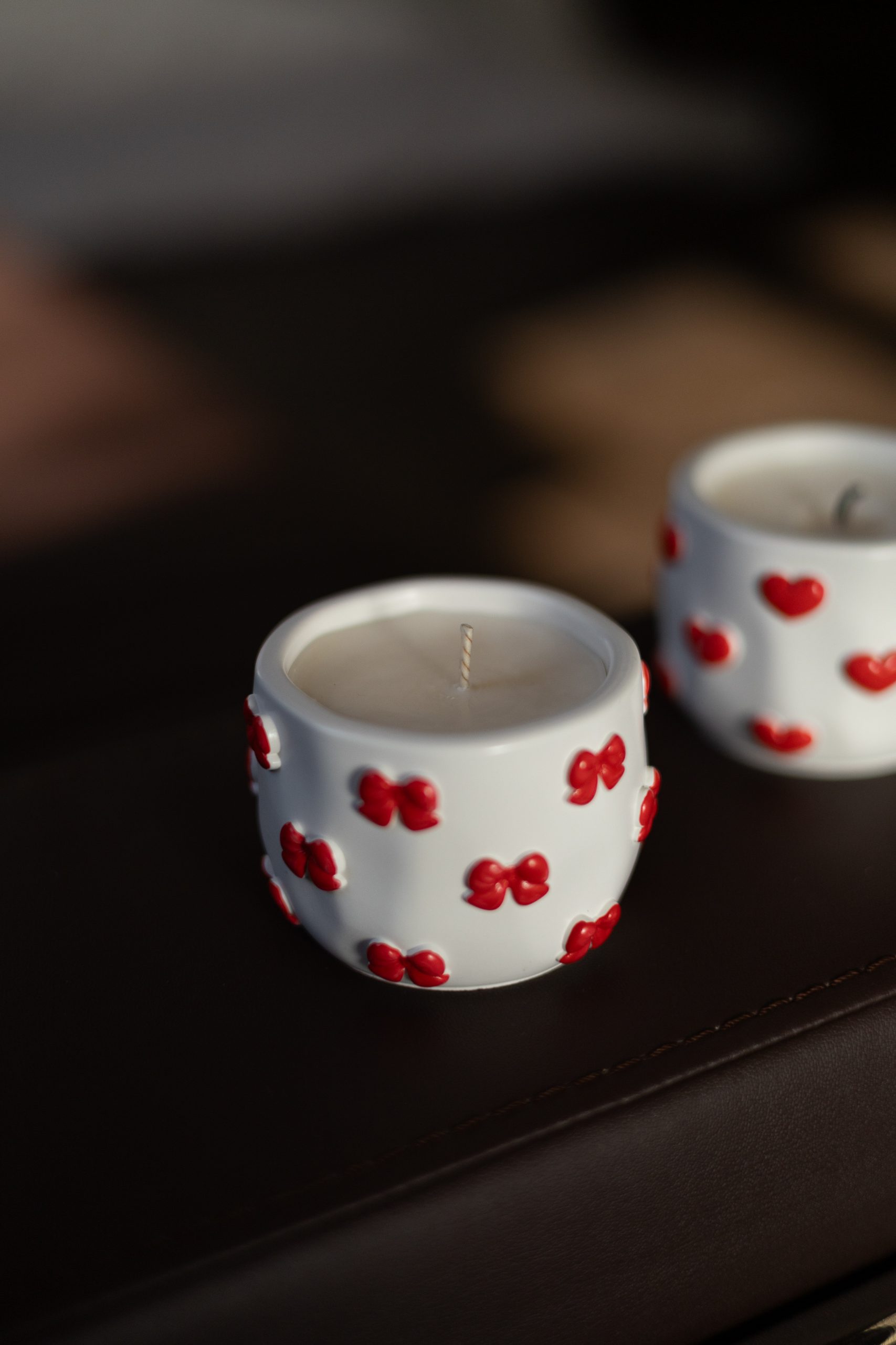 Свічка в гіпсовому кашпо “Сердечки та бантики” з соєвого воску, ручної роботи