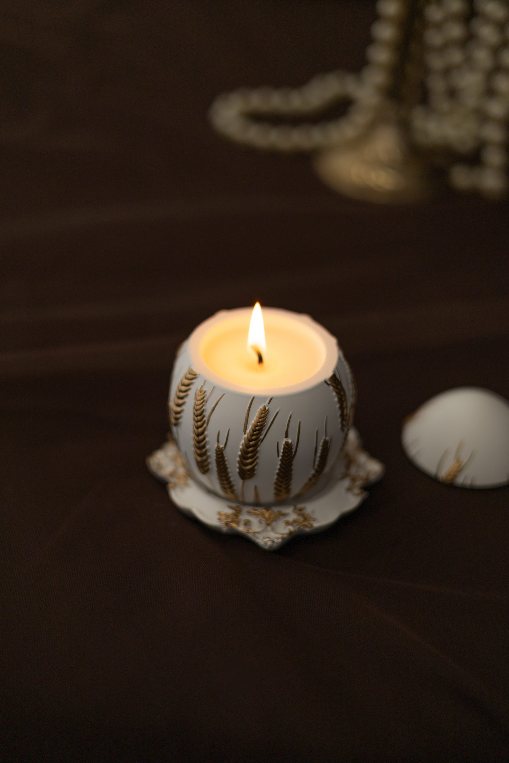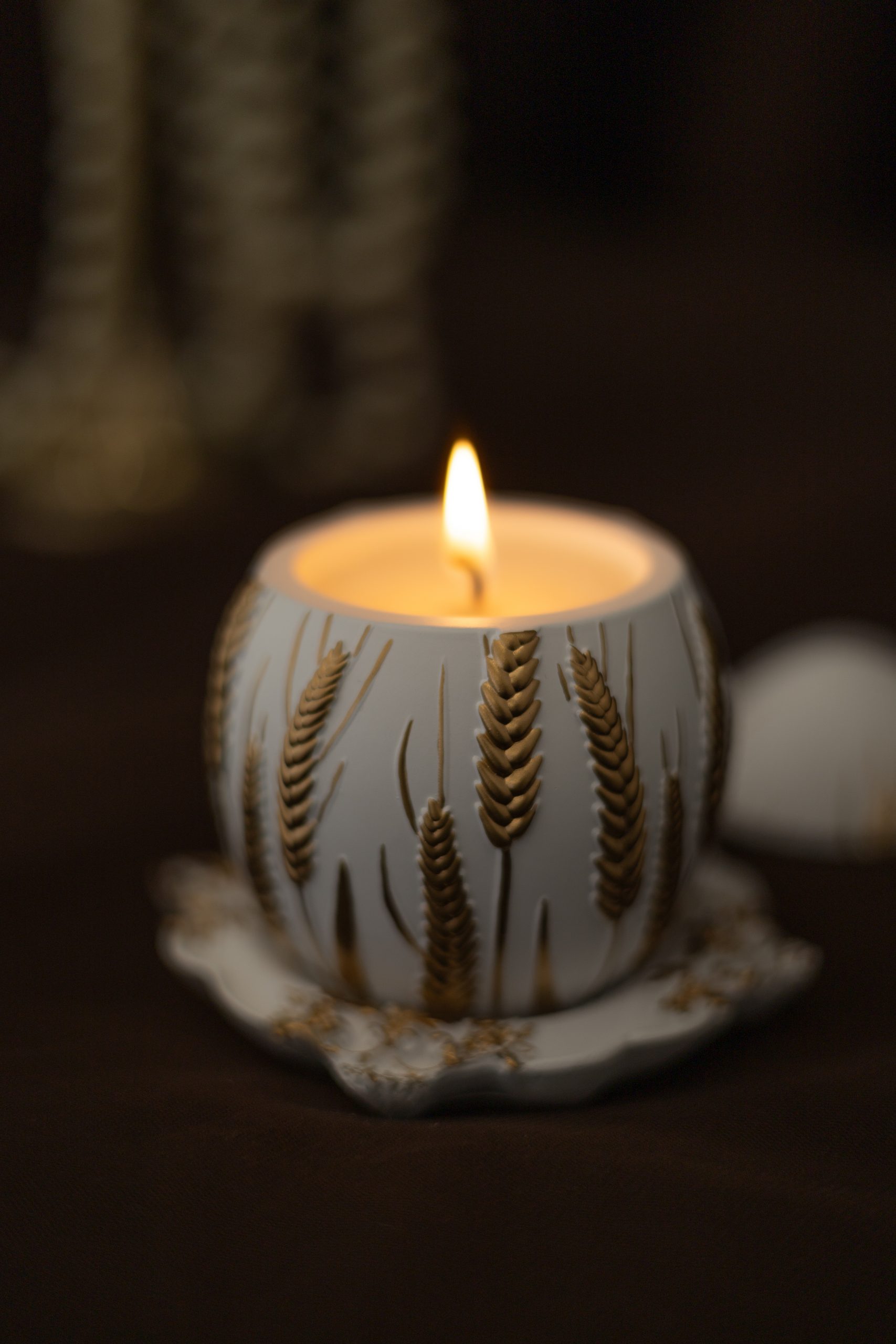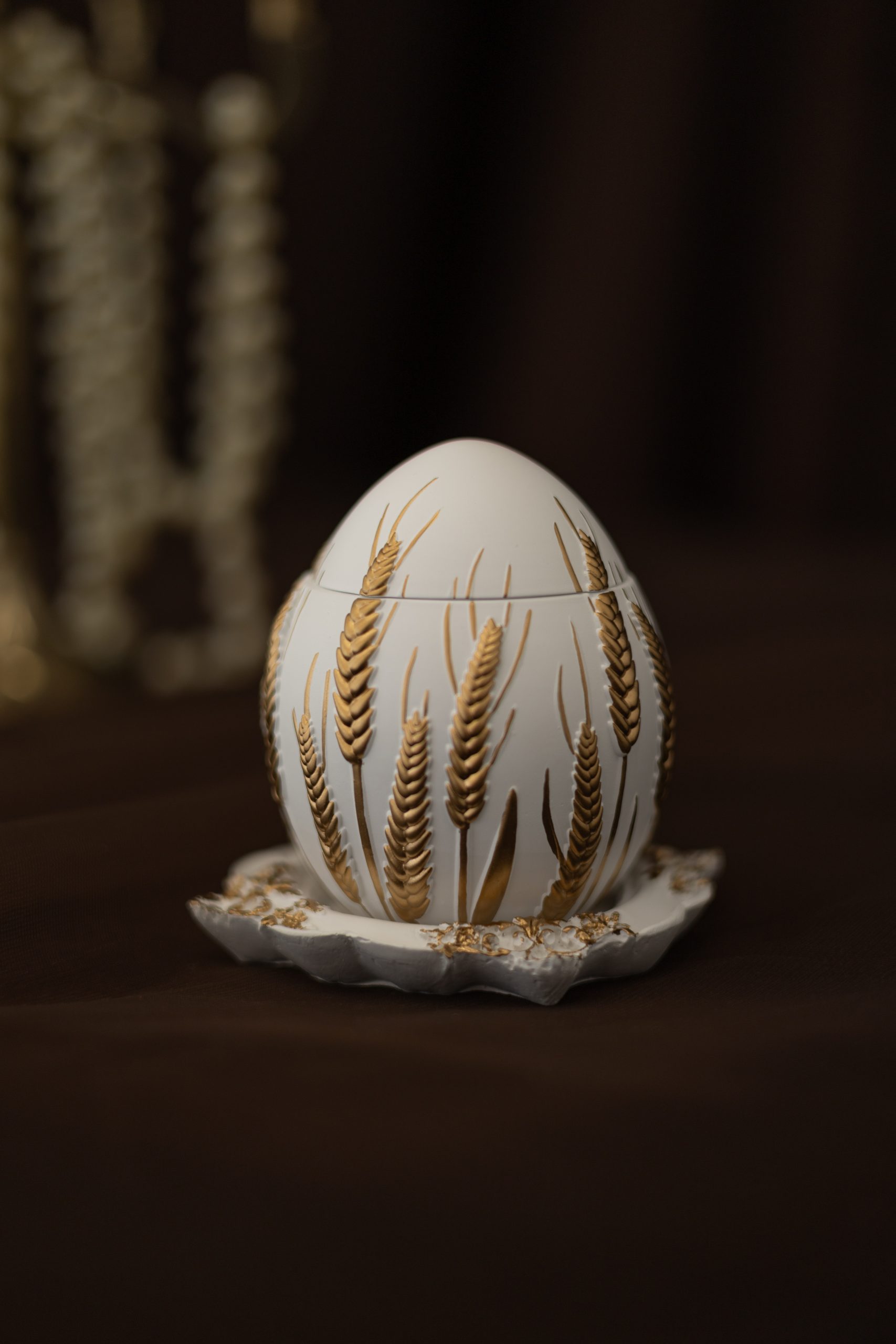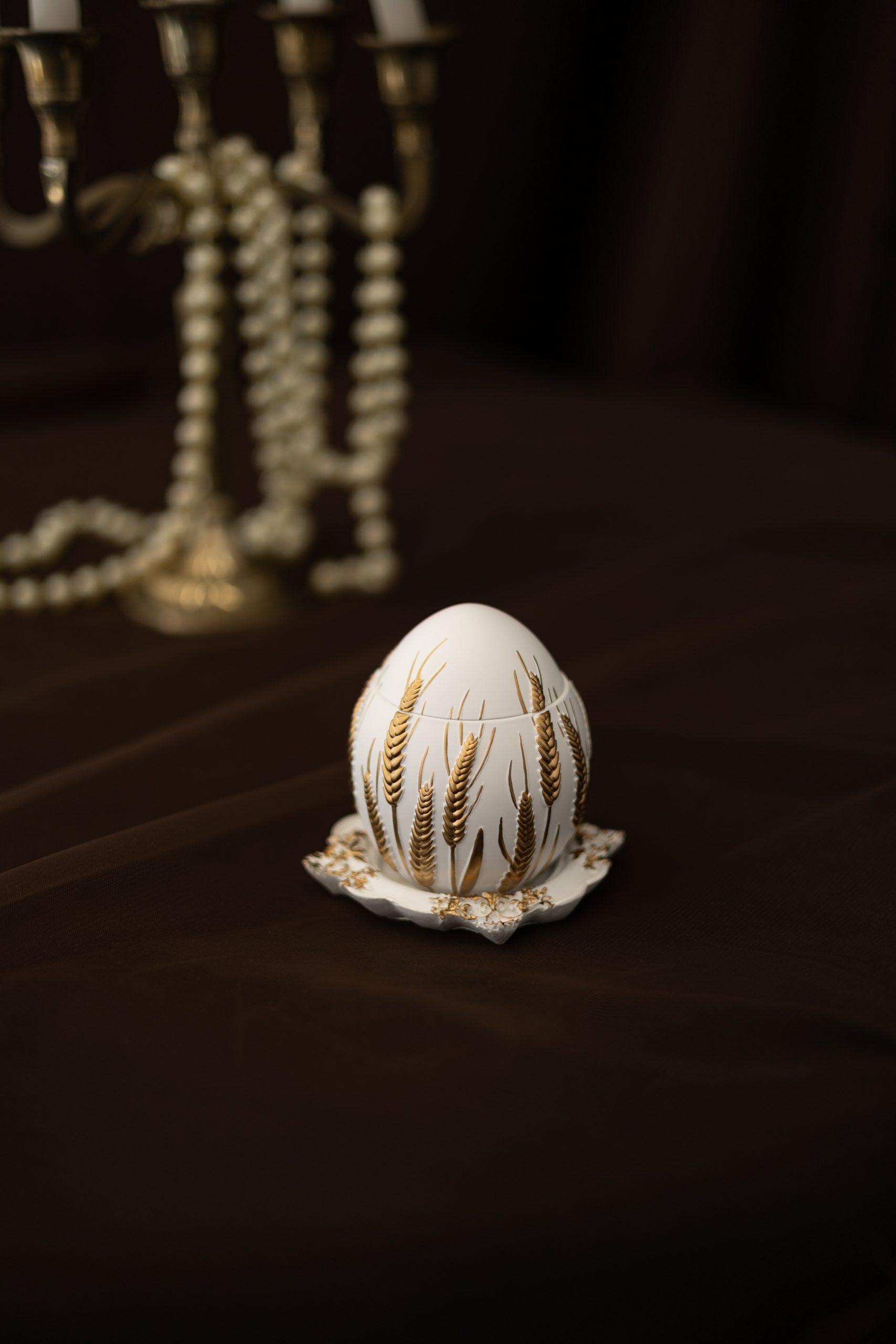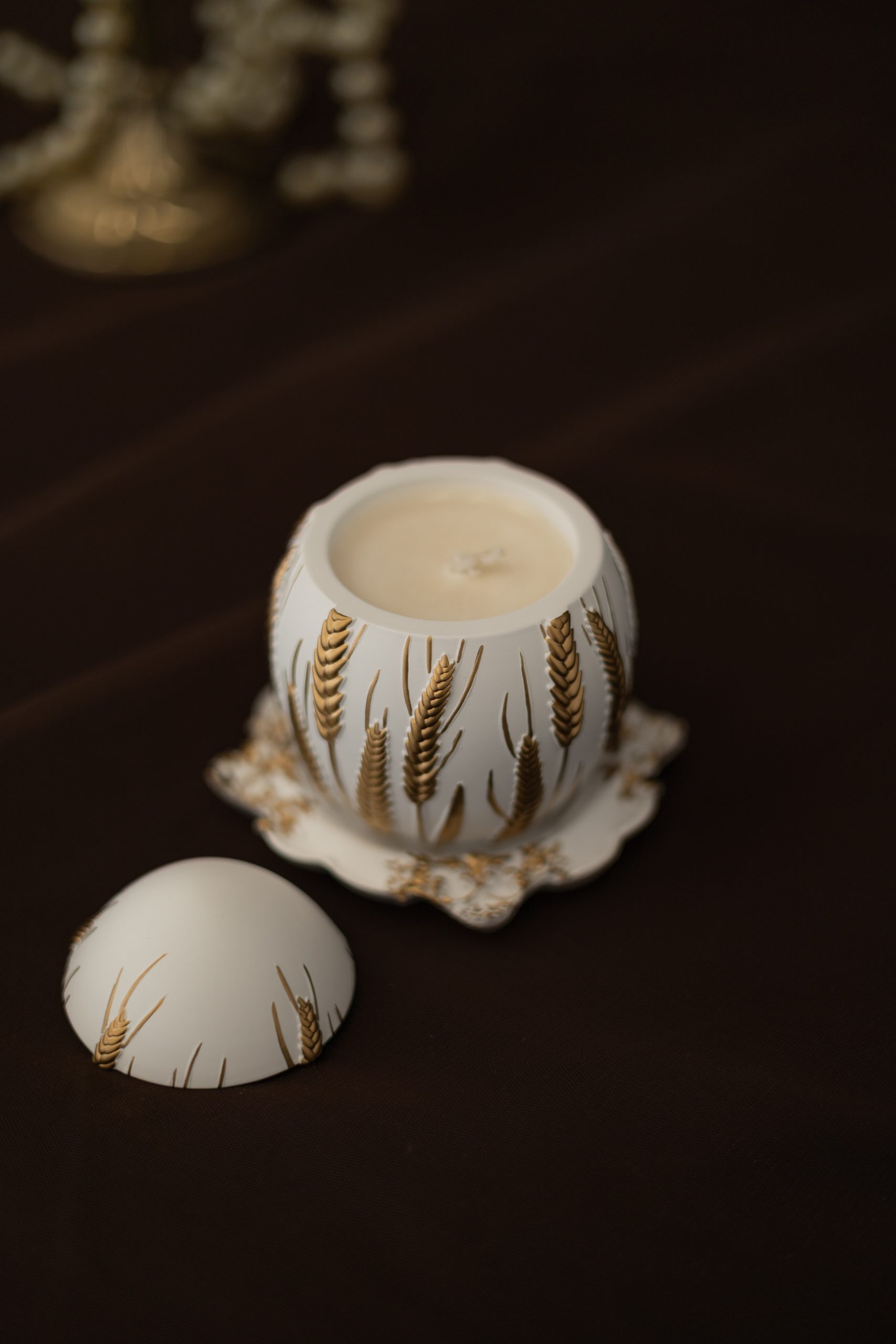 Декор у вигляді колосків, делікатно покритих золотом, надає виробу особливого шарму та відчуття тепла й достатку. У комплекті — гіпсова підставка з витонченим орнаментом, також оздоблена золотими акцентами, що гармонійно доповнює композицію.
