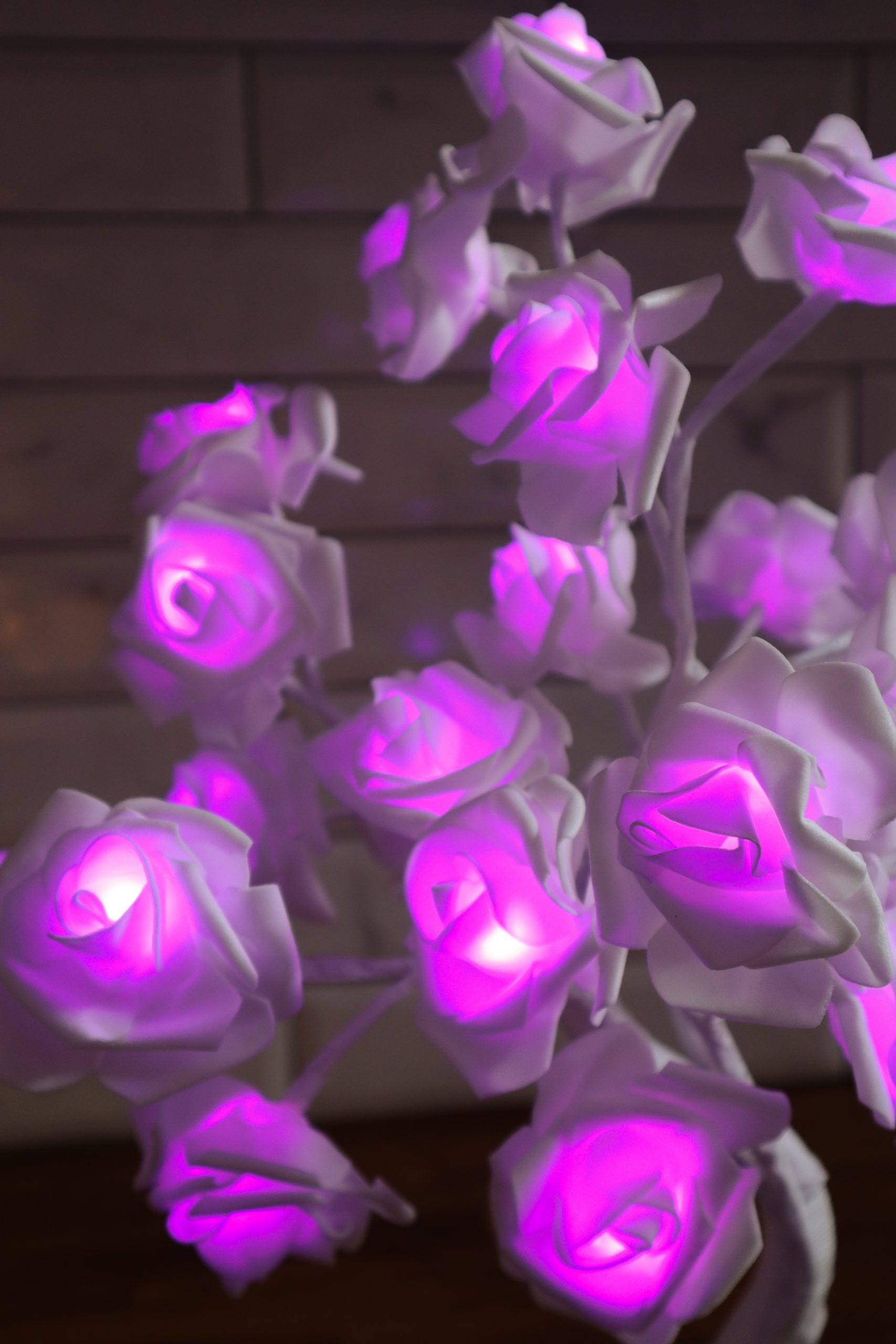 Білі троянди у поєднанні з фіолетовим світлом виглядають неймовірно та створюють затишну атмосферу. Світлодіодні лампочки квітів не нагріваються та є повністю безпечними.