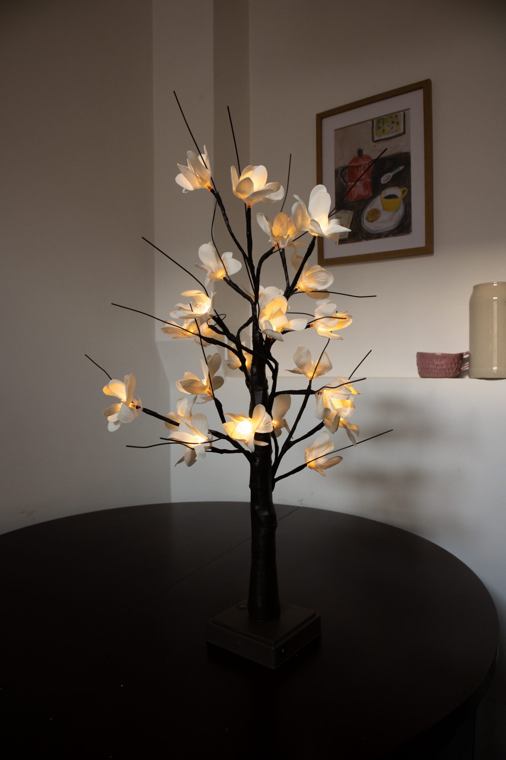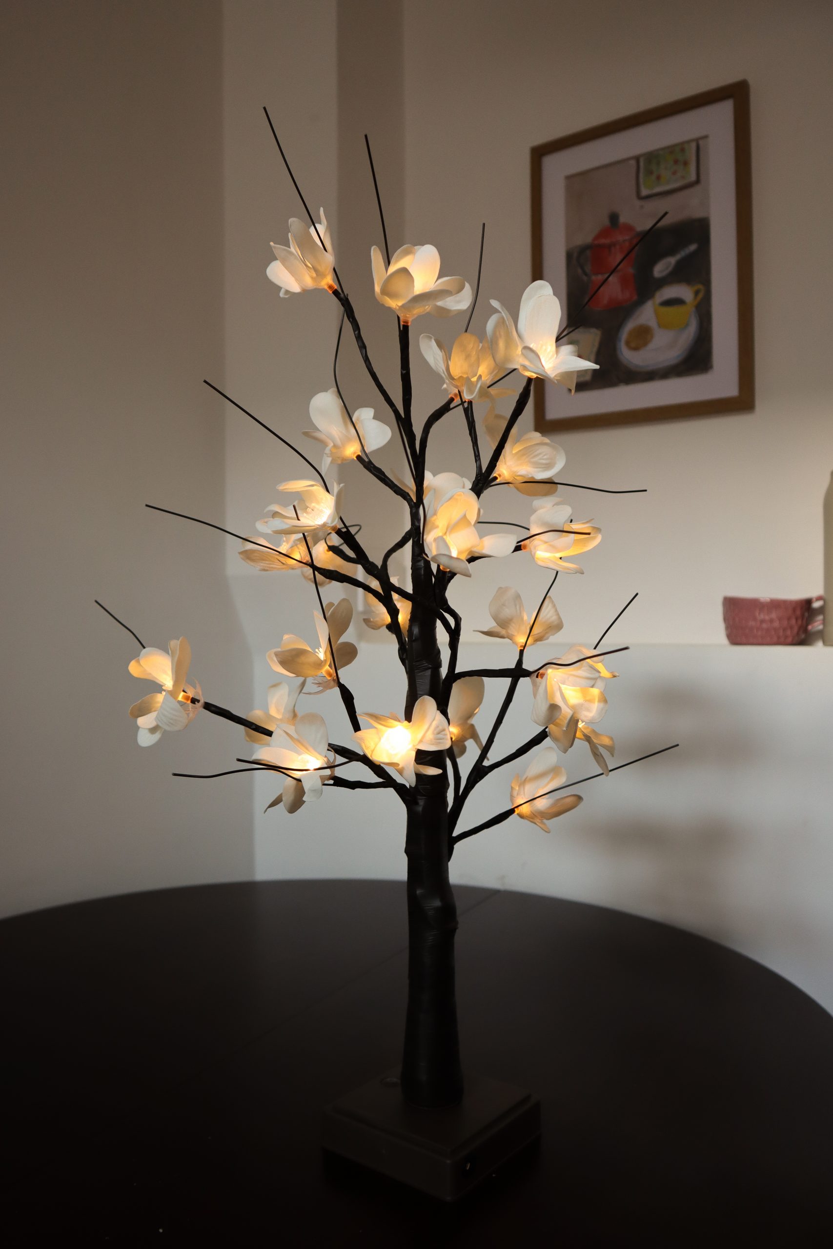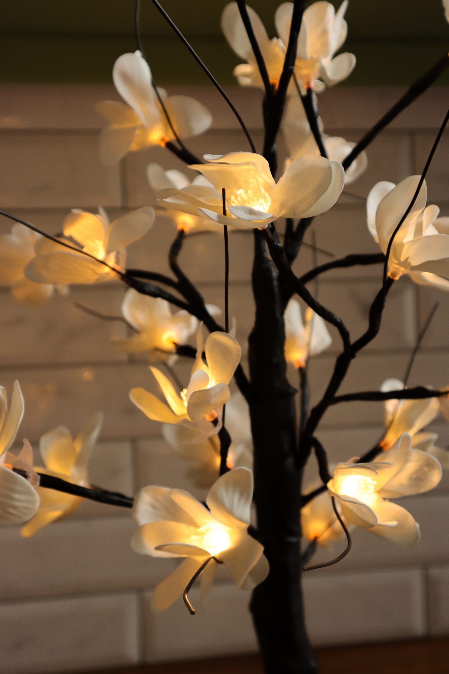 Дерево складається з чорного стовбуру та довгих витончених гілочок, на яких розміщені ніжні білі квіточки. Реалістичний зовнішній вигляд “Магнолії” у поєднанні з теплим світлом та висотою 60 см. зробить дерево яскравим акцентом будь-якої кімнати. Світлодіодні лампочки квітів не нагріваються та є повністю безпечними.