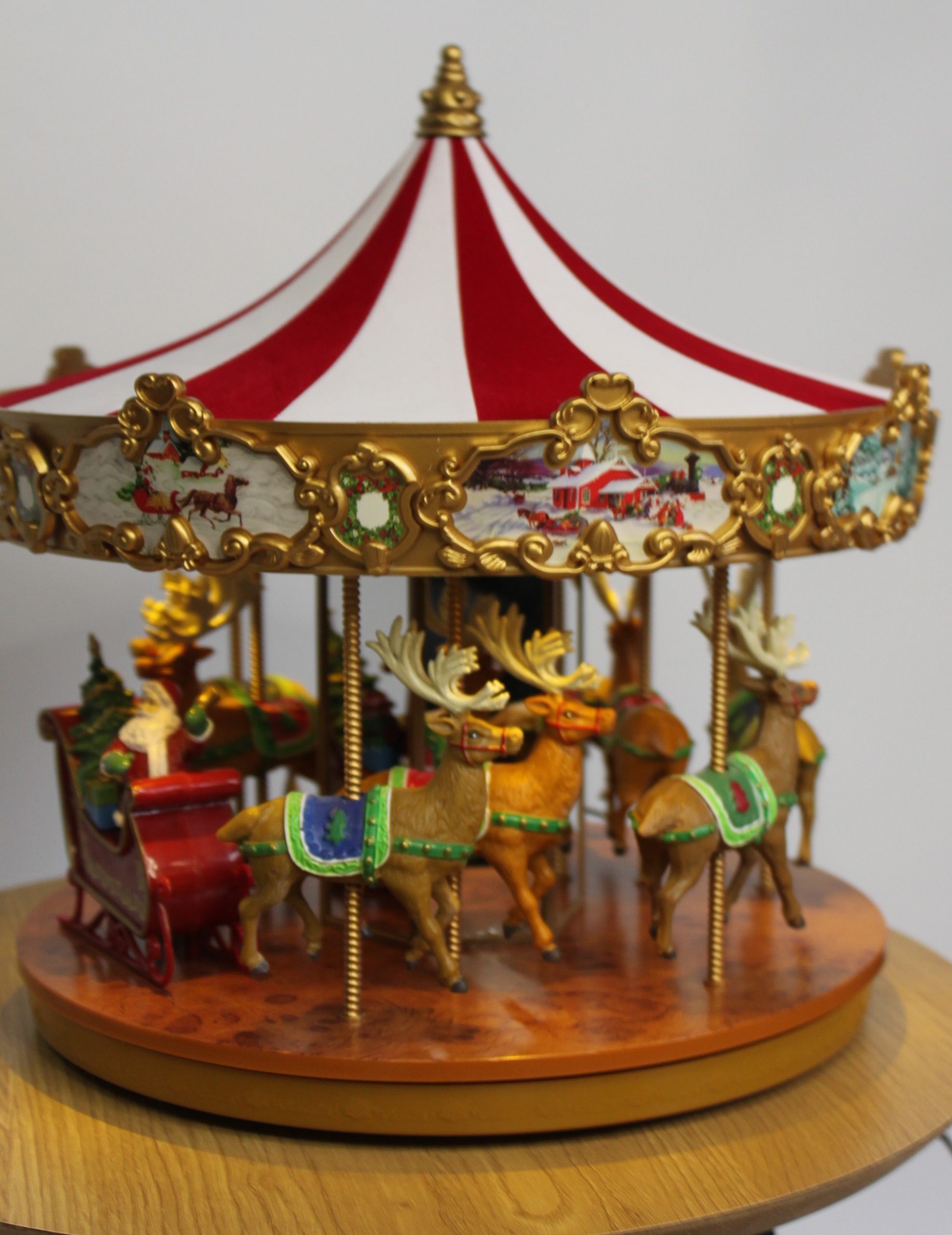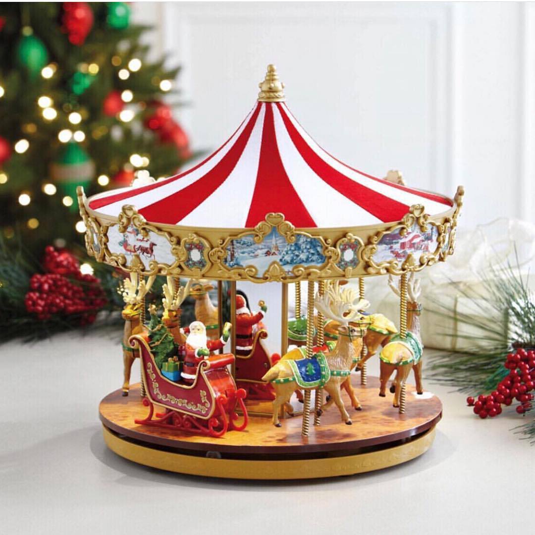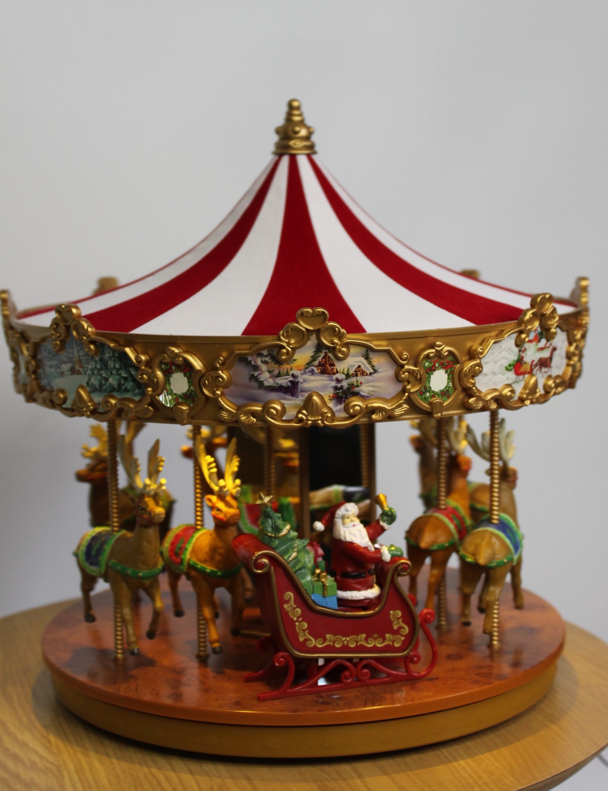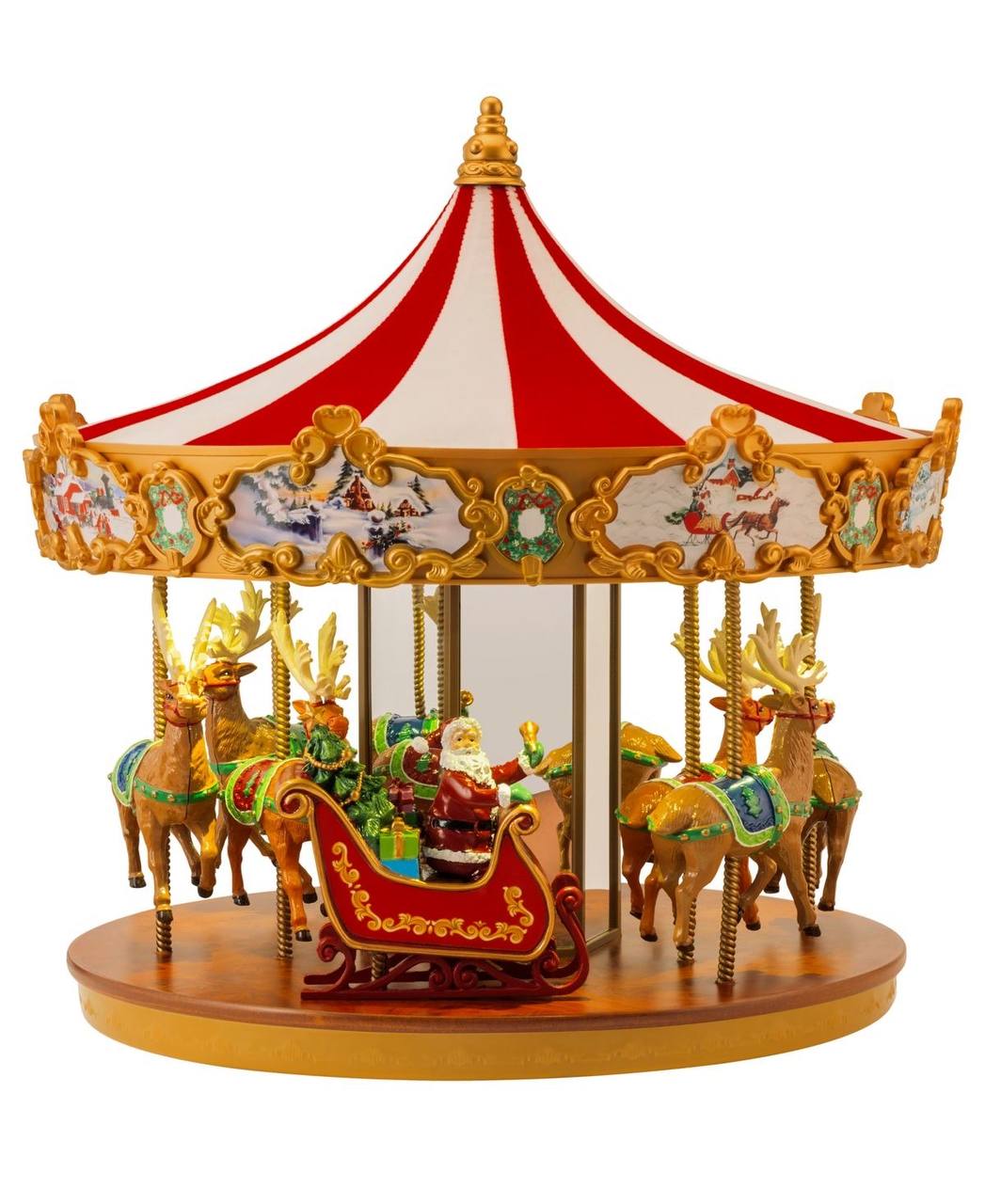 Карусель виконана в червоно-білих кольорах із золотим оздобленням. На каруселі представлені фігурки Санти, що везе ялинку та подарунки на колісниці, а також 8 святкових оленів. Санта з оленями обертаються навколо каруселі, під сяйво теплого світла, що створює неймовірний чарівний ефект. Фігури – барвисті та деталізовані, основа каруселі – дзеркальна, а купол доповнюють мініатюри зимових пейзажів. 25 вбудованих атмосферних новорічних мелодій додають композиції особливого шарму.
